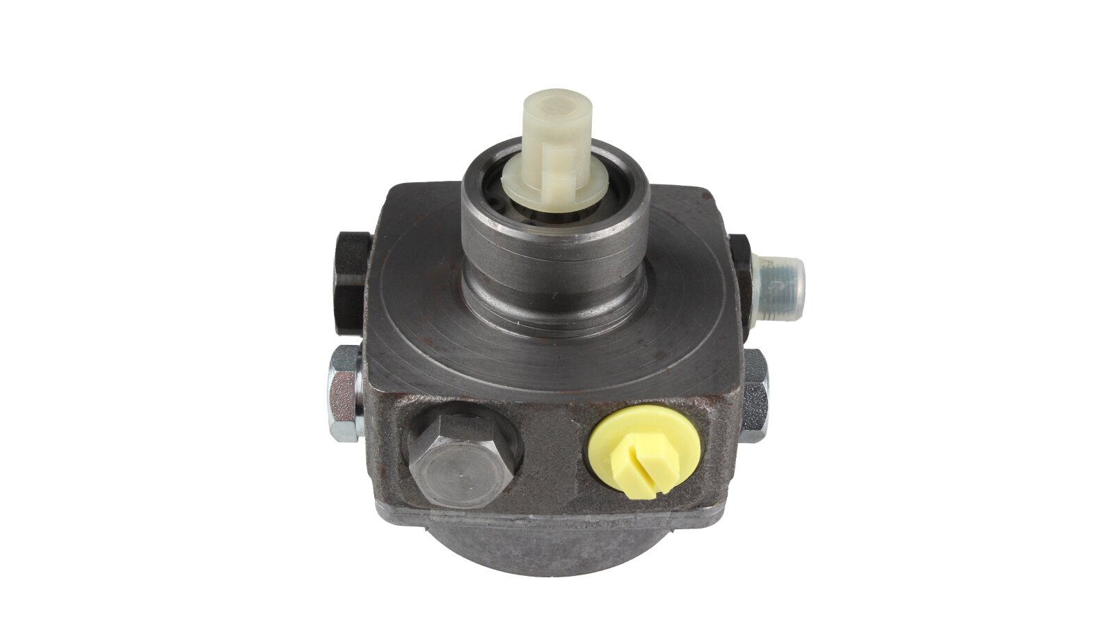 The pump operates on the movement of a gear mechanism. The shaft rotates clockwise.