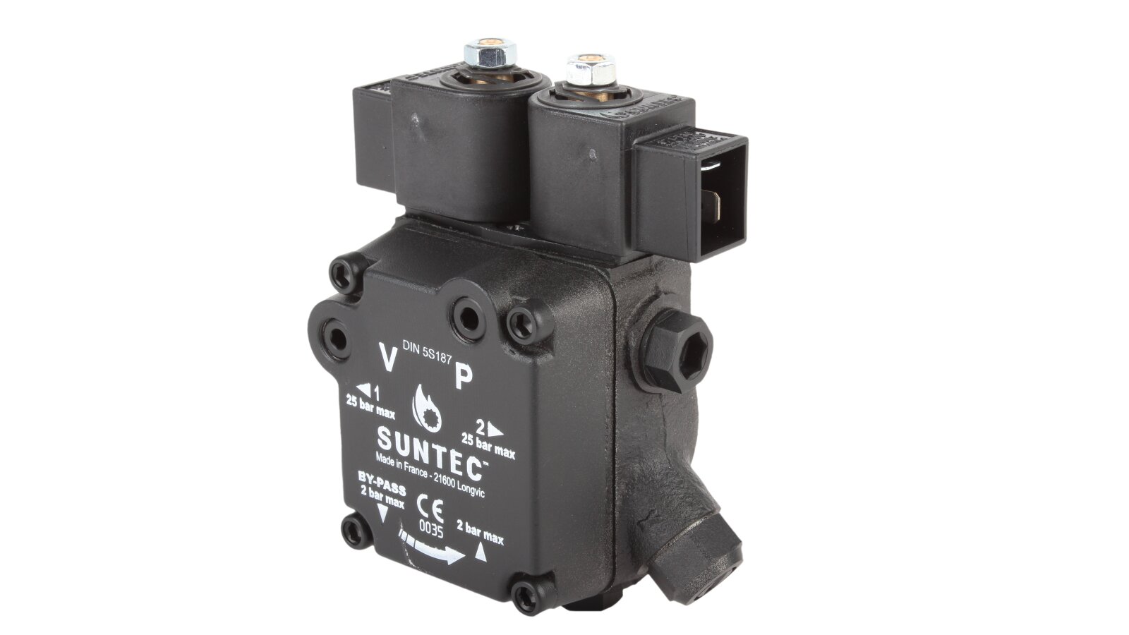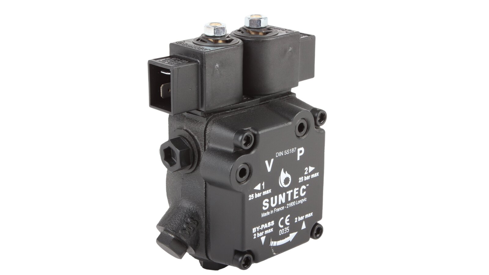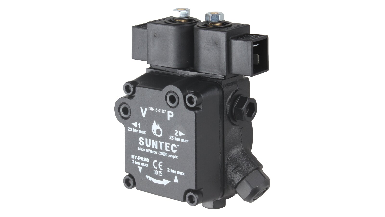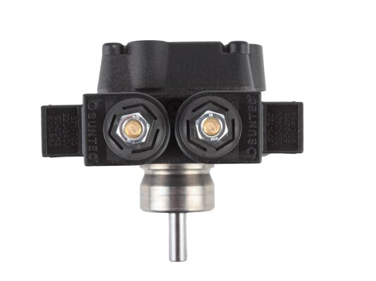 The high-performance gear pump Suntec A2L 65 A 9708 4P with a feed rate of 81 l/h is presented by the French concern. It is designed to pump diesel fuel simultaneously to two nozzle lines of burners. The unit is equipped with a pair of electromagnetic solenoids responsible for stopping the supply according to the set operating mode, as well as an adjustable slide valve. We offer to buy pumps for burners from the European manufacturer Suntec in the online store of the company "ANKAS".