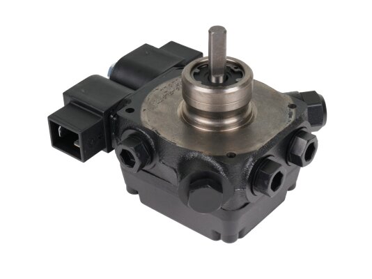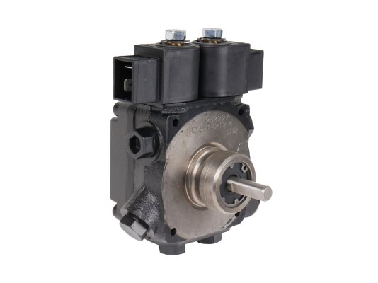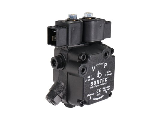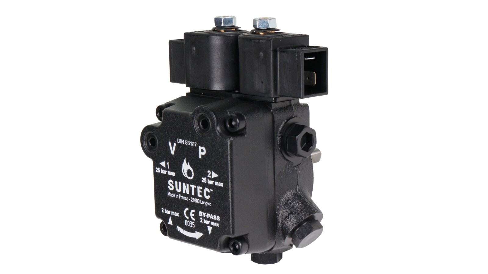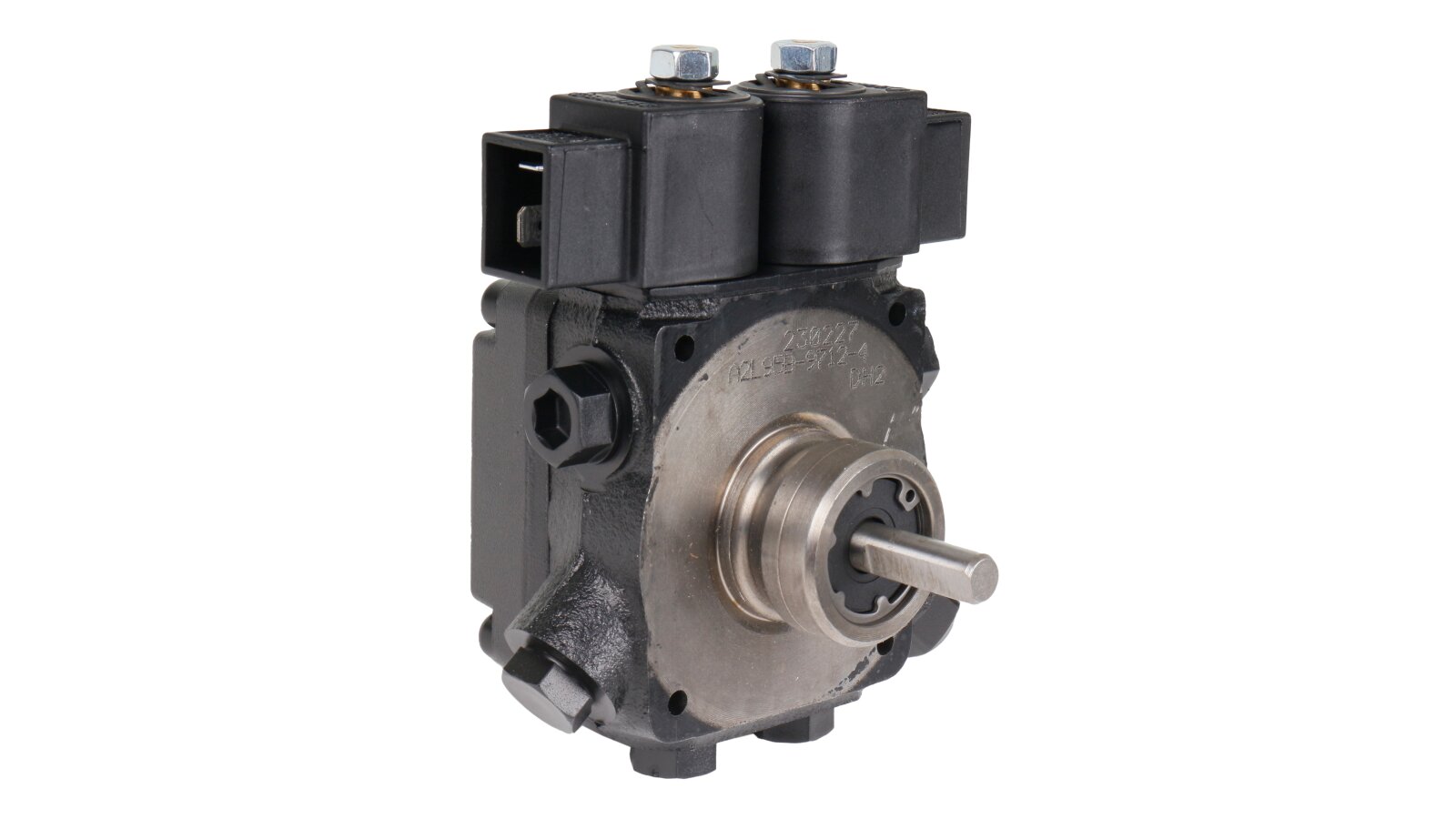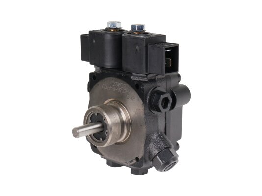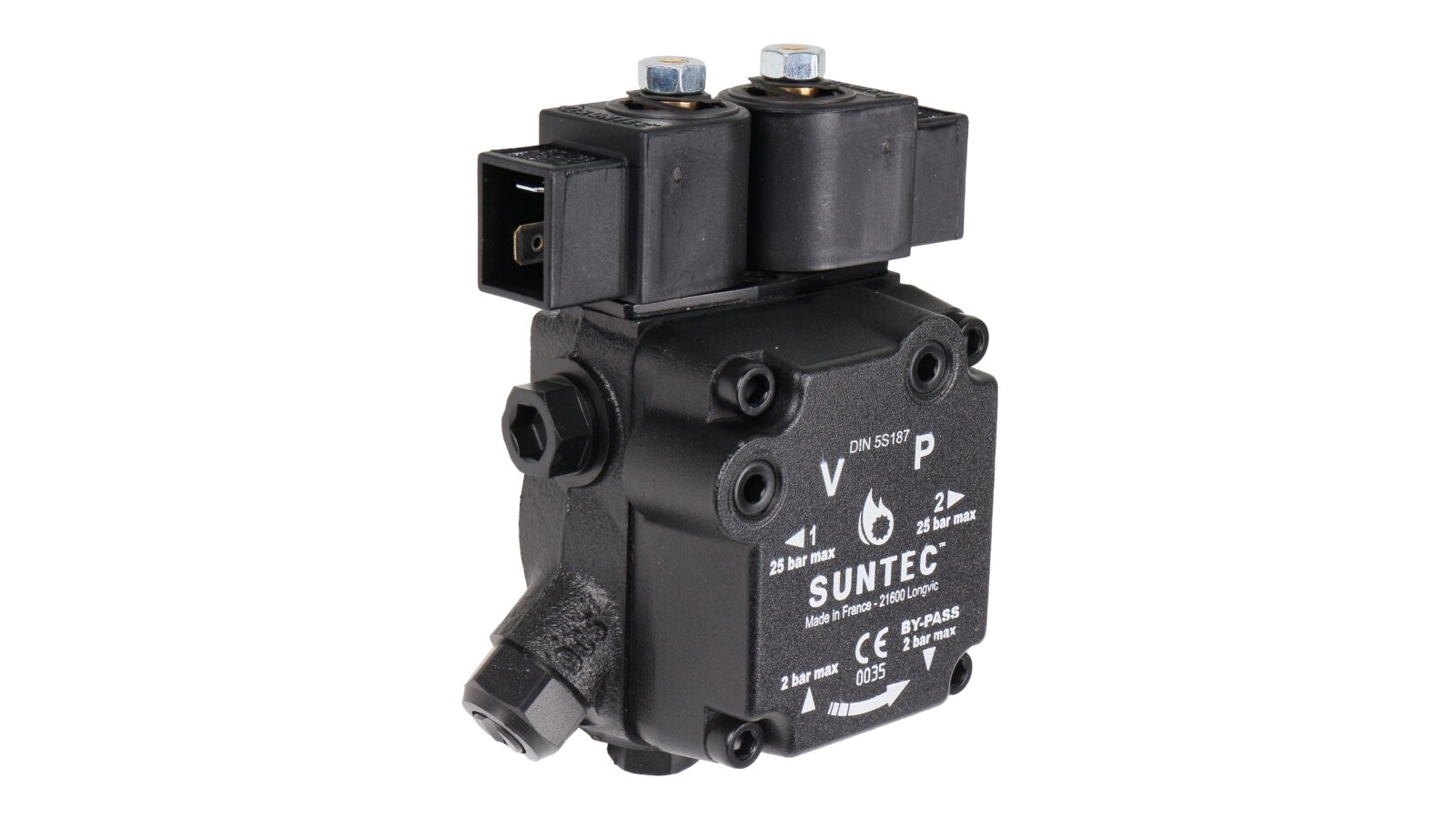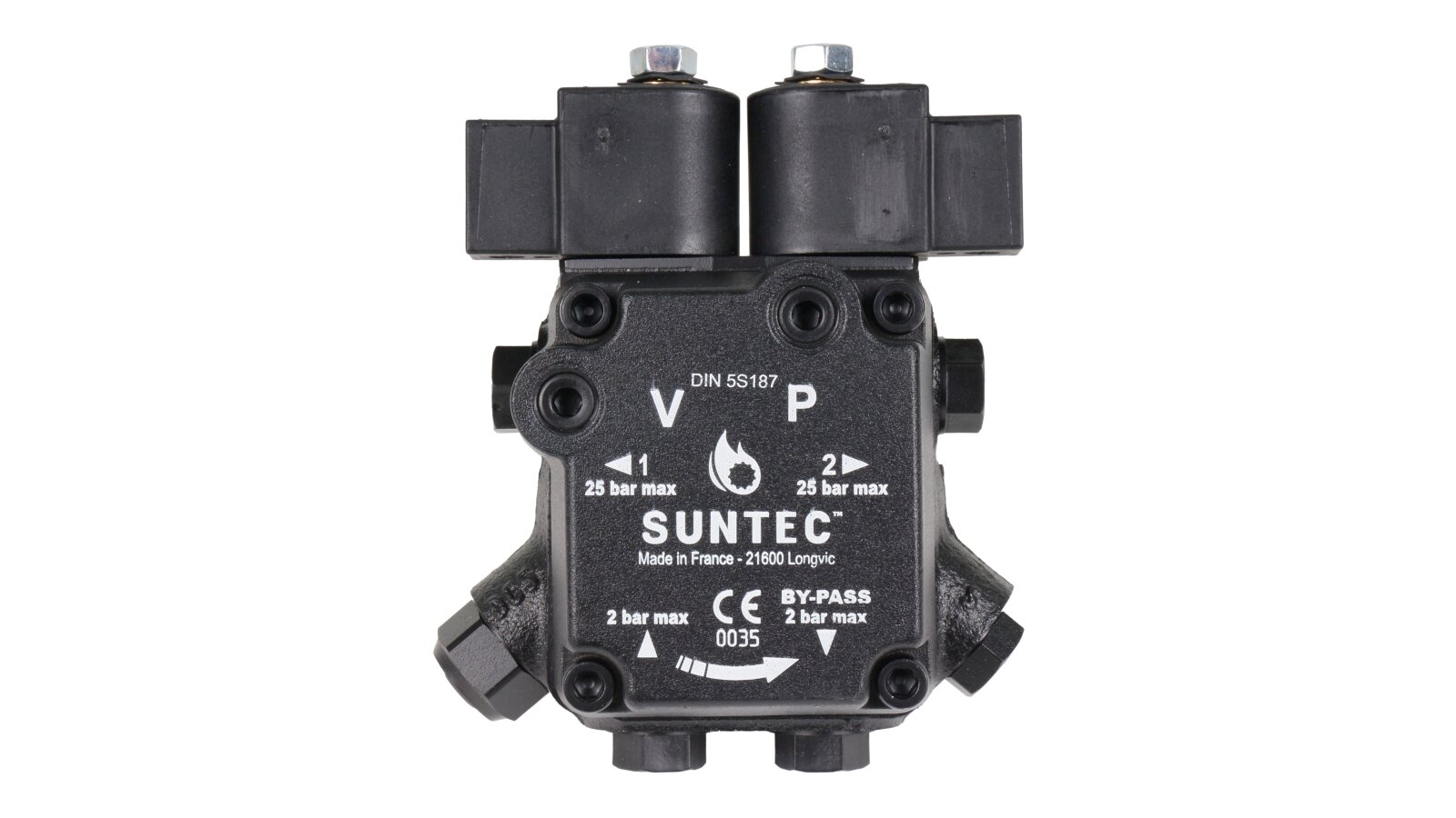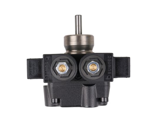 The Suntec A2L 95 B 9712 4P 0700 pump is designed to pump diesel fuel to two injectors at once. It is equipped with two electromagnetic valves with a flow interruption function for each outlet on the injector line. The performance depends on the pressure setting and the viscosity of the fuel.
