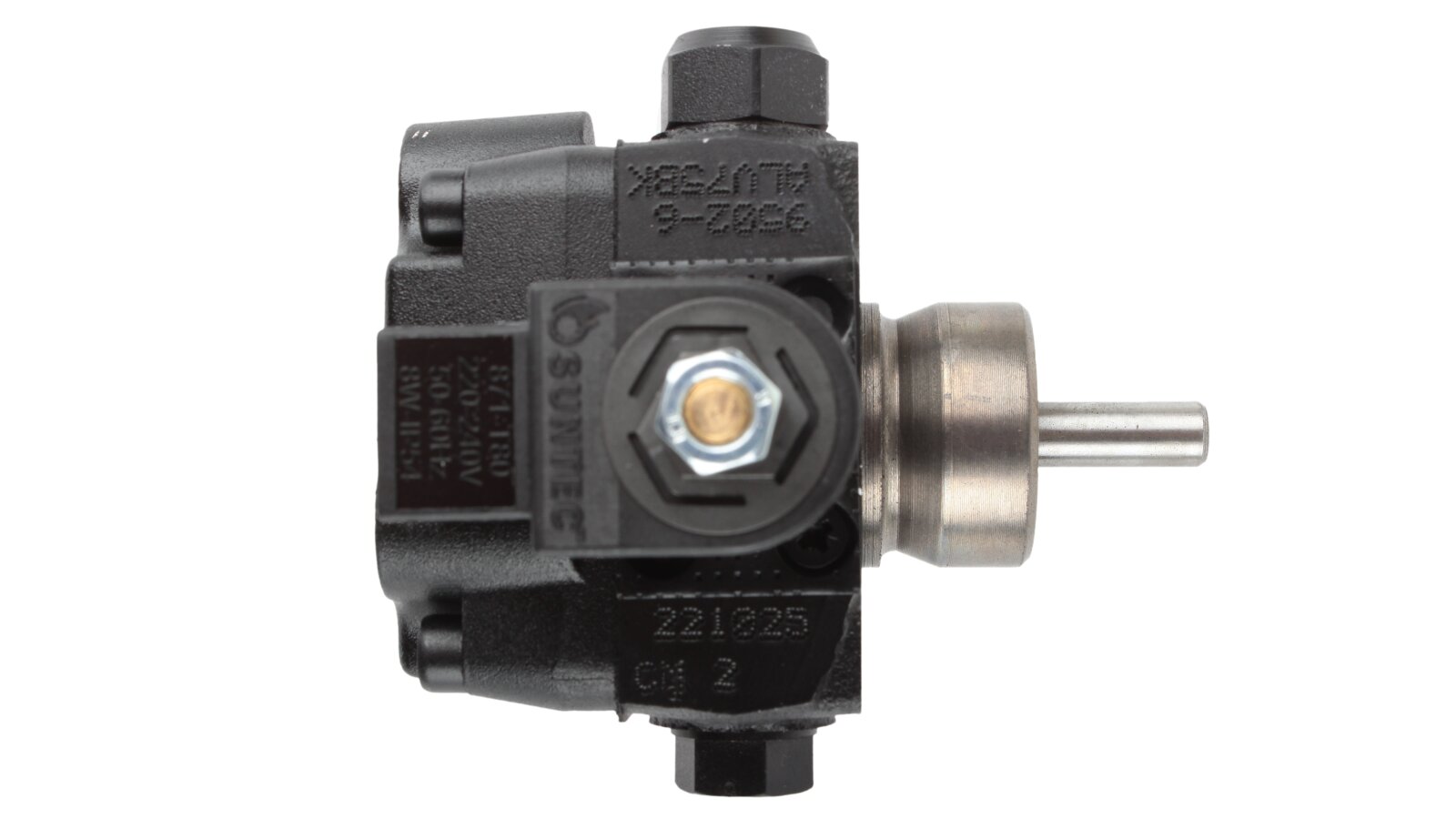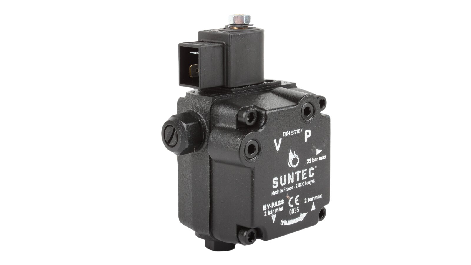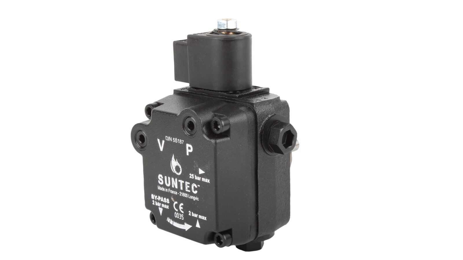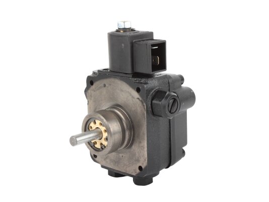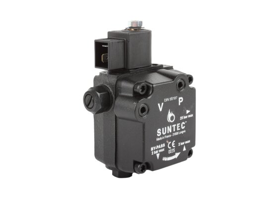 The Suntec AL V 75 B K 9502 5P 0700 pump is installed in burners consuming diesel fuel and kerosene. The design includes a blocking electromagnetic valve with a shut-off function.