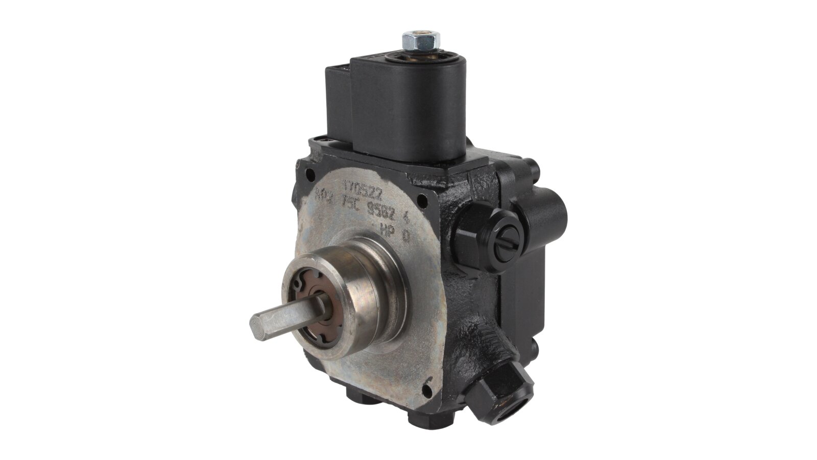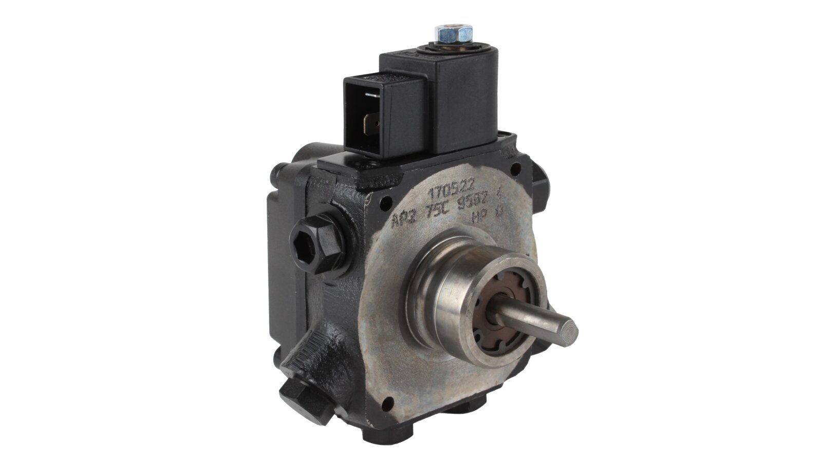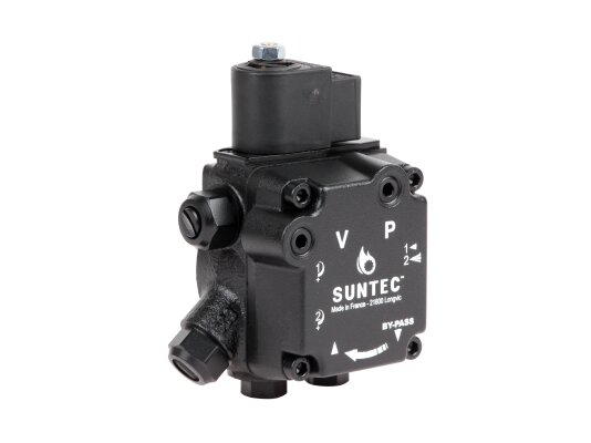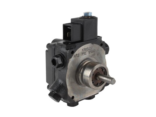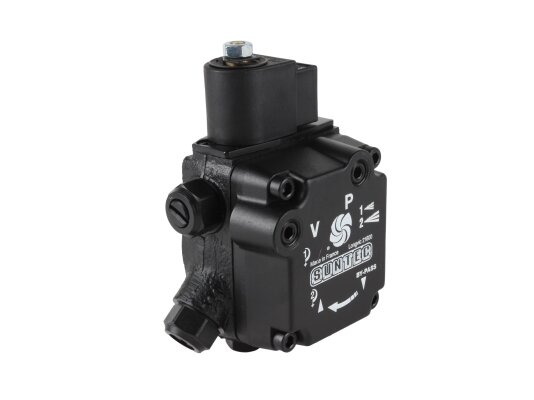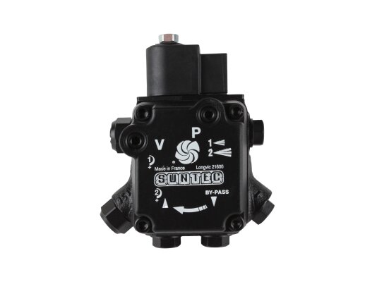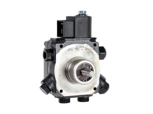 The diesel pump for the Suntec AP2 75 C 9562 4P 0700 burner has two pressure modes. There is no locking function. The flow is cut off by a separate electromagnetic valve. The built-in electromagnetic valve is used to switch between pressure modes. The advantages are optimal performance with small dimensions, reliable electrical protection, a preliminary filter for cleaning the flow, a standard fit, and a durable design.