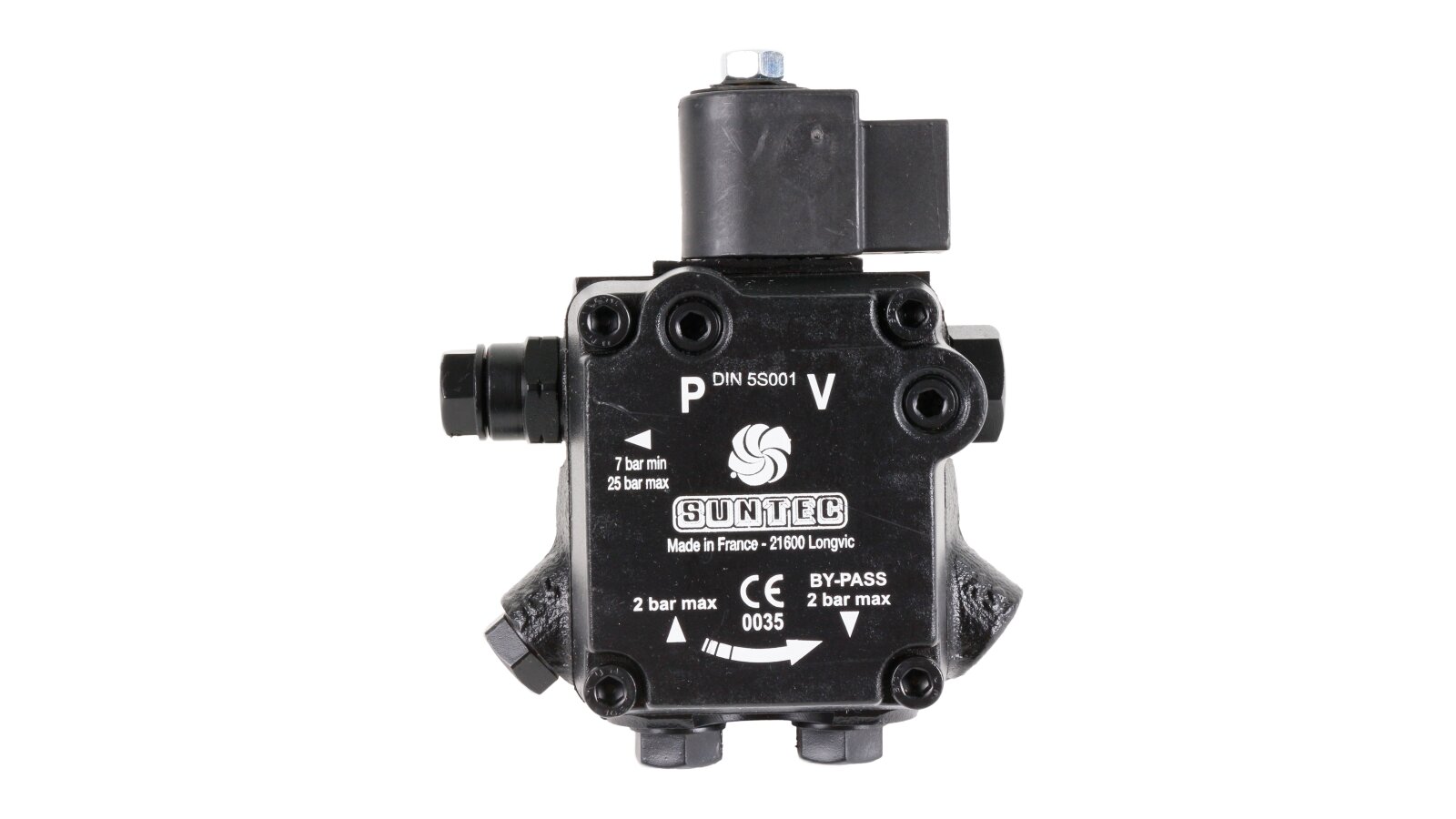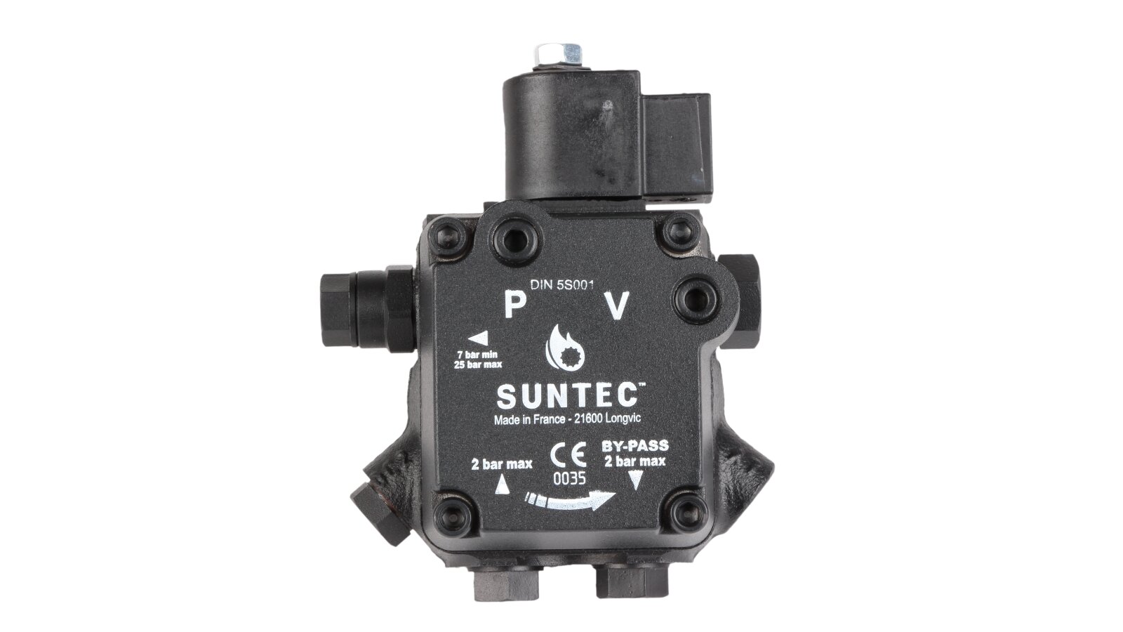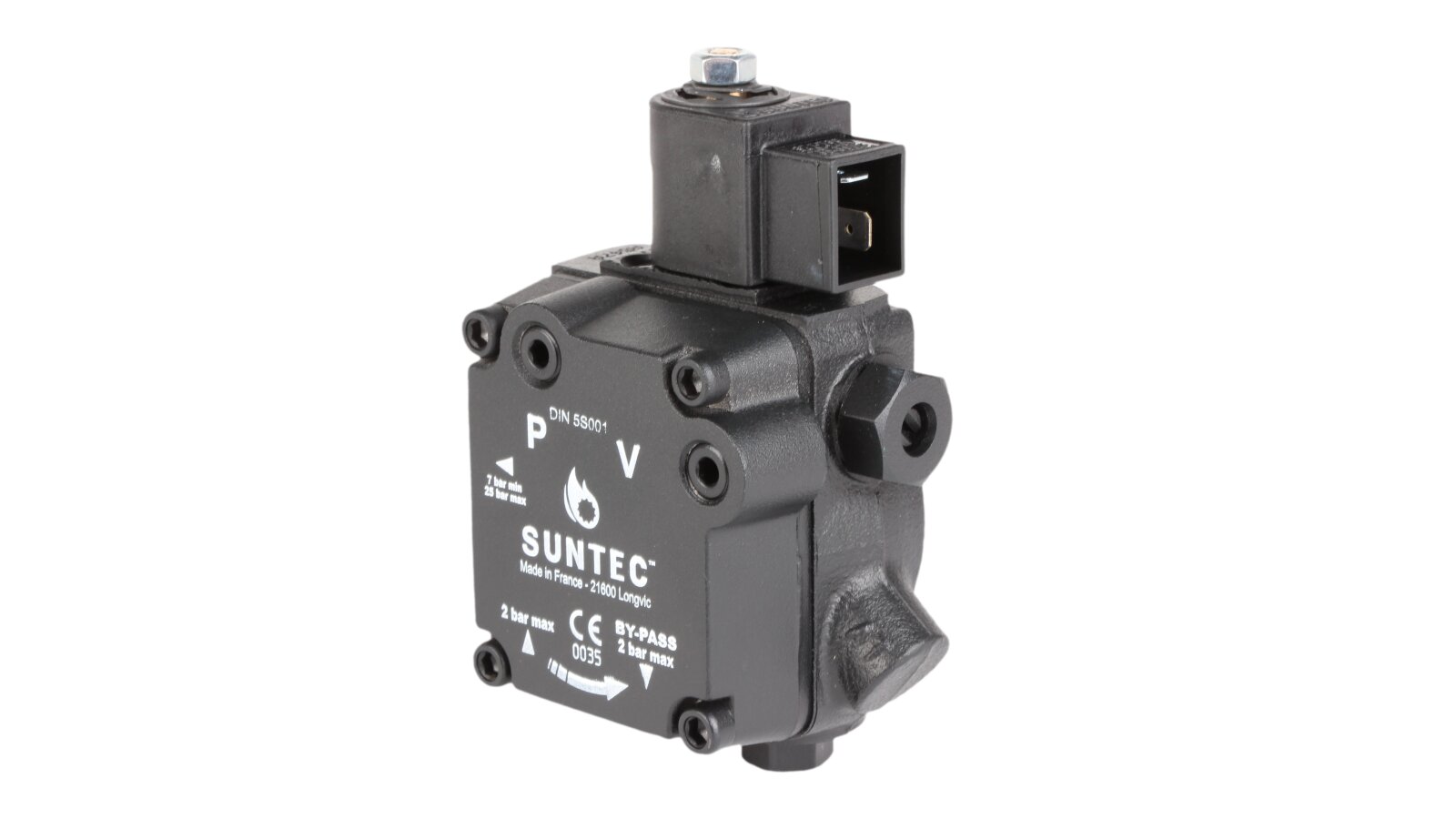 The electromagnetic valve closes the diesel fuel drain line. The Suntec pump is installed in one-pipe or two-pipe systems. When using a single-pipe system, remove the bypass plug and close the drain hole.