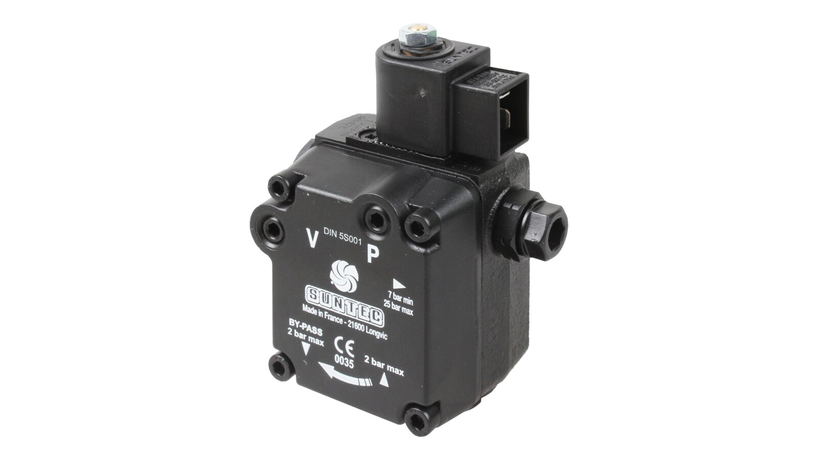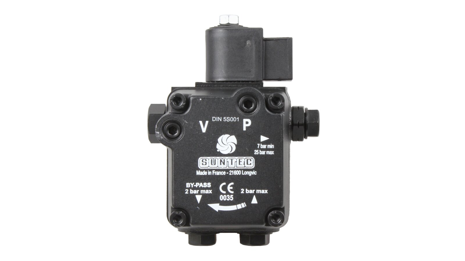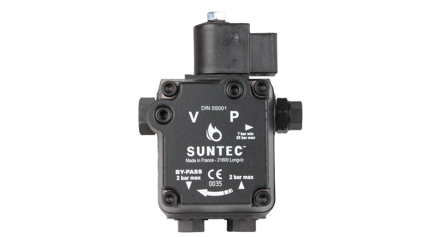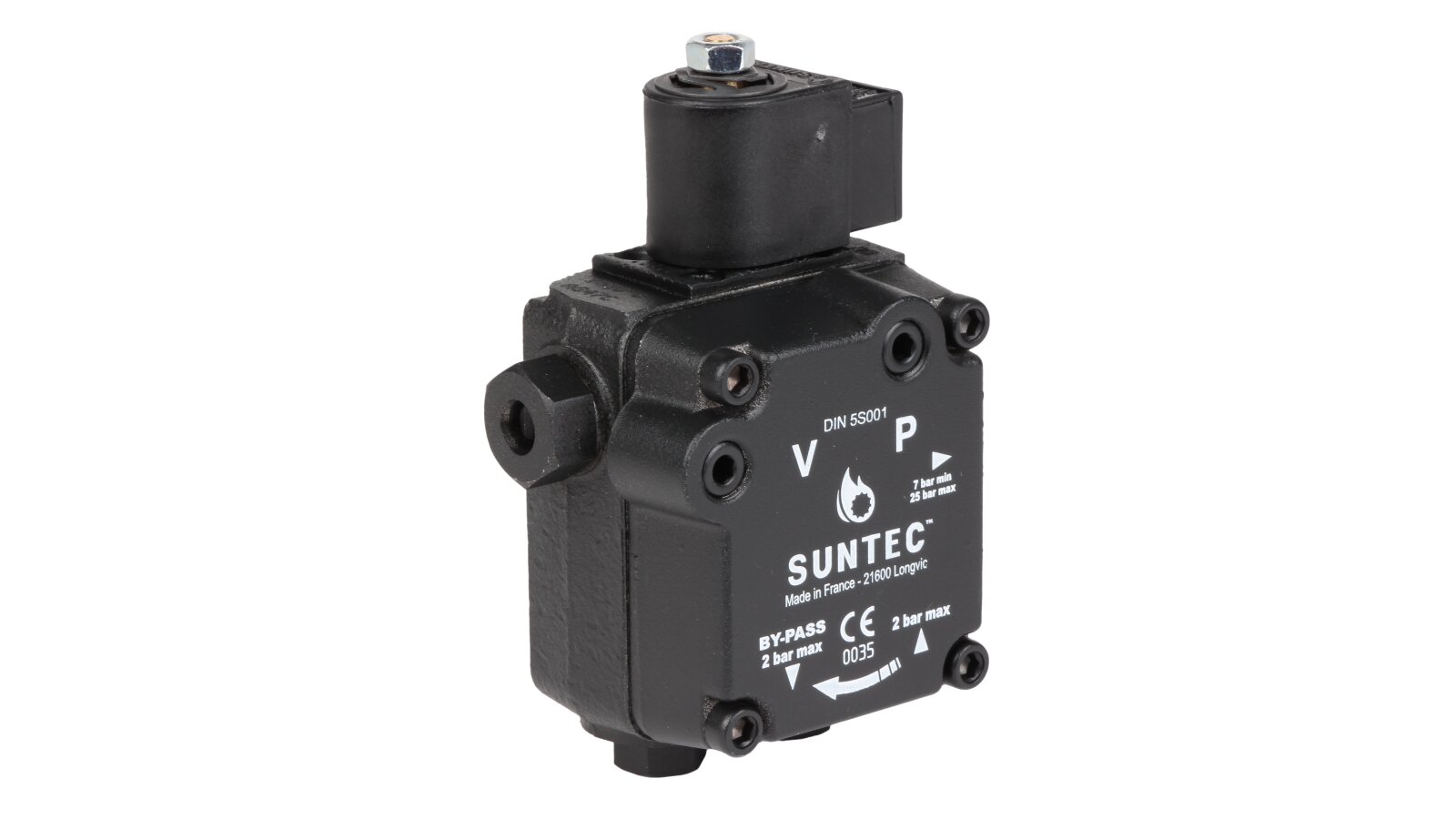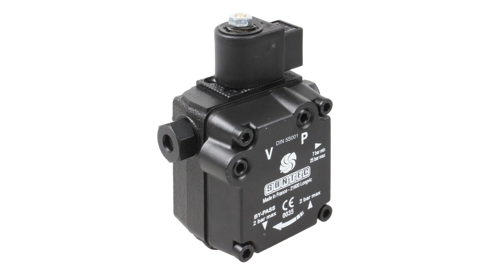 The European company producing fuel equipment Suntec presents the AS 47 C 1538 6P 0700 gear pump for burners. It is the junior model of the AS series with a counterclockwise shaft rotation direction. The device can pump diesel fuel with different kinematic viscosity and supply it to the injector line under pressure in the range of 7-14 atm. A distinctive feature of the unit is the presence of an electromagnetic valve with a shut-off function for controlling the feed, and a slide valve for adjusting the pressure.