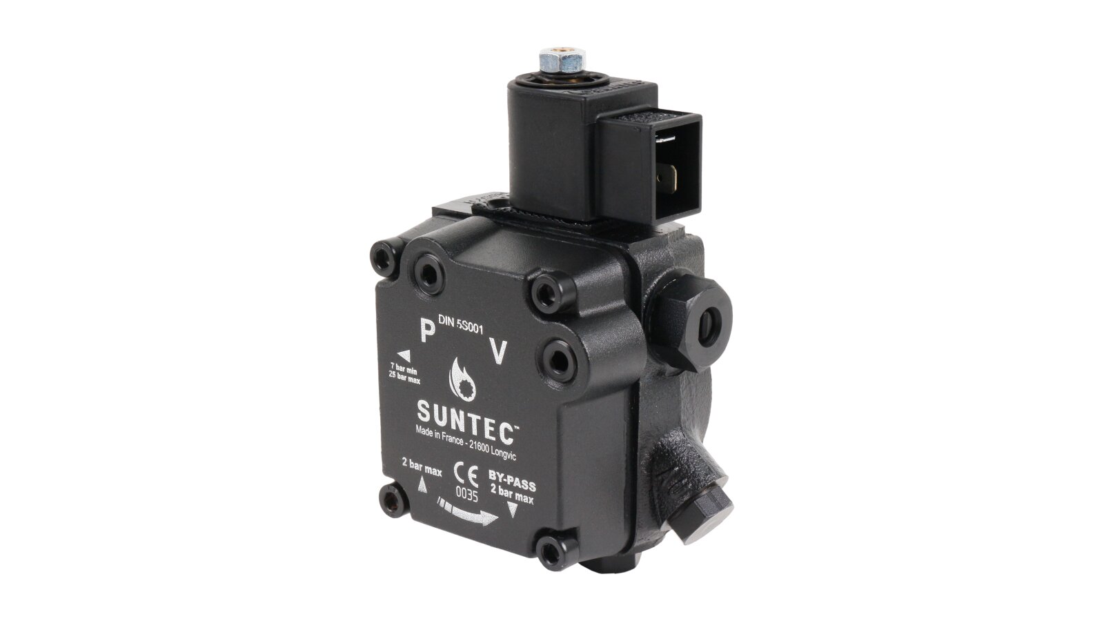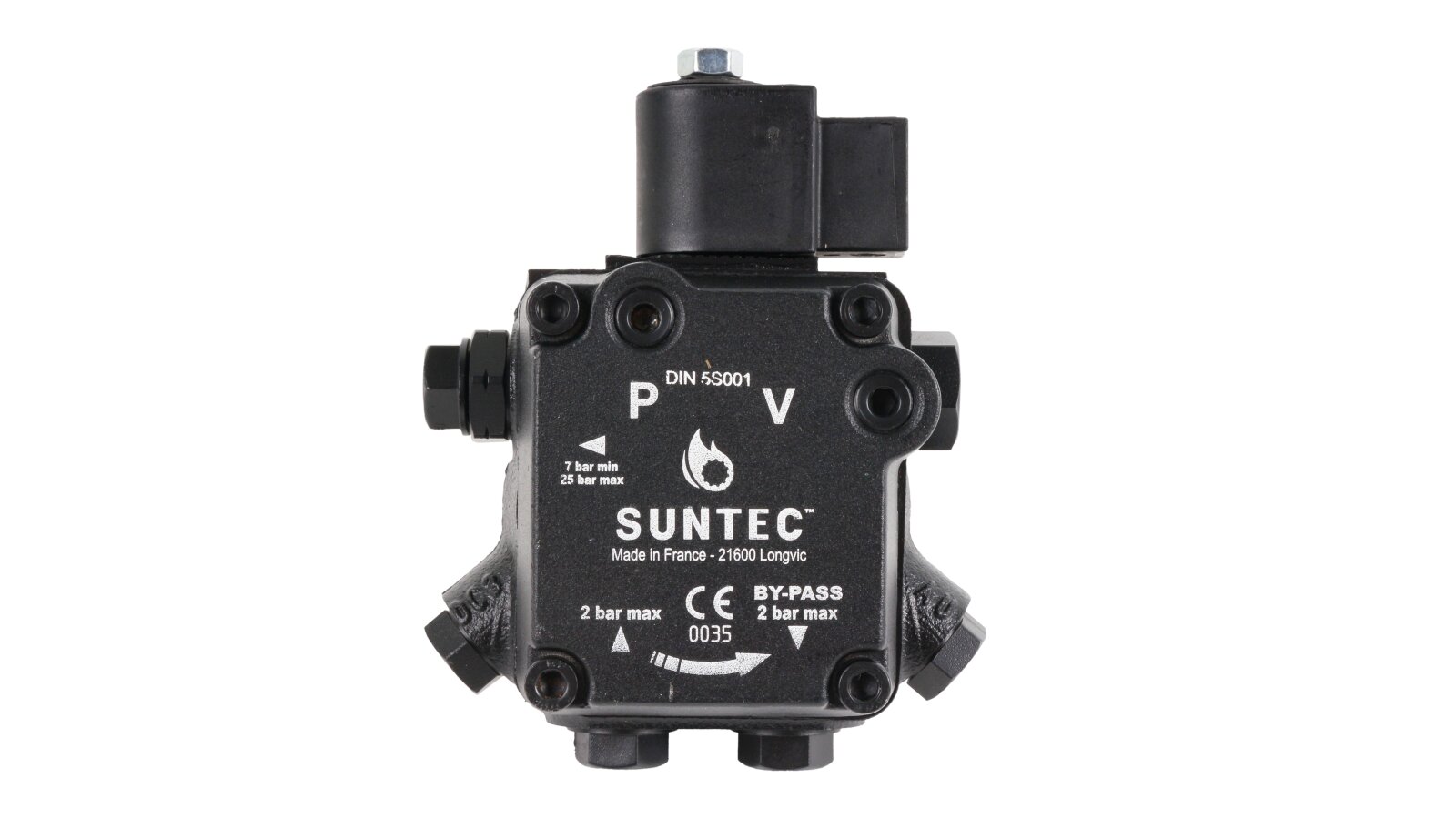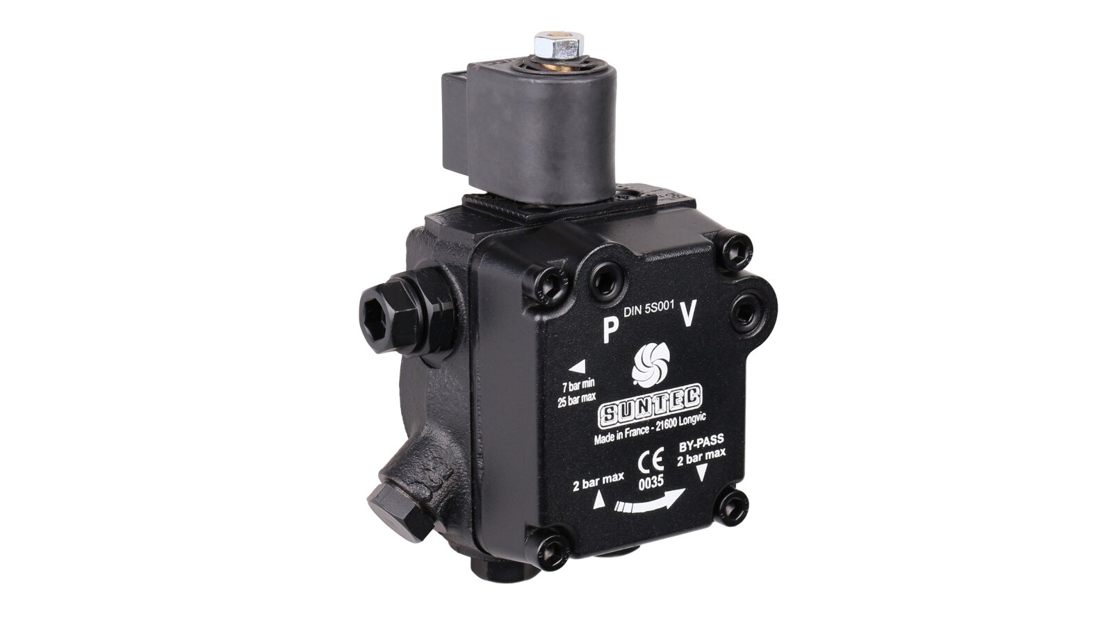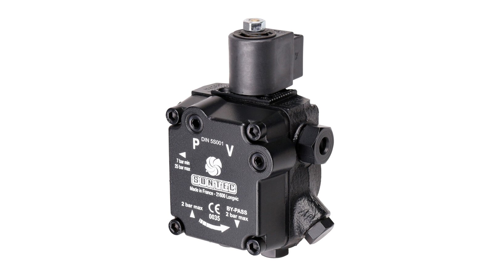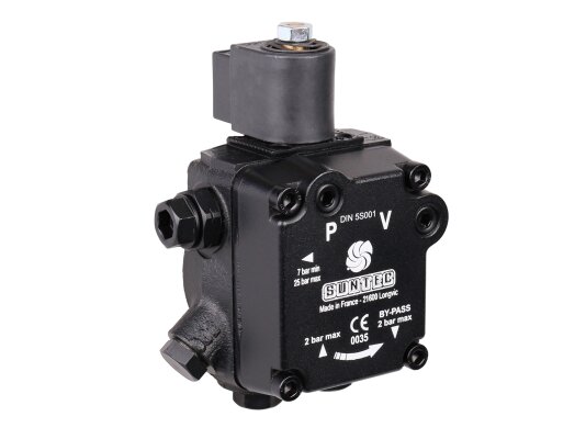 The AS 57 A 7591 4P 0700 model from the French fuel equipment developer Suntec features increased productivity and low energy consumption. The device is equipped with a bypass channel electromagnetic valve and an adjusting spool valve that sets the supply pressure parameter. When purchasing a fuel pump of the presented model, you should take into account the right-hand location of the outlet to the nozzle on the unit body, as well as the fact that the shaft rotates clockwise.