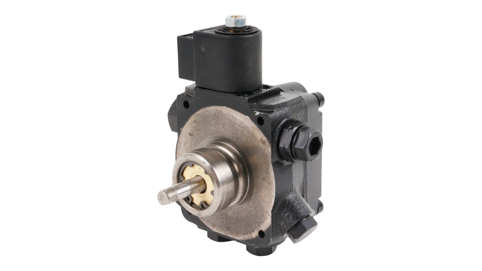 The working medium pressure is adjusted by tightening the screw on the valve. Its spring-loaded piston releases excess unclaimed fuel into the bypass line. The electromagnetic valve switches the pump to idle mode, communicating the feed channel and return line with each other.