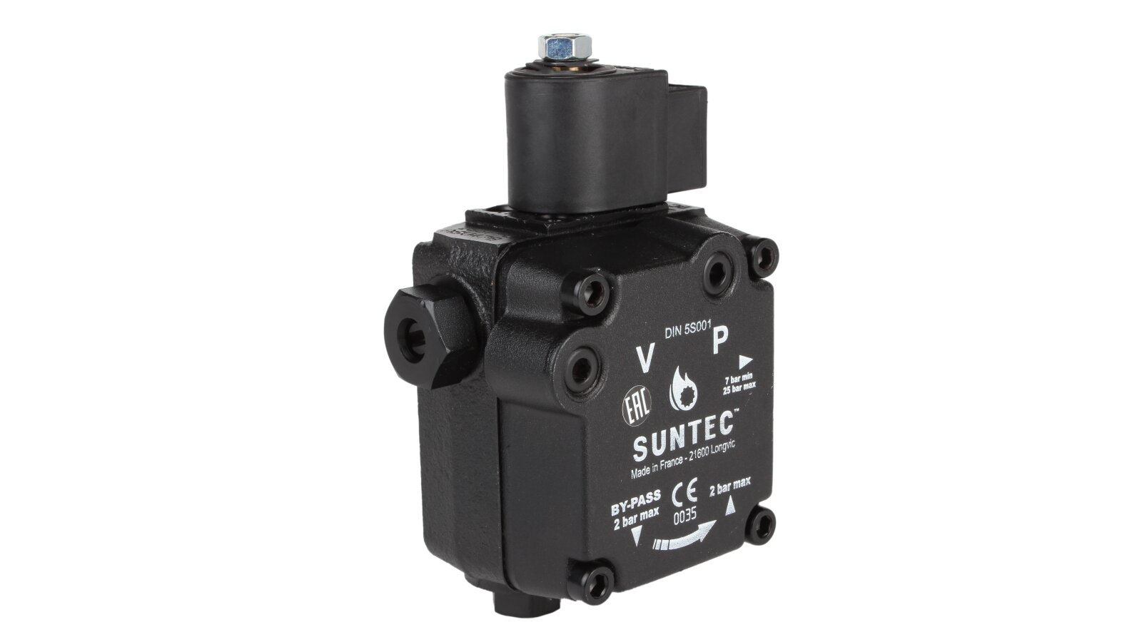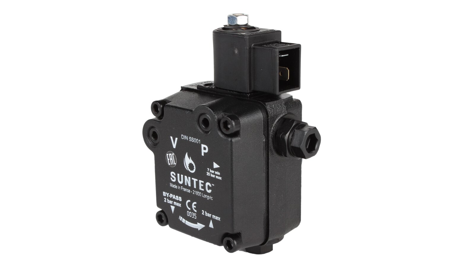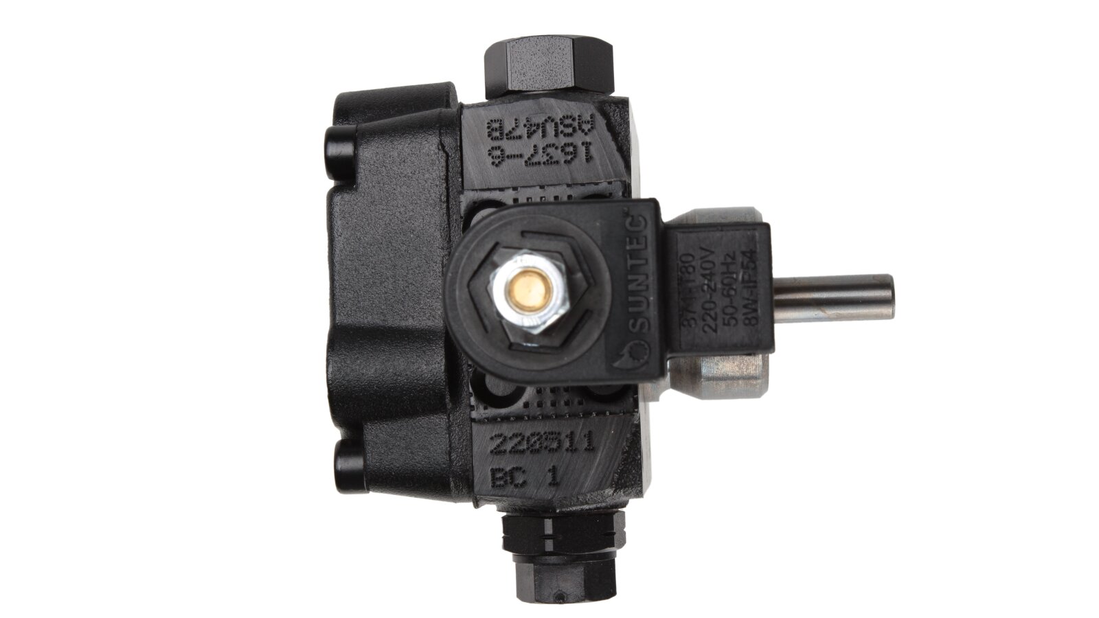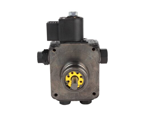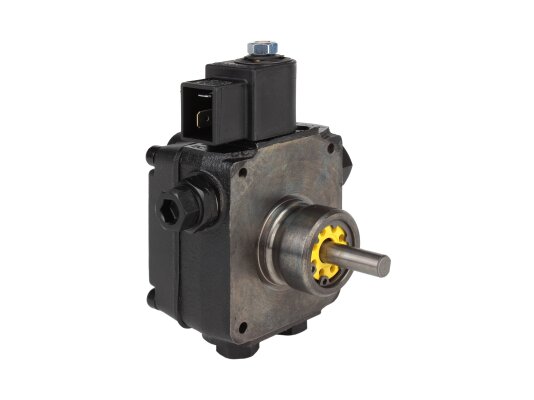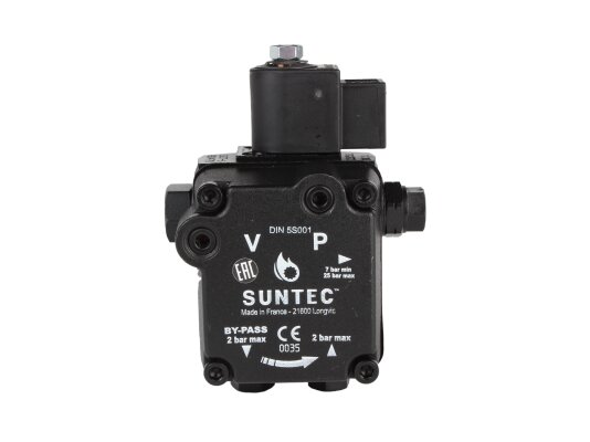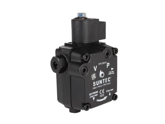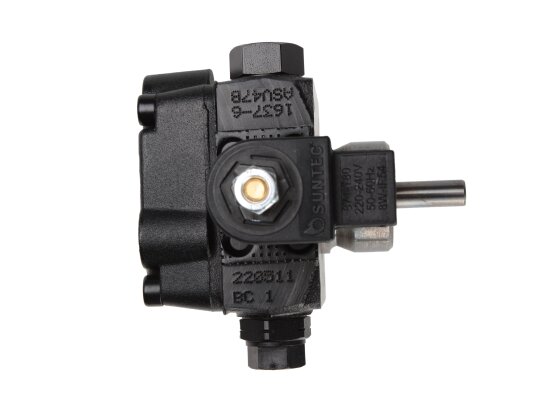 The Suntec AS V 47 B 1637 6P 0700 pump pumps diesel fuel and a mixture of biodiesel fuel B10. It is equipped with a built-in electromagnetic valve, which acts as a shut-off valve for quick interruption and resumption of fuel supply when operating at any speed.