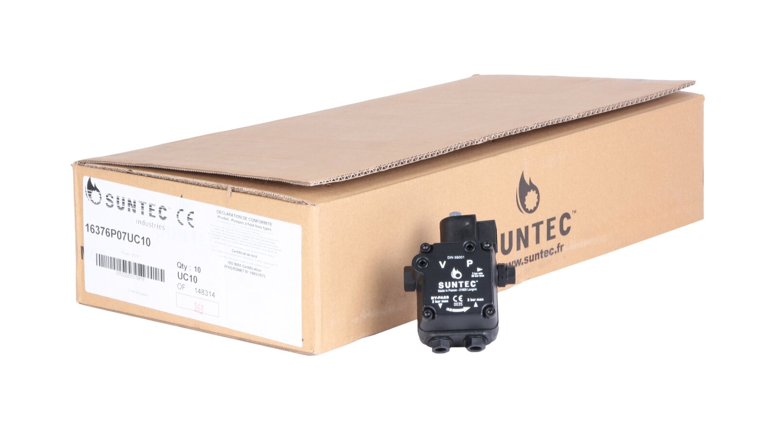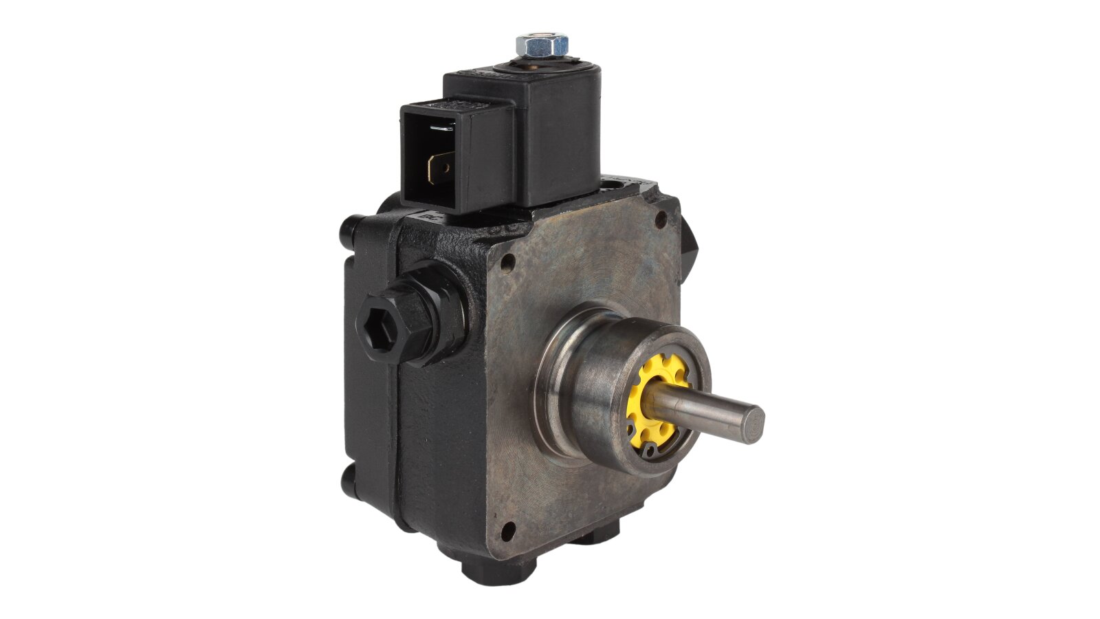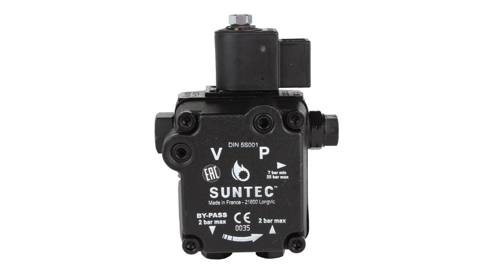 The Suntec AS V 47 B 1637 6P 0700 pump pumps diesel fuel and a mixture of biodiesel fuel B10. It is equipped with a built-in electromagnetic valve, which acts as a shut-off valve for quick interruption and resumption of fuel supply when operating at any speed.