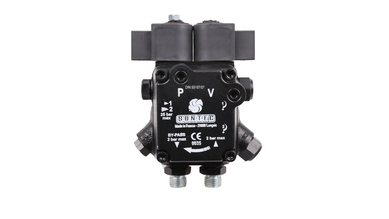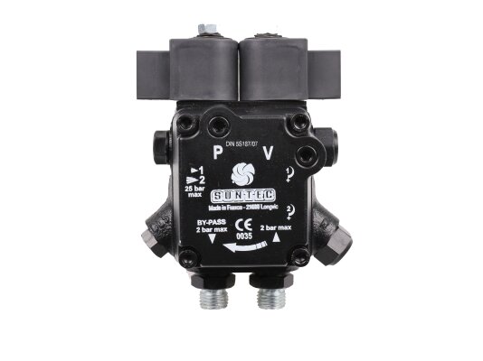 Among low-power liquid fuel pumps, the AT2 45 D 9513 4P 0700 model from the French company Suntec is in great demand. It is the junior representative of the AT series - two-mode devices with a switching and shut-off electromagnetic valve in the feed line. The outlet to the nozzle line is located on the right side of the body. The model with a capacity of 46 l / h is adapted for heating burners of such manufacturers as Lamborghini, Weishaupt, Elco, Baltur and others.