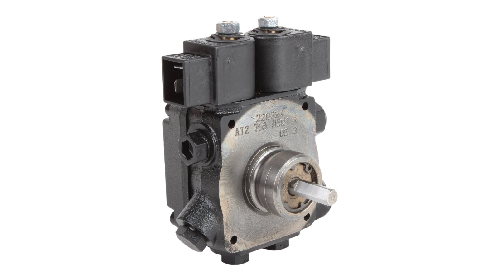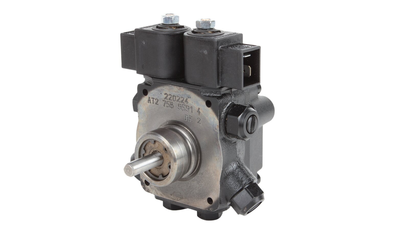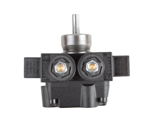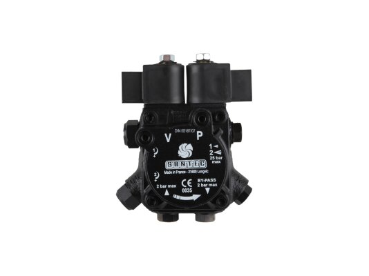 Among the gear pumps for burners with a capacity of up to 1000 kW, models that pump diesel fuel in two modes stand out. AT2 75 C 9591 4P 0700 is a device from this series, where the letters "AT" indicate the presence of two control electromagnetic valves plus a pair of shut-off valves. The number "75" in the name confirms its high productivity - 108 l / h while maintaining the same overall dimensions and weight as less powerful representatives of the line.