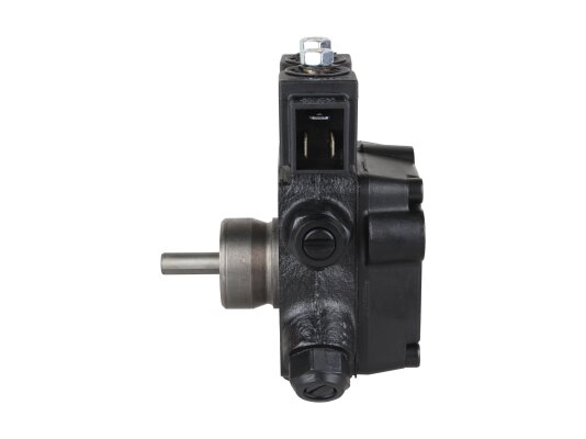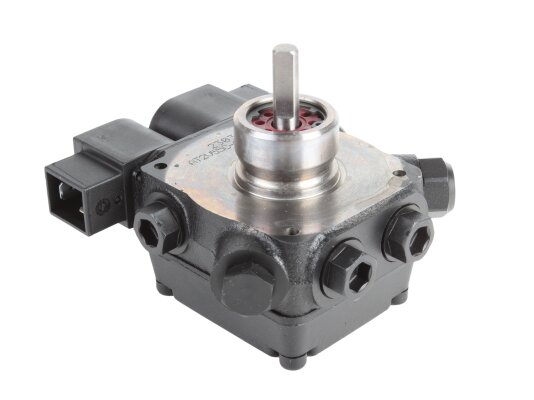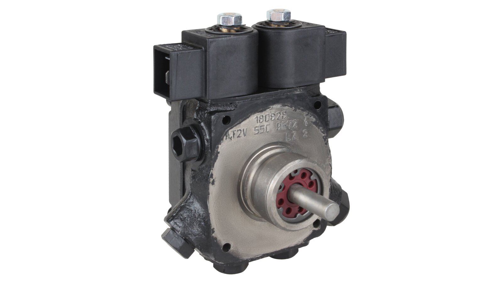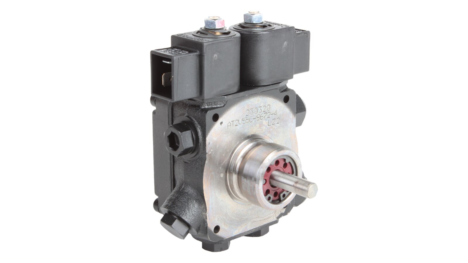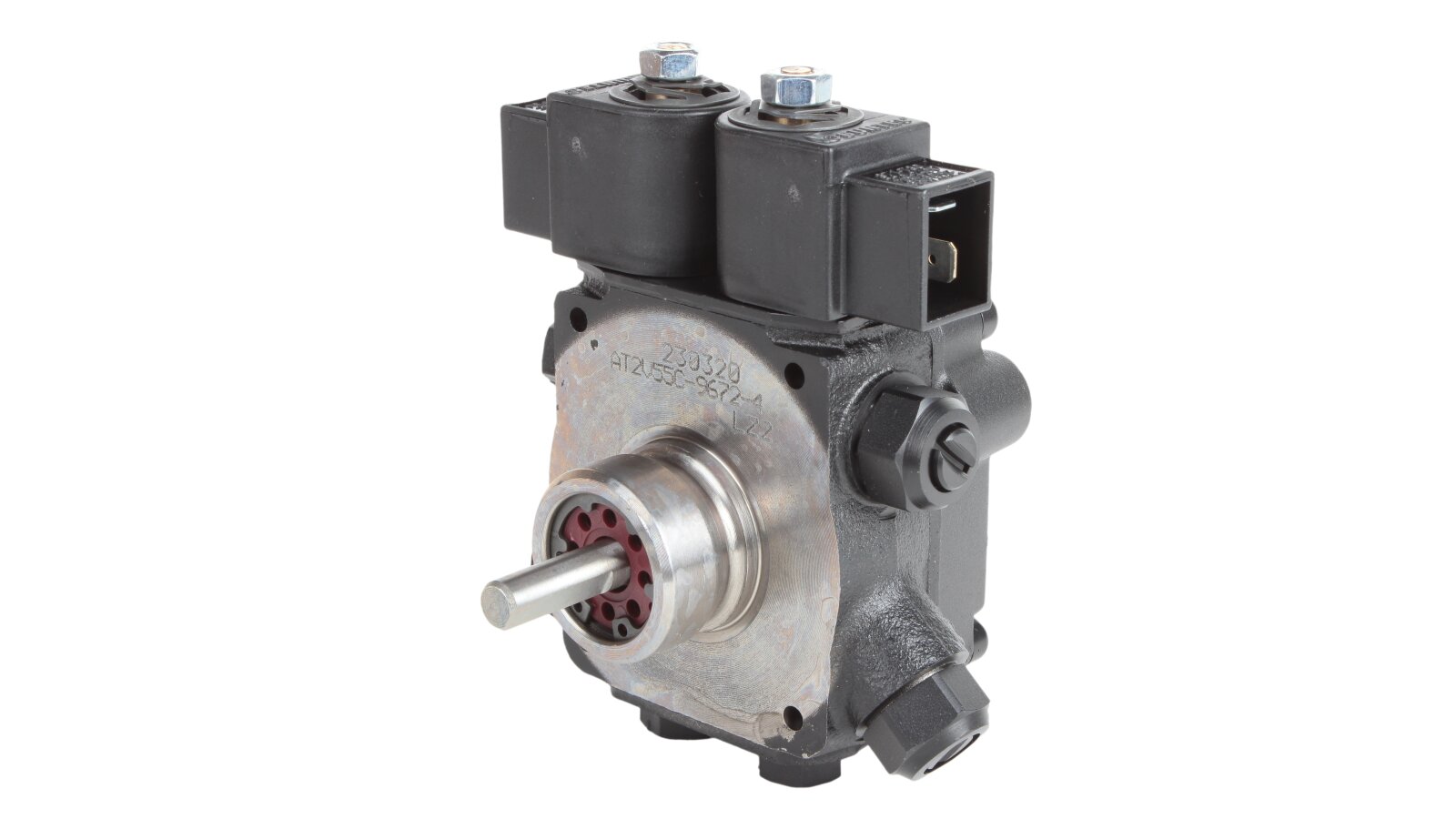 The AT2 V 55 C 9672 4P 0700 gear-type fuel pump, developed by the European company SANTEK, belongs to the variety of two-stage models with one outlet to the injector line on the left side. To control the modes and pressure of the supplied liquid, it is equipped with slide and electromagnetic valves. The necessary settings can be made without stopping the work process.