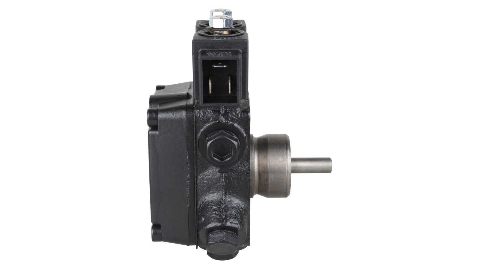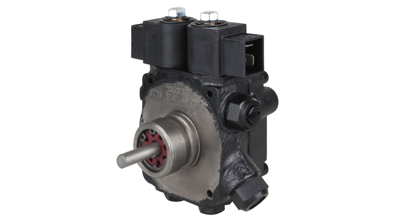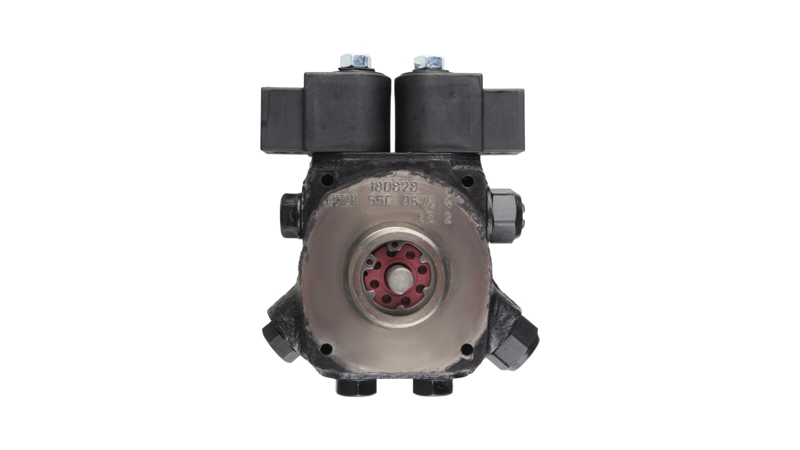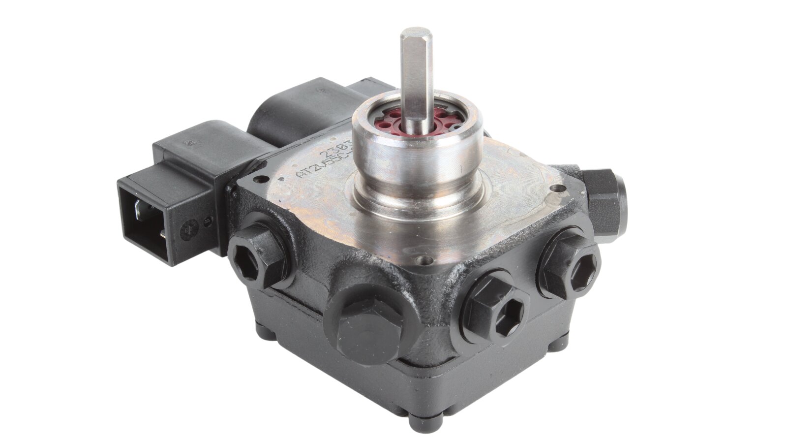 The AT2 V 55 C 9672 4P 0700 gear-type fuel pump, developed by the European company SANTEK, belongs to the variety of two-stage models with one outlet to the injector line on the left side. To control the modes and pressure of the supplied liquid, it is equipped with slide and electromagnetic valves. The necessary settings can be made without stopping the work process.