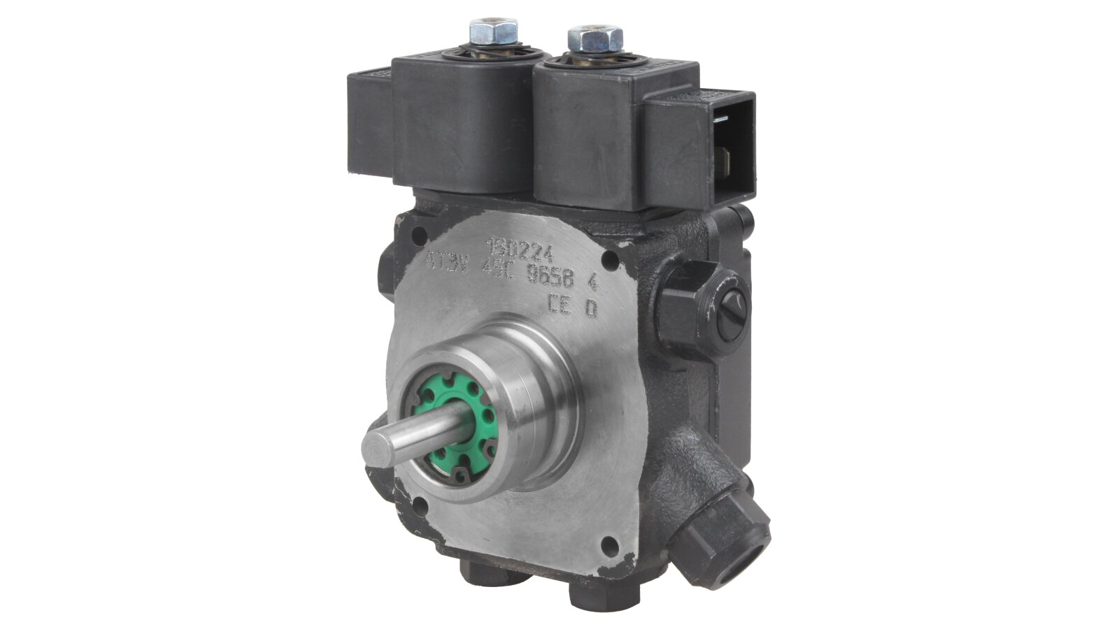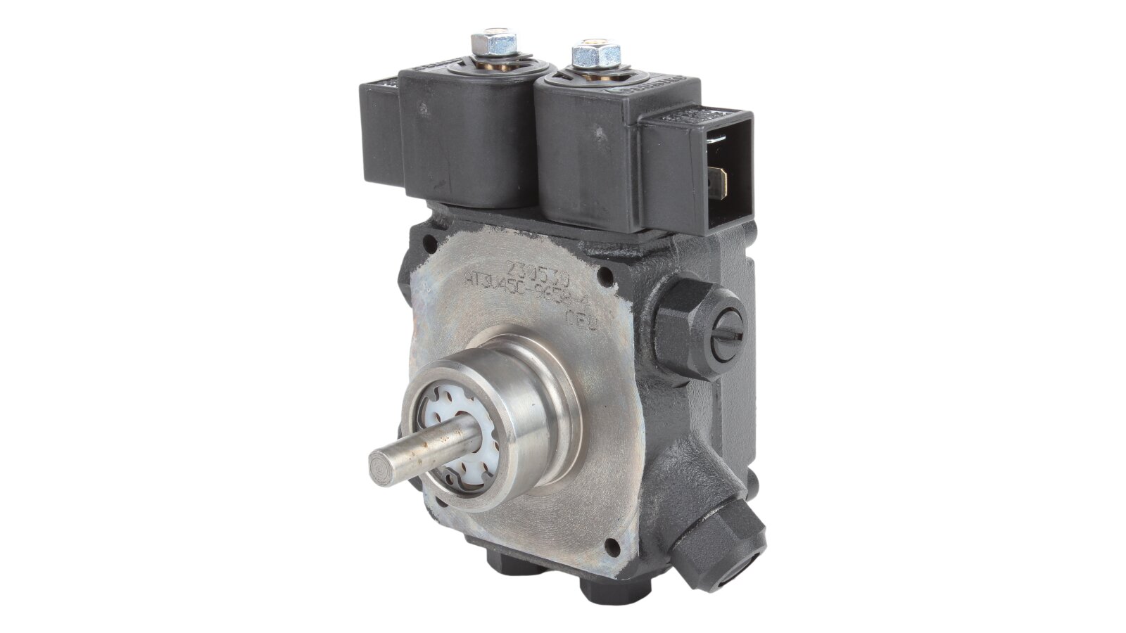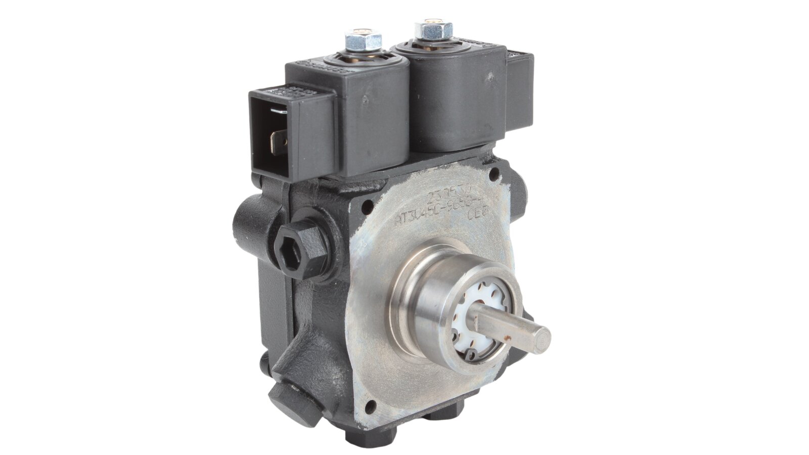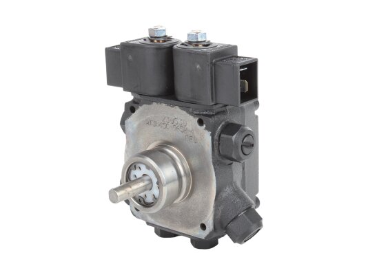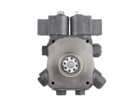 The dual-mode liquid fuel pump AT3 V 45 C 9658 4P 0700 is equipped with two electromagnetic valves with a locking function. The design has a special connection hole on the cover for connecting a pressure gauge that determines the pressure in the nozzle in high-pressure mode and discharge in low-pressure mode.