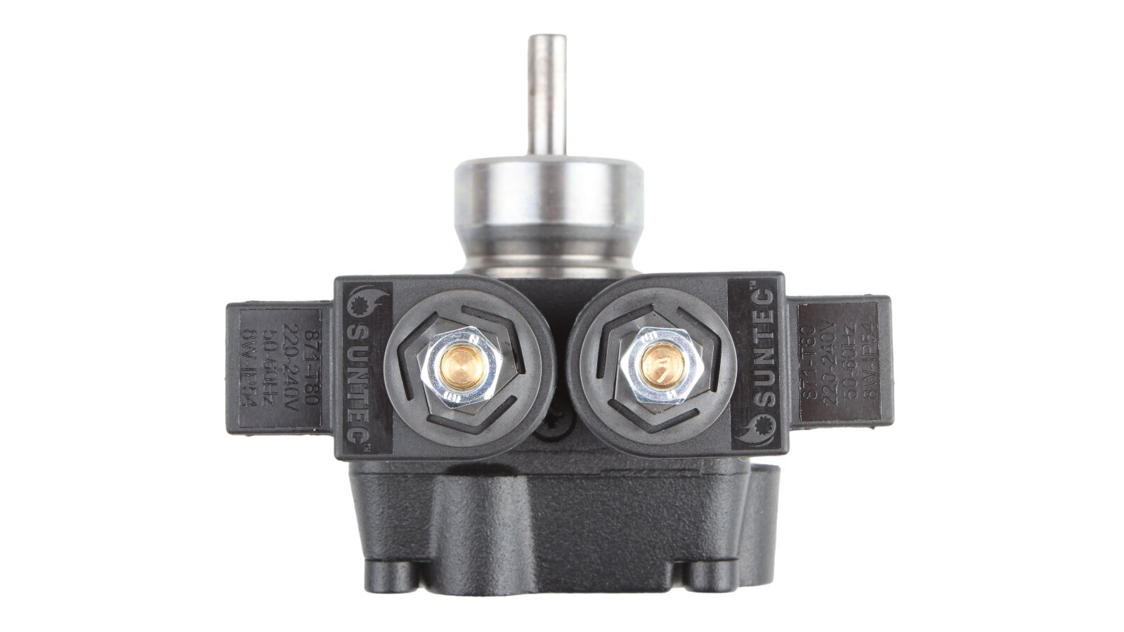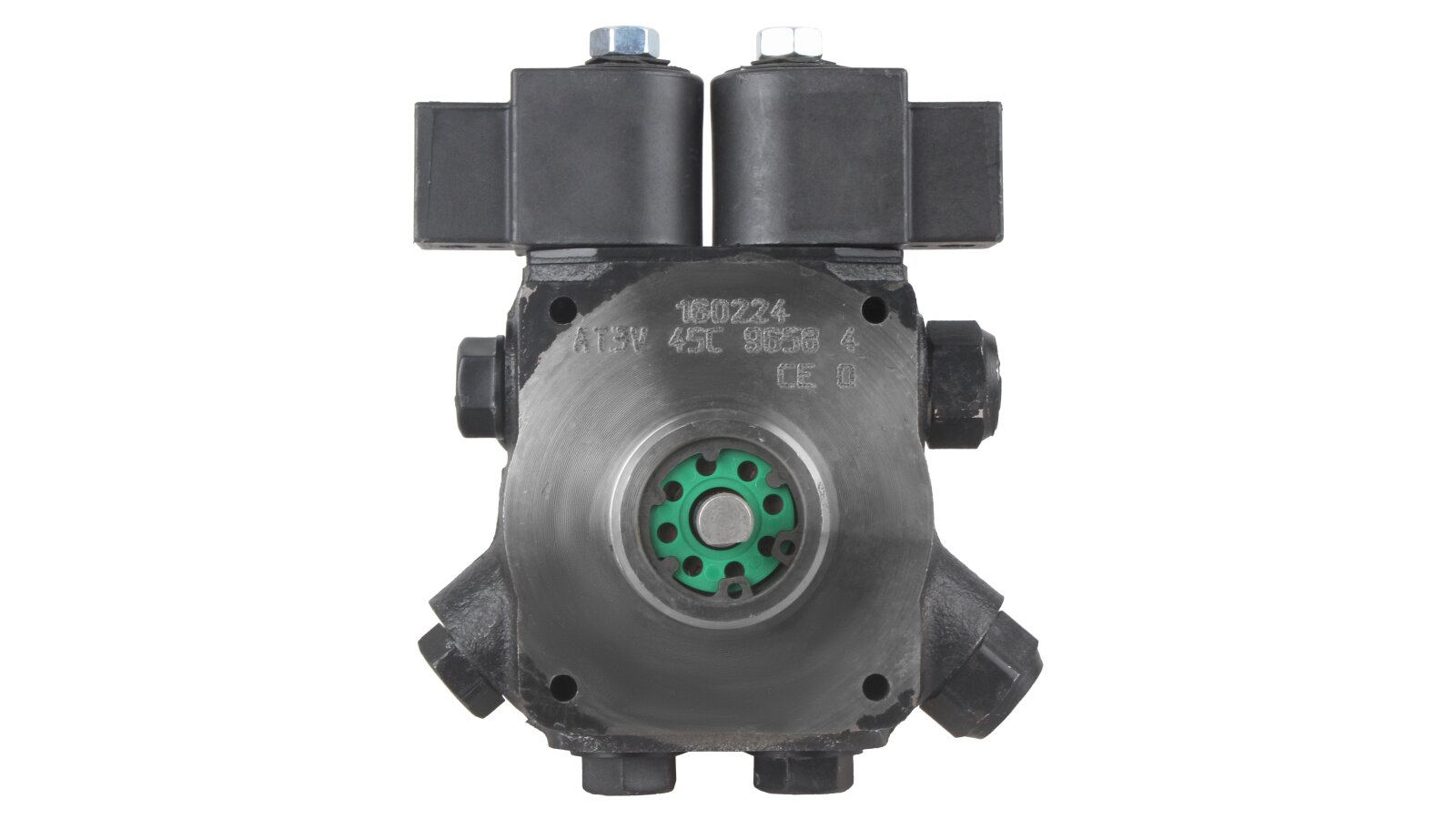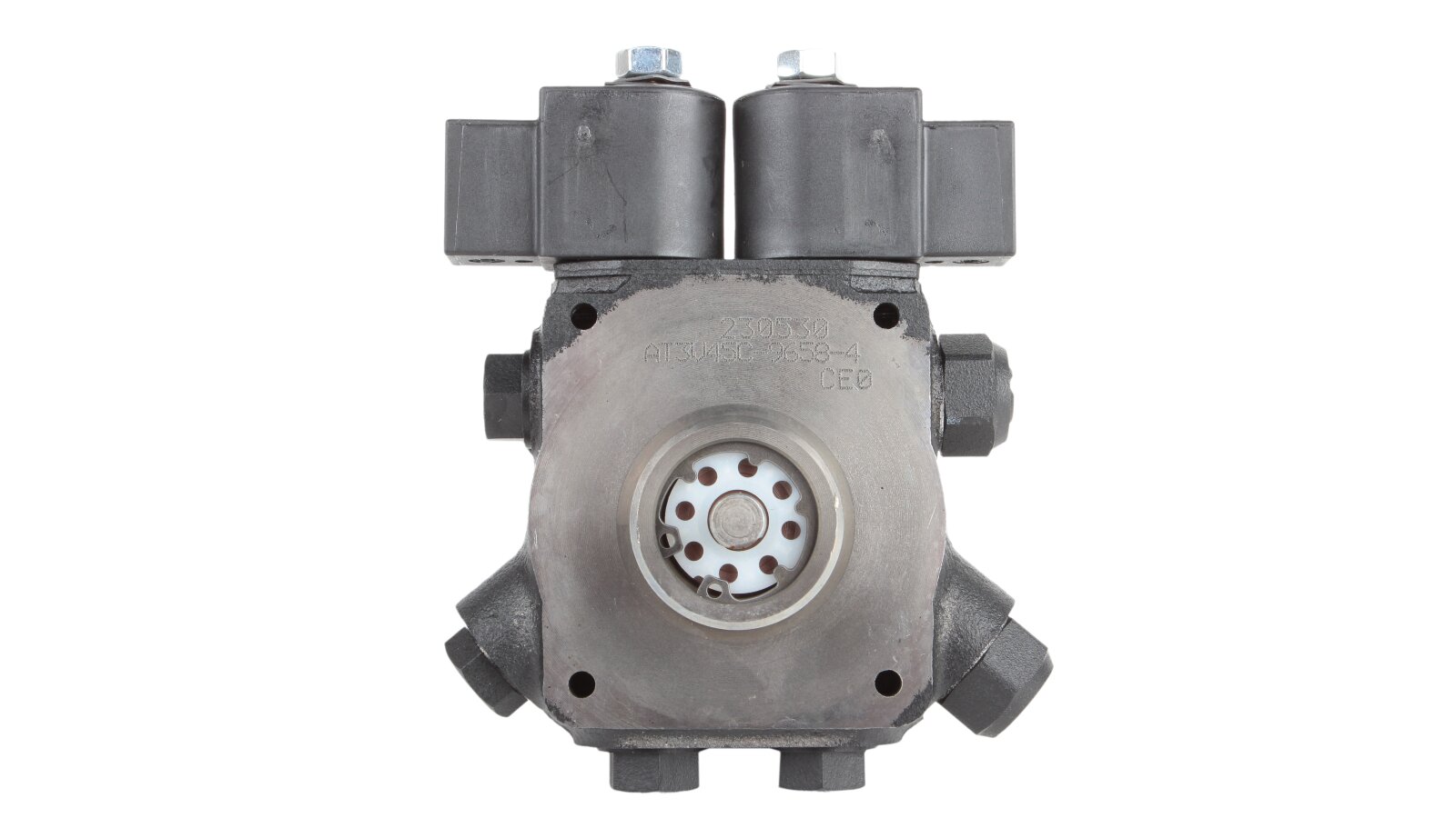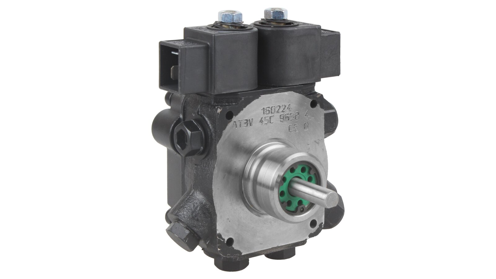 The dual-mode liquid fuel pump AT3 V 45 C 9658 4P 0700 is equipped with two electromagnetic valves with a locking function. The design has a special connection hole on the cover for connecting a pressure gauge that determines the pressure in the nozzle in high-pressure mode and discharge in low-pressure mode.