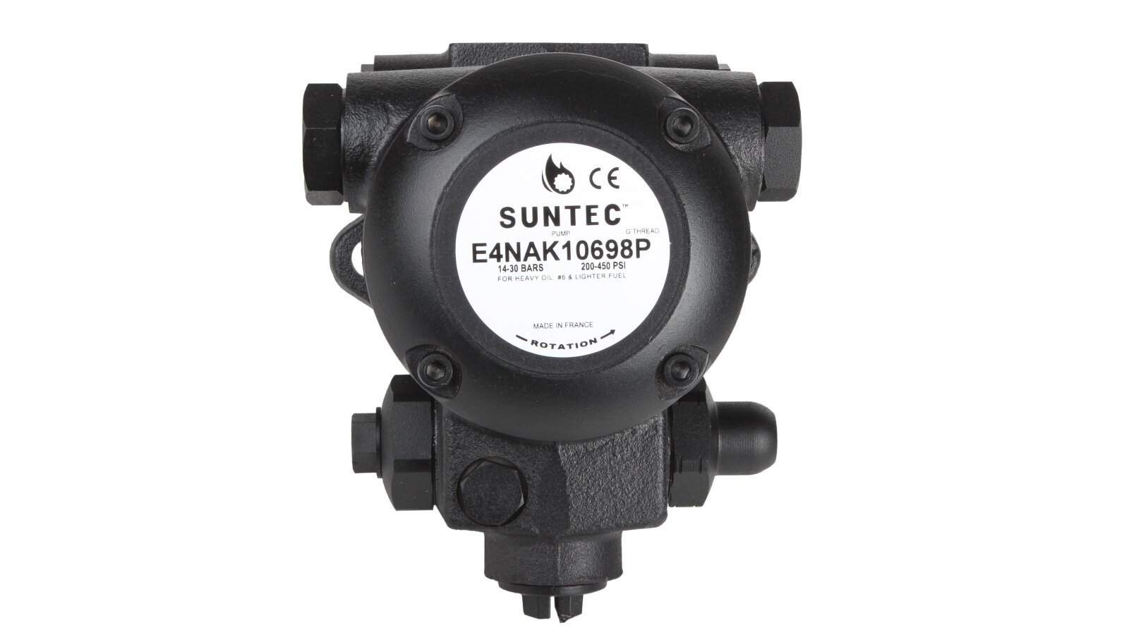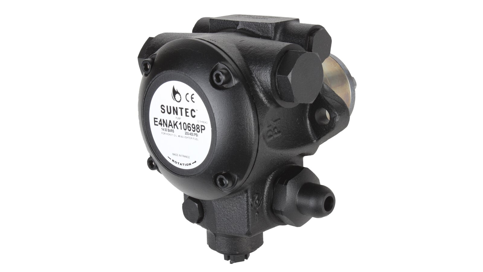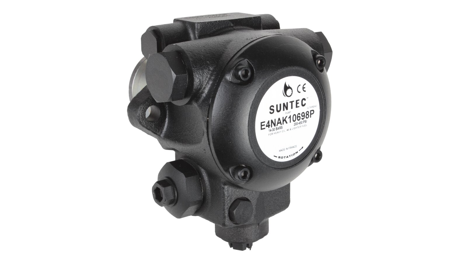 The Suntec E 4 NAK 1069 8P burner pump has a special design for pumping fuel oil and other heavy fuels. It is equipped with a special shaft seal made of a material resistant to high temperatures. It is designed taking into account the installation of a heater for preliminary fuel preparation and facilitating a cold start.