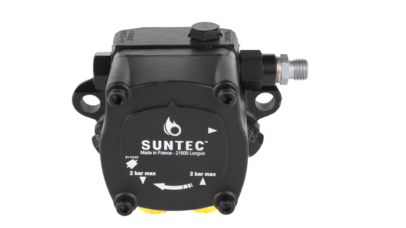 The Suntec AJ burner pump is supplied with a bypass plug in the drain hole, which allows it to be installed in a two-pipe system. When using the pump in a design without a return line, the bypass plug must be removed and replaced with a blind steel plug.