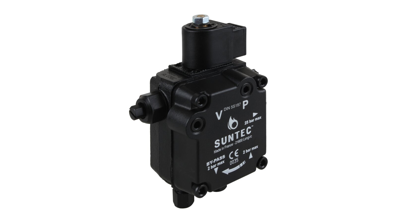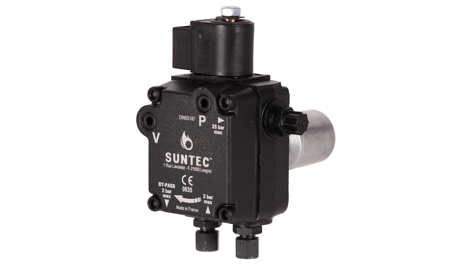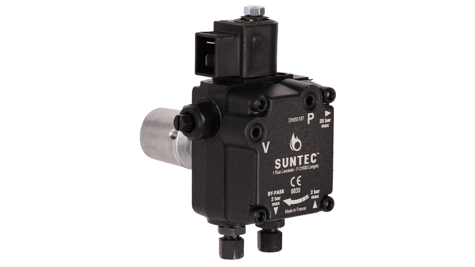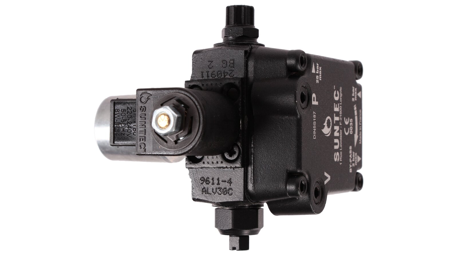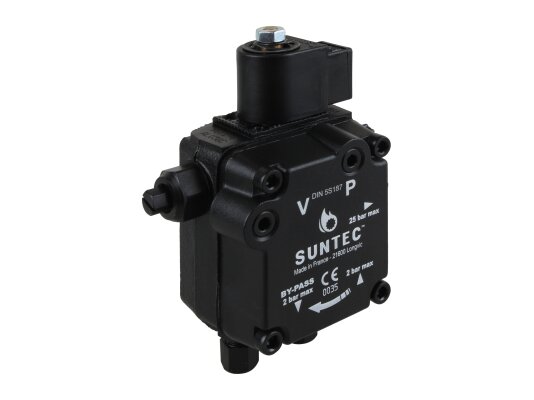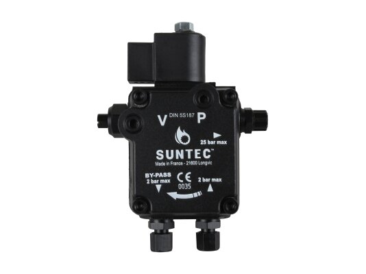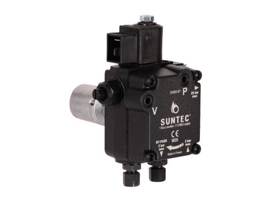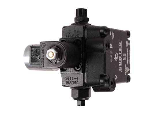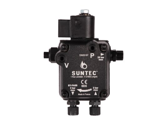 Suntec AL is made of wear- and corrosion-resistant materials. The main working element is a pair of gears in engagement. The gear device sucks fuel from the tank and passes it through the filter and pressure-regulating valve, moving it to the injector line under a given pressure. A mesh metal filter with 150 μm holes prevents damage and early wear of the gear pair. An electromagnetic normally-closed valve is installed in the injector line and quickly responds regardless of the shaft speed.