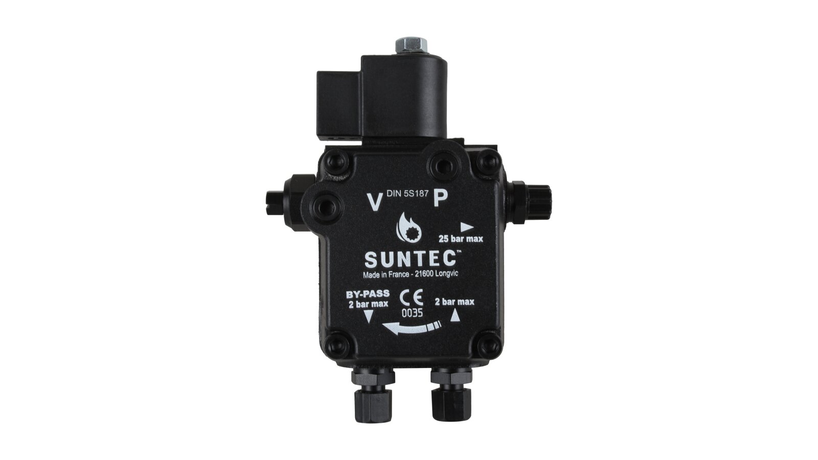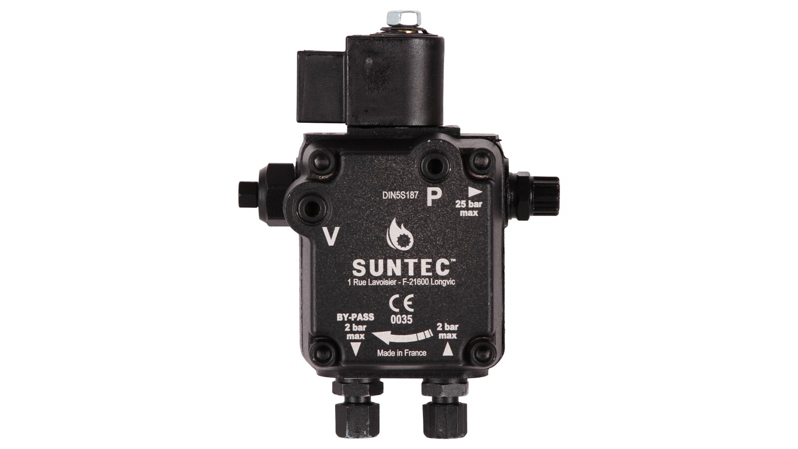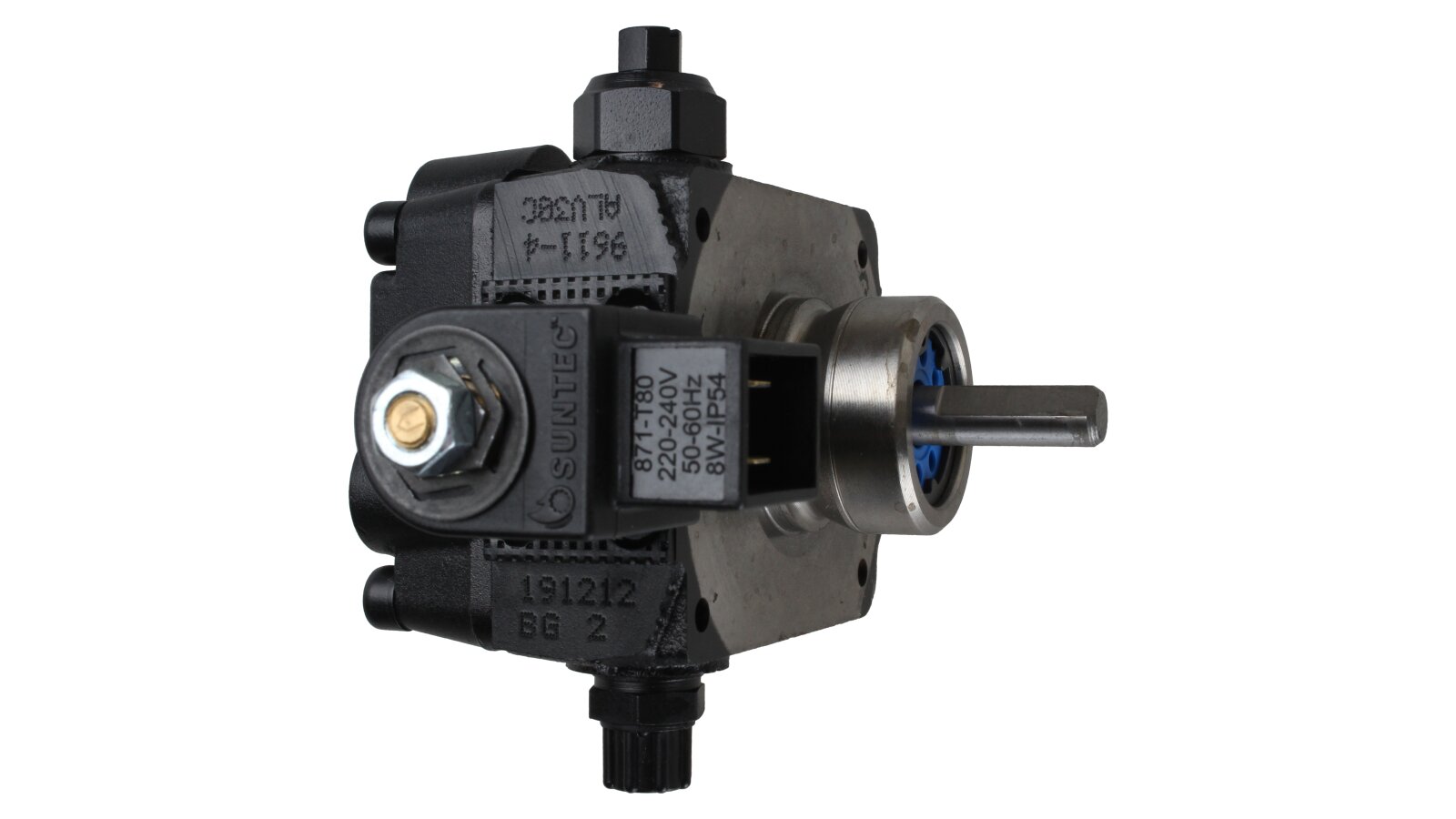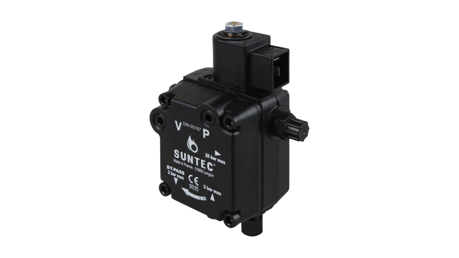 Suntec AL is made of wear- and corrosion-resistant materials. The main working element is a pair of gears in engagement. The gear device sucks fuel from the tank and passes it through the filter and pressure-regulating valve, moving it to the injector line under a given pressure. A mesh metal filter with 150 μm holes prevents damage and early wear of the gear pair. An electromagnetic normally-closed valve is installed in the injector line and quickly responds regardless of the shaft speed.