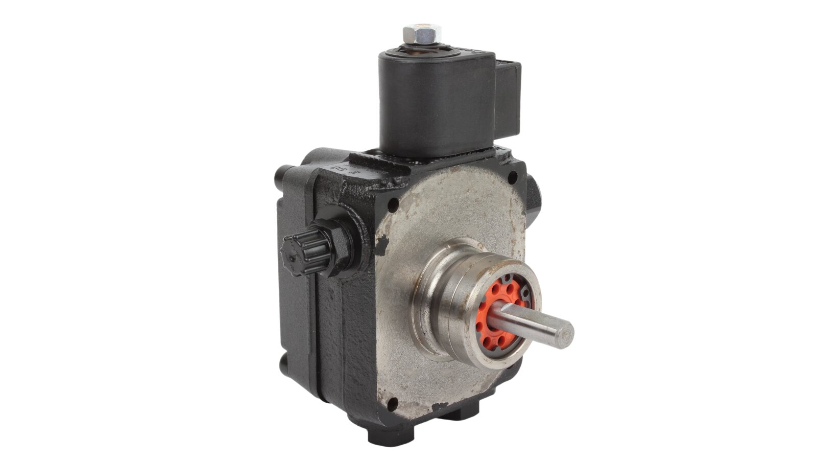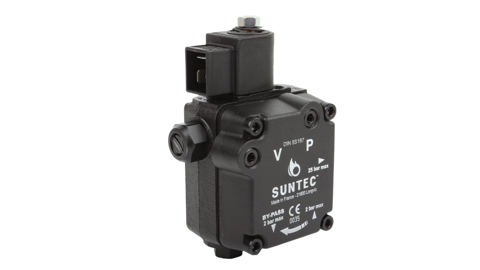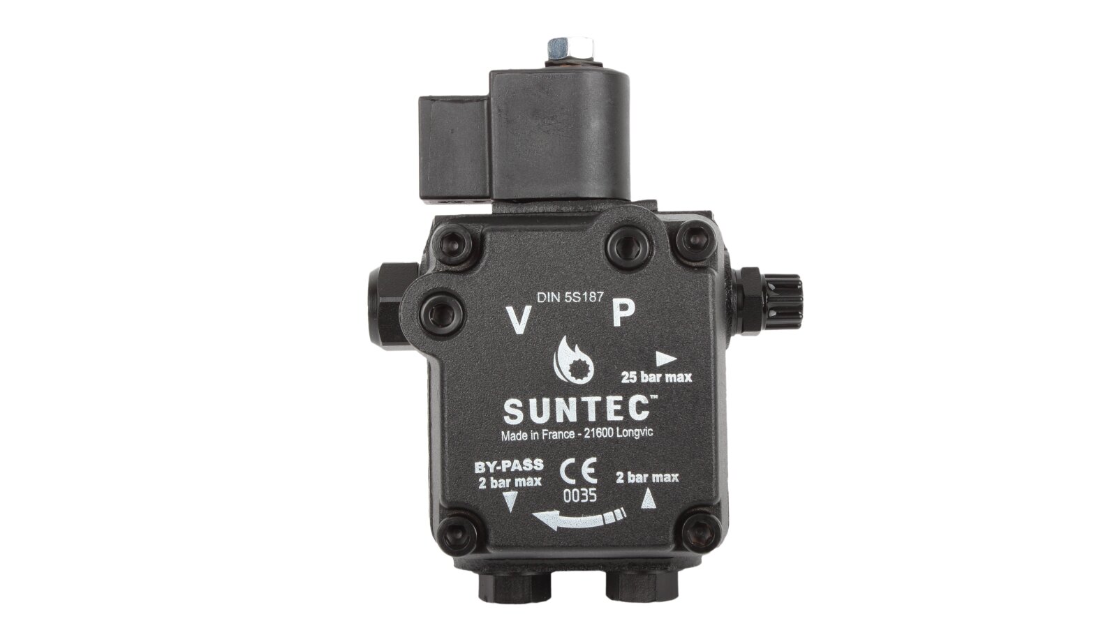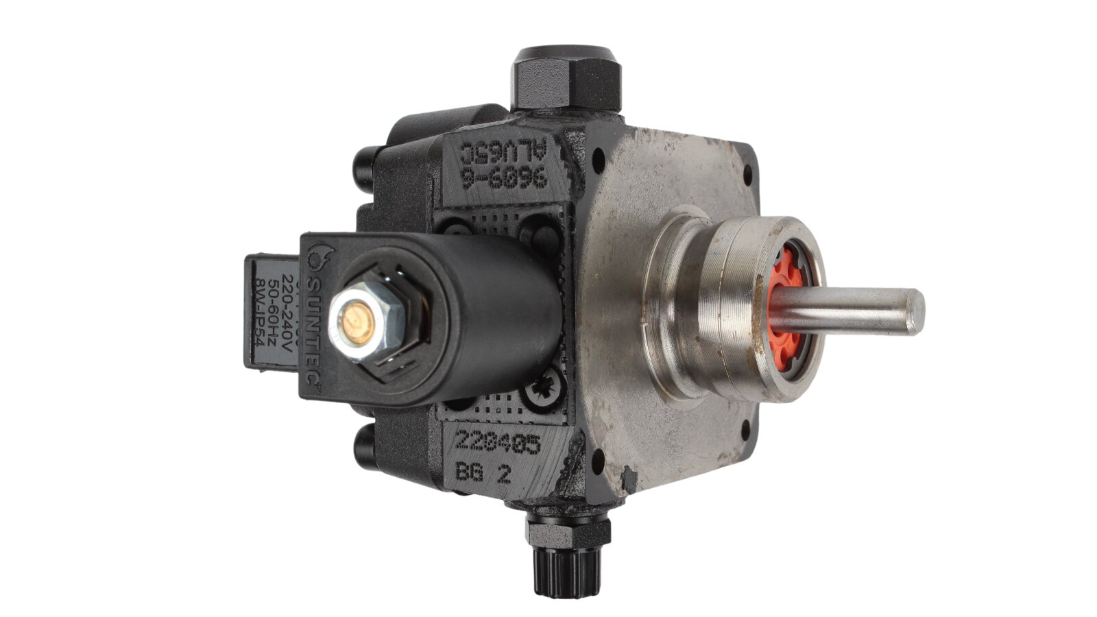 The compact body of the Weishaupt ALV65C 9609 6P0700R burner pump contains a gear working mechanism connected to the drive shaft, electromagnetic and control valves, a mesh filter, outlets for connection to a pipeline, nozzle, pressure gauge and vacuum gauge ports. The design is made according to the IP54 dust and moisture protection standard. In the factory assembly, the pump is ready for installation in a 2-pipe system. A bypass plug is inserted into the return line hole. It must be replaced with a steel plug when using the pump in one-pipe systems. The standard shaft and sleeve dimensions allow the pump to be used in burners of most manufacturers.