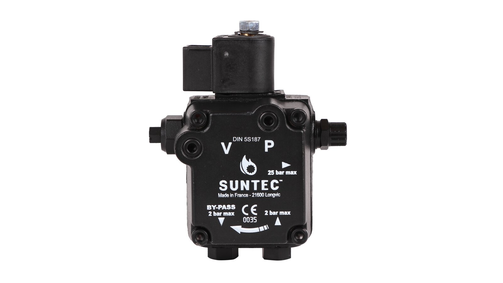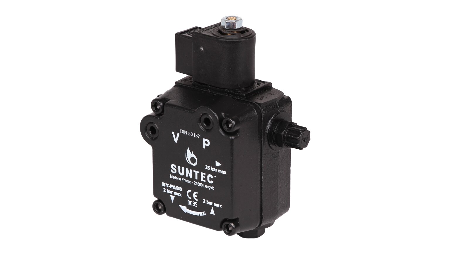 Manufacturer Part Number: 601857Performance at 11 bar pressure and 5 cSt viscosity: 40 l/hType of pumped liquid: diesel, biodiesel fuel blend B10Operating viscosity: from 2 to 12 mm²/sValve function: pressure regulatingInstalling the bypass plug: P: bypass plug installed in return line for two-pipe systemModel type: 1 stage with electromagnetic valveOil temperature: from 0 to 60 °C in the pumpStrainer: Opening size: 150 µmStrainer: Open area: 6 cm²Pump series: ALE: blocking solenoid valve with shut-off function and pressure relief device in line fSolenoid valve consumption: 9 WPressure gauge port: ⅛ inchVacuum gauge port: ⅛ inchNominal rotation speed: 2850 rpmSolenoid valve voltage: 220-240 or 110-120 or 24 VDirection of rotation (looking at the drive shaft): C: counterclockwise rotation / nozzle on the leftInstallation method: sleeve ∅ 32 mmMaximum rotation speed: 3600 rpmDegree of protection: IP41Torque: 0.1 N·mSuction and return line: ¼ inch NPTF (taper thread)Suction height: 0.45 bars max. vacuum to prevent air separation from oilNozzle outlet: ⅛ inchInlet pressure: 2 barReturn pressure: 2 barBypass valve opening pressure: 3.5 barShaft diameter: 8 mmNozzle pressure range: from 8 to 15 barFactory pressure setting: 9 barBy-pass plug: It is installed in the return line for a two-pipe system and is removed with a hexagonal wrench withShaft design: one cavityMaximum pressure of the solenoid valve: 15 bar