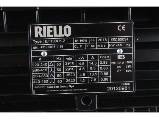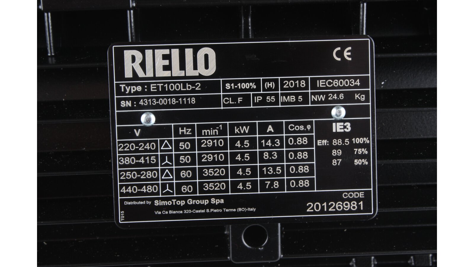 Three-phase electric motor Riello 4500 W is a profitable solution for equipping liquid fuel burners with supercharging at an optimal price from a European manufacturer.