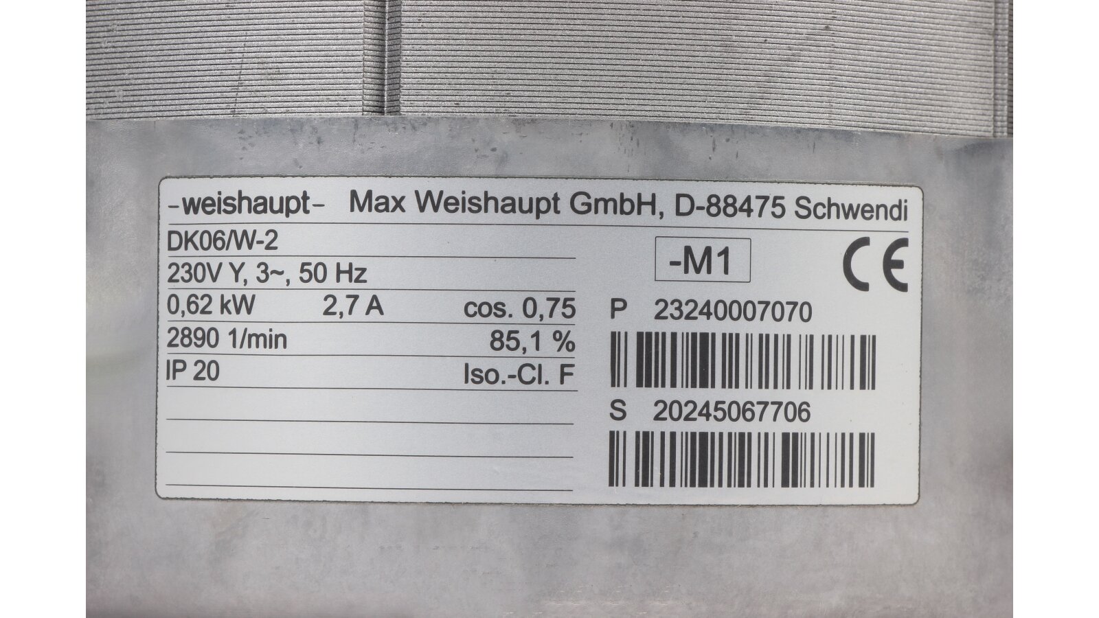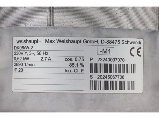 The Weishaupt DK06/W-2 electric motor, art.: 23040007032, is used to equip an industrial forced-draft burner. It operates from a 230 V network. It is characterized by economical energy consumption, compact dimensions, and easy starting.