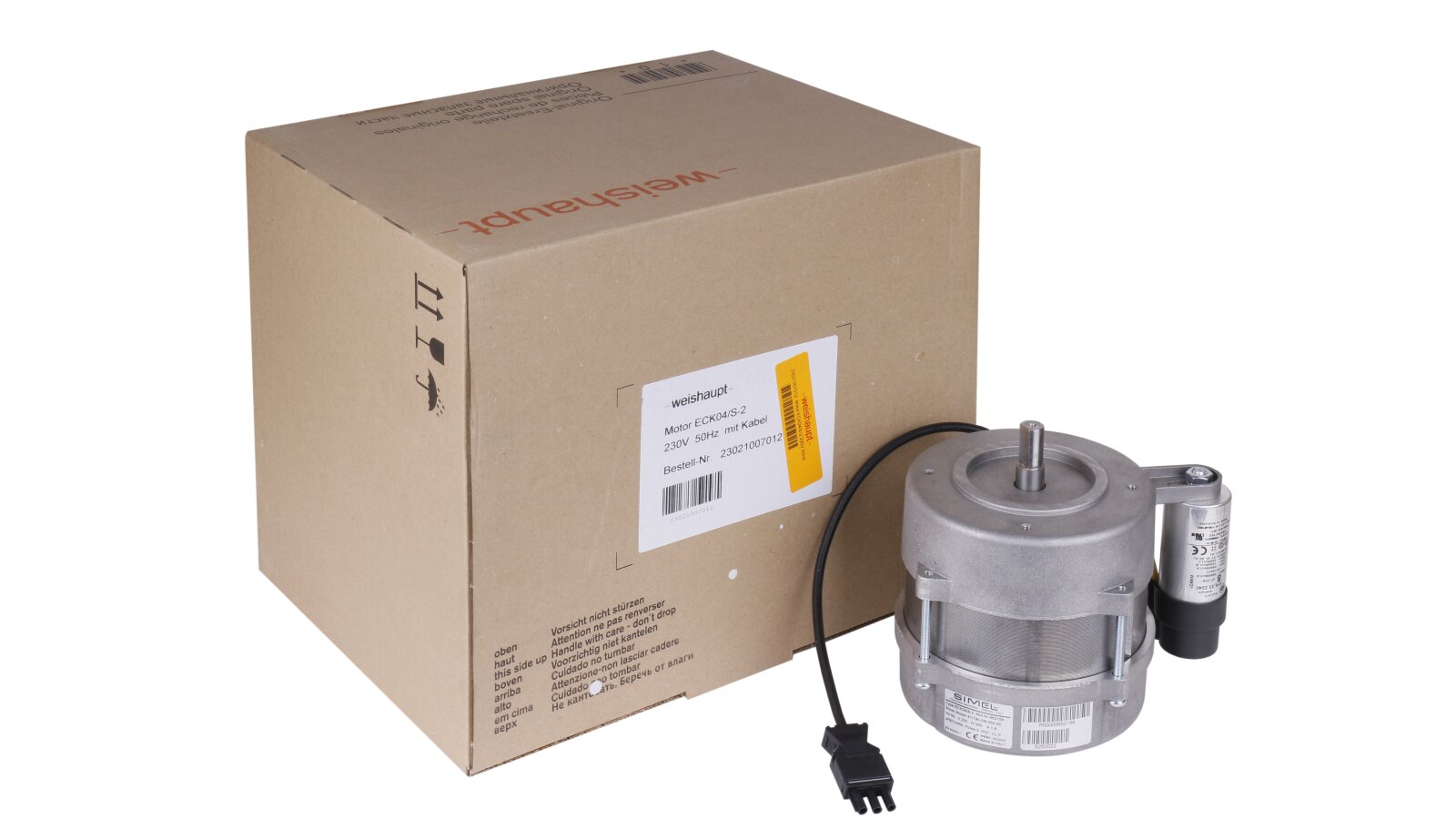 The Weishaupt ECK04/S-2 electric motor, art: 23021007012, ensures reliable operation of the industrial burner fan for forcing air into combustion and purging the chamber. It is assembled in a small shockproof housing that protects the working unit from damage and foreign objects. The motor operates from a 230-volt network. The built-in 8 μF starting capacitor increases the torque, ensuring a confident start.