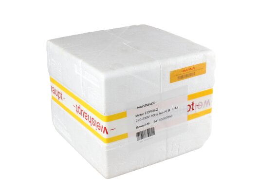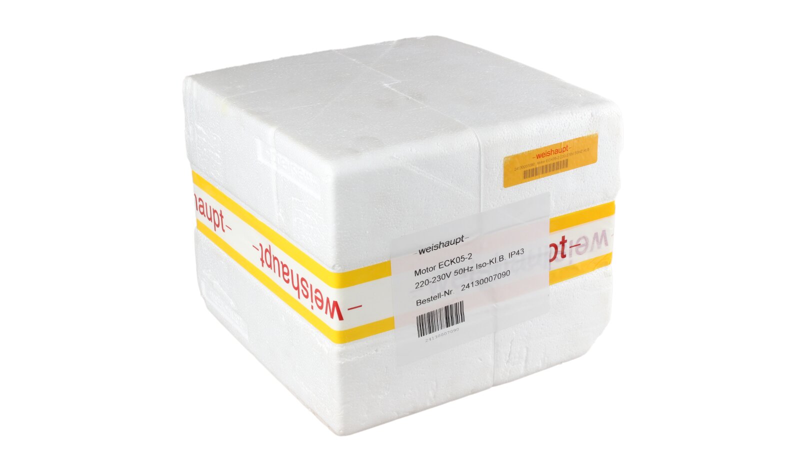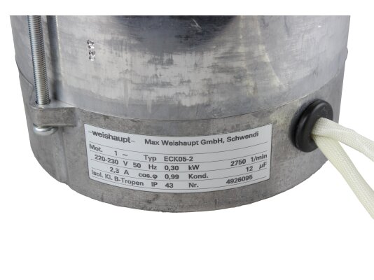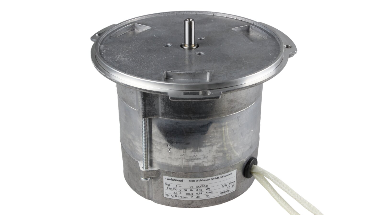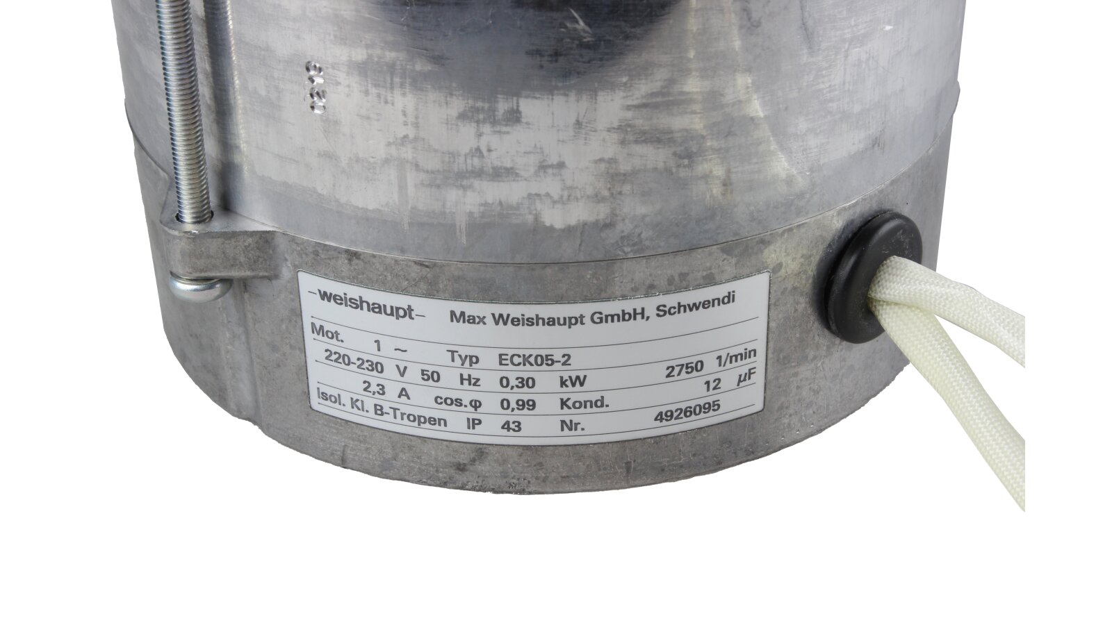 The Weishaupt ECK05-2 electric motor, art.: 24130007090, drives the fan of a forced-air gas or liquid fuel burner. It is equipped with a 12 μF starting capacitor to increase the torque at the start and to equalize the voltage parameters. The equipment is characterized by reliable performance, high resistance to corrosion, overheating, made of wear-resistant and corrosion-resistant materials. Conforms to EN 60034.