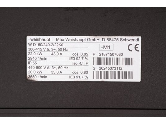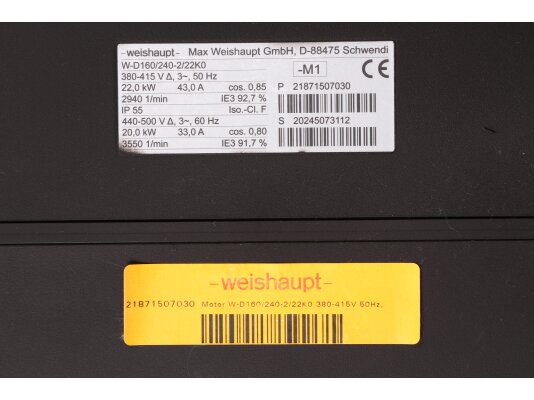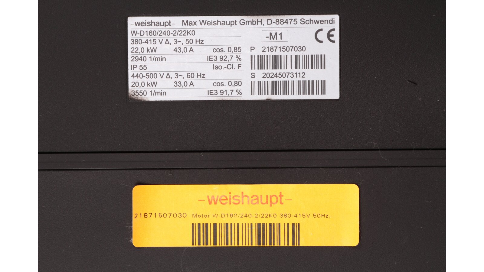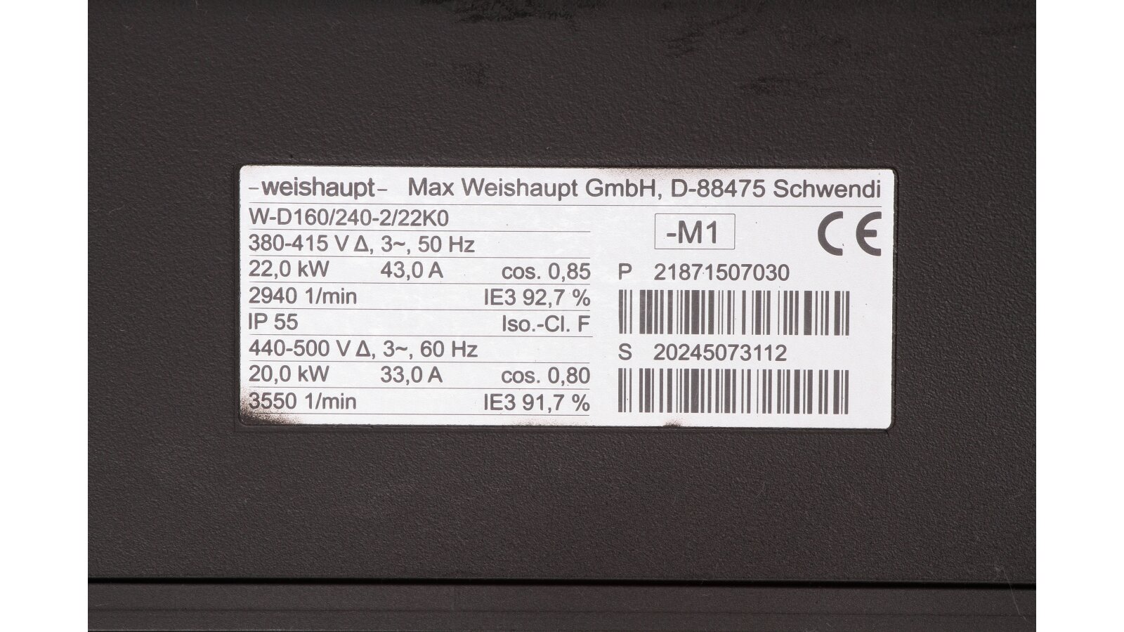 Electric motor Weishaupt W-D160/240-2/22K0, part number: 21871507030 is designed to equip Weishaupt industrial burners. Conforms to European quality and electrical safety standards. The level of dust and moisture protection of electrical equipment complies with the IP55 standard.