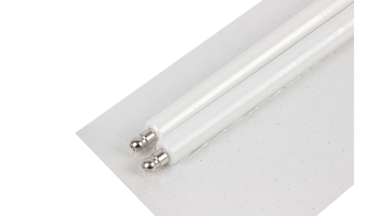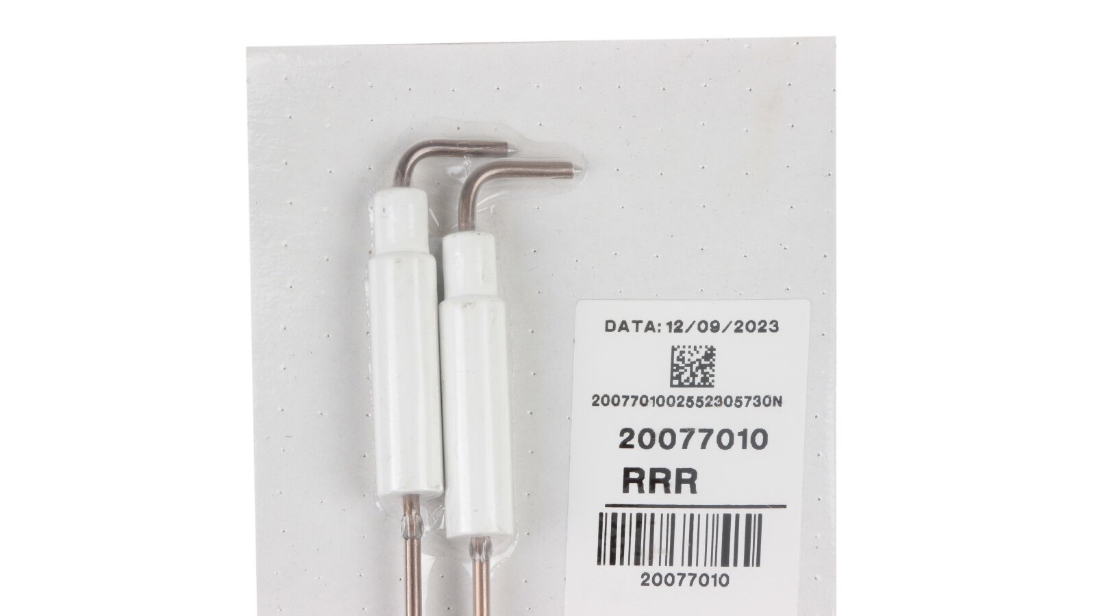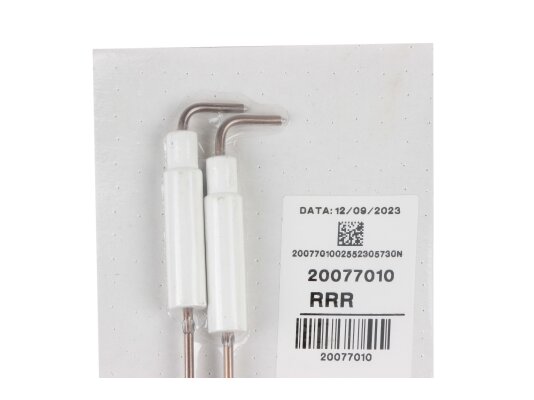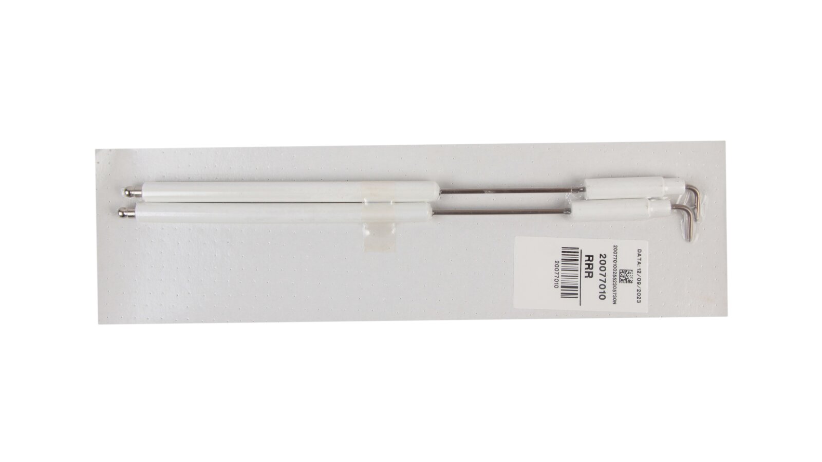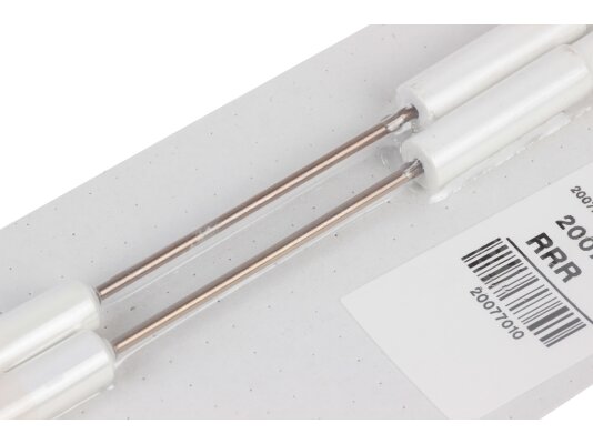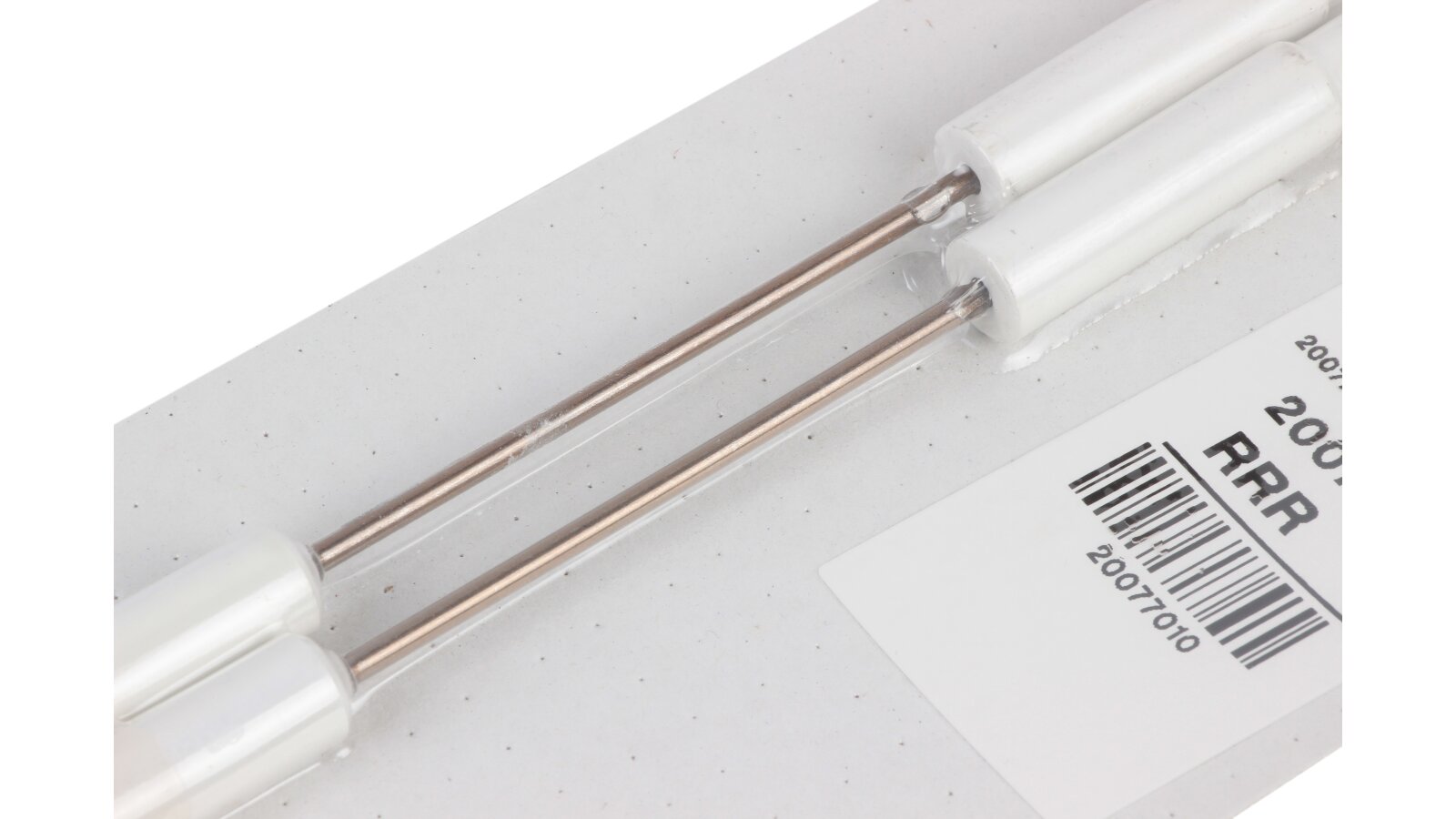 The Riello ignition electrode set, art. 20077010, creates a powerful electric spark that ignites the fuel-air mixture when the burner is started. The conductive rod is protected by ceramic insulation consisting of two parts. Tight contact with the high-voltage cable is achieved through a plug connection.