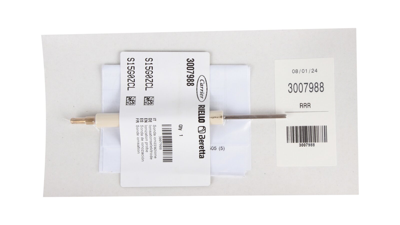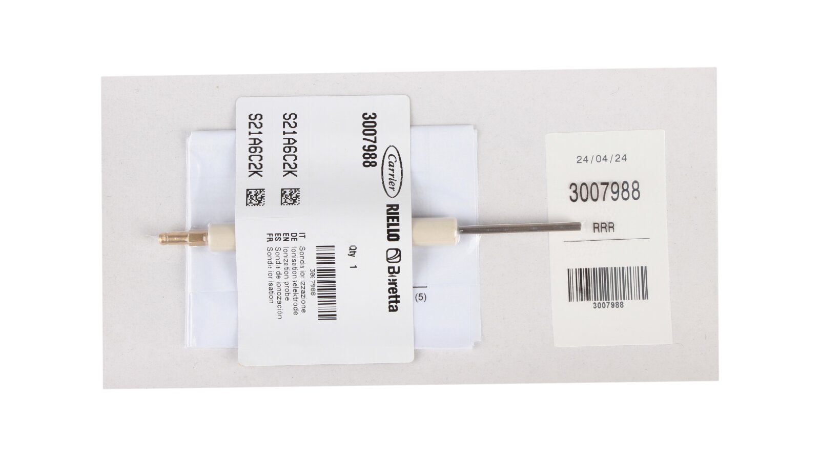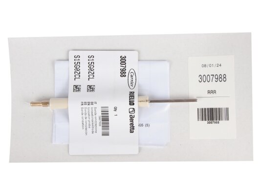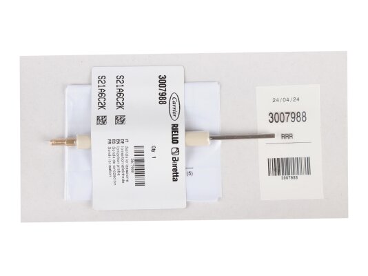 Continuous control of the presence/absence of flame is necessary for the safe operation of the gas installation. An element of the burner safety system is the 153 mm ionization electrode, article: 3007988, which can be purchased on our website. The ionization sensor continuously monitors and controls the flame together with the combustion manager. The electrode is mounted on the Riello gas burner. It has a simple design, which includes a ceramic body and a metal rod. The ionization sensor is connected to the burner automation, and based on measurements of the number of charged electrons and ions, sends a signal about the presence or absence of flame. The combustion manager immediately closes the gas supply when the flame goes out.