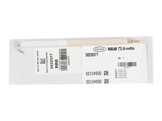 For the operation of Riello burners, the Italian manufacturer produces a 190 mm ignition electrode, article number: 3020377, which can be purchased on our website. The high-voltage electrode is used to equip Riello burners. Its function is to ignite the fuel in the burner device using a high-voltage spark.
