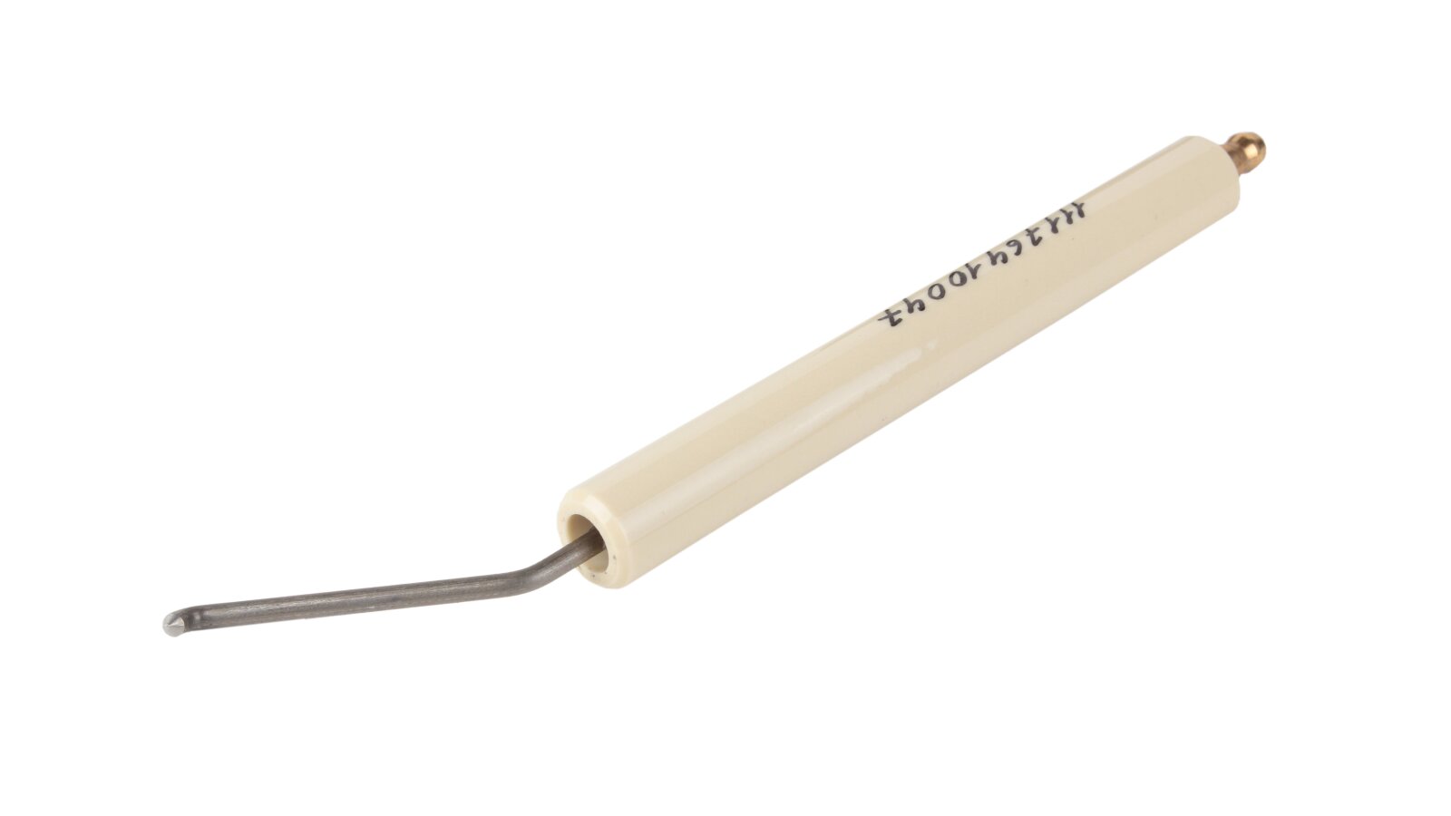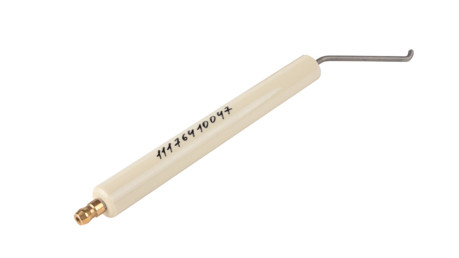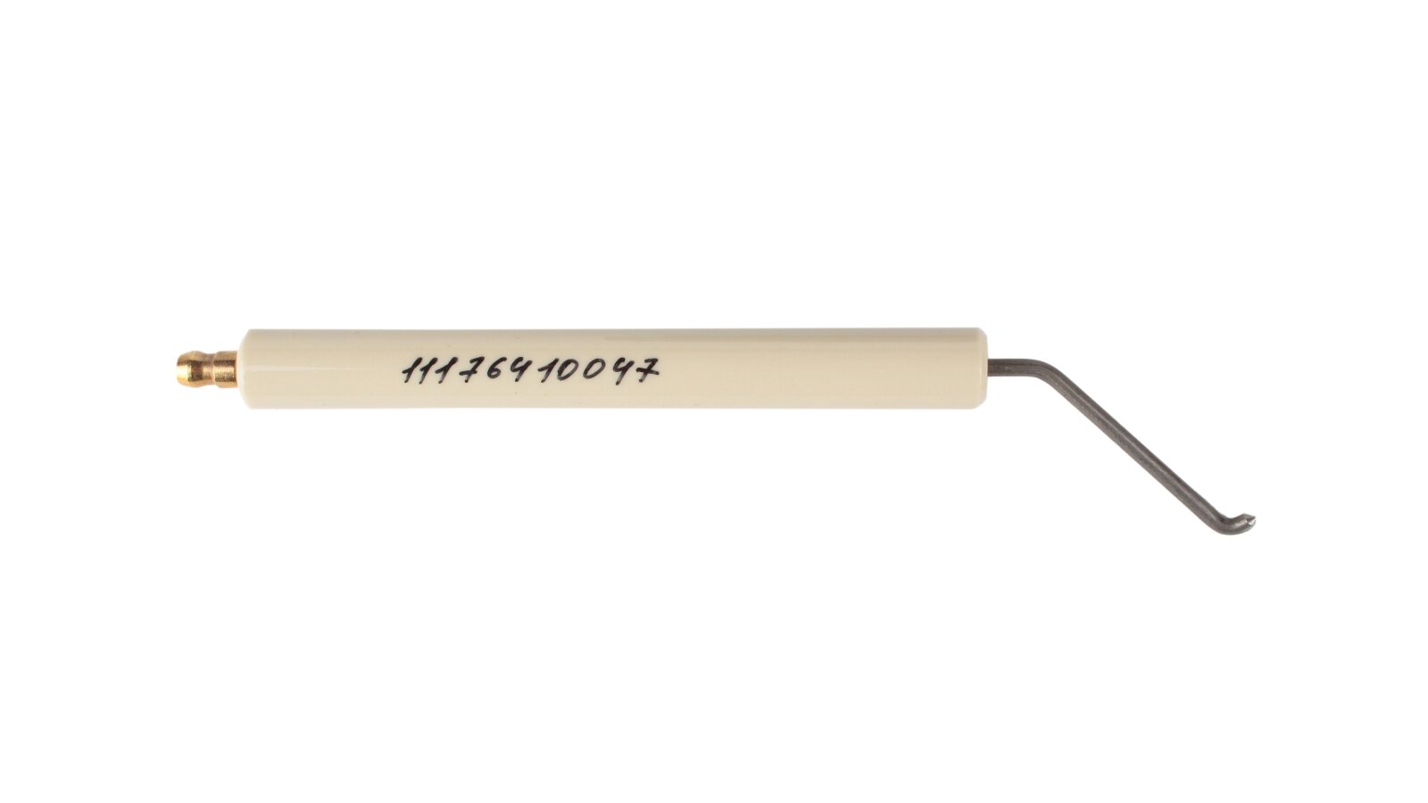 The ignition electrode 180 mm right article 11176410047 should be supplemented with the left electrode article 11176410037. When high-voltage current is supplied, a high-voltage electric arc is formed between the electrodes, igniting the fuel when the burner is started. The conductive rod is protected by a fixed ceramic shell Ø14x125 mm. A Ø6 mm plug is provided for reliable contact with the ignition cable.