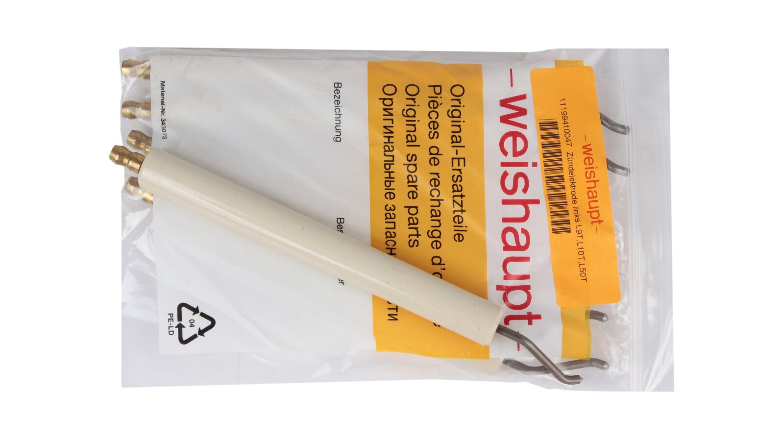 Ignition electrode 170 mm left article 11199410047 creates a high-voltage arc, due to which the fuel mixture is ignited when the burner is started. It is characterized by reliable performance, made in accordance with European quality standards. The core, through which the high-voltage current passes, is placed in a fixed insulation Ø14x125 mm made of ceramics. Reliable contact with the ignition cable is achieved using a plug connection (Ø6 mm). It is necessary to retrofit the right electrode art. 11199410057.