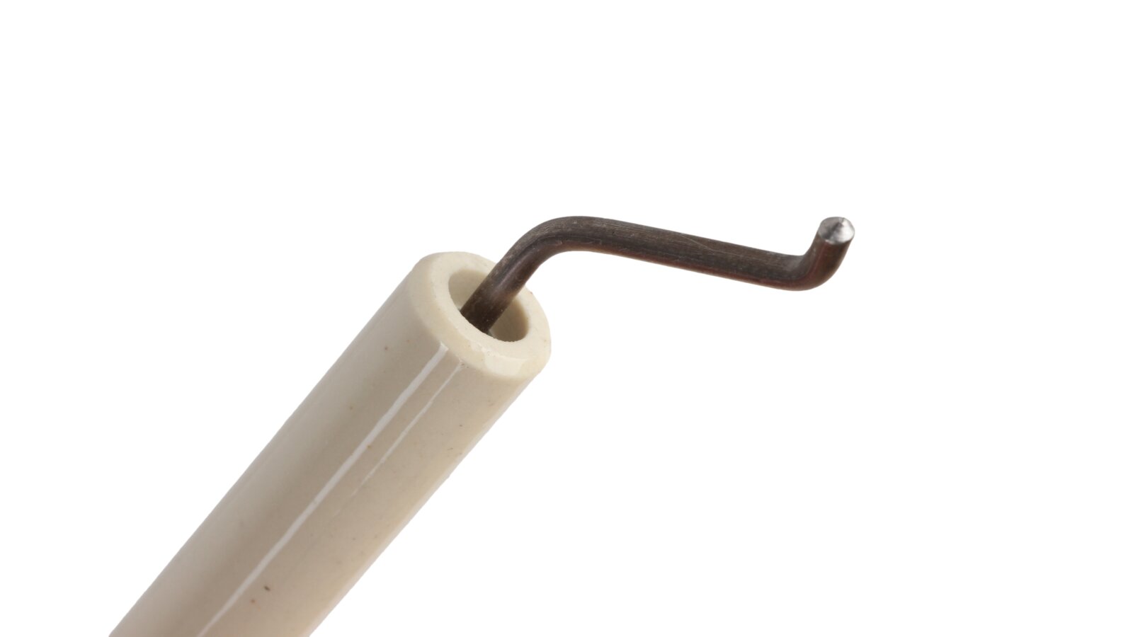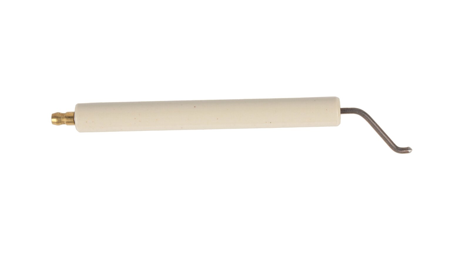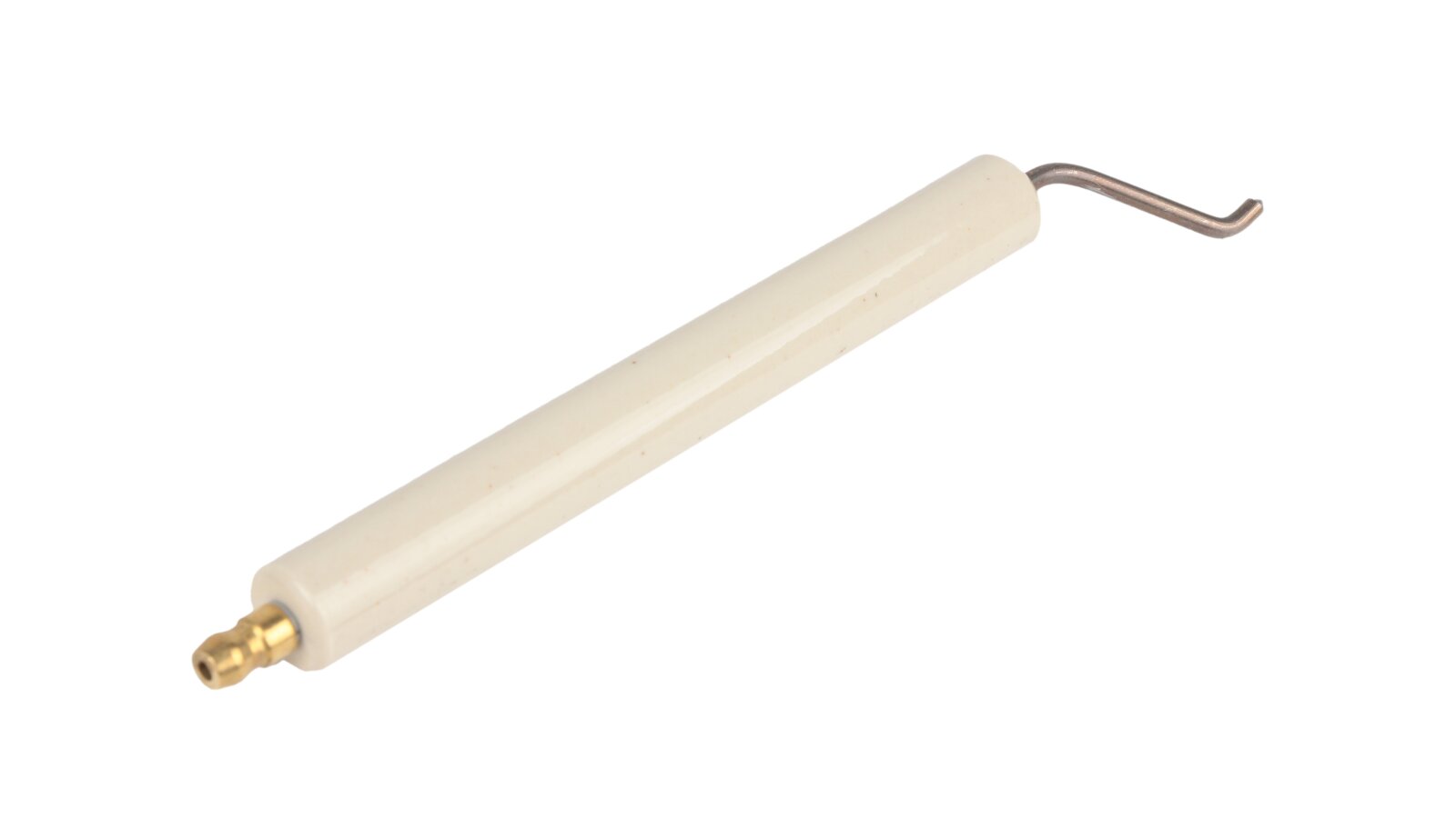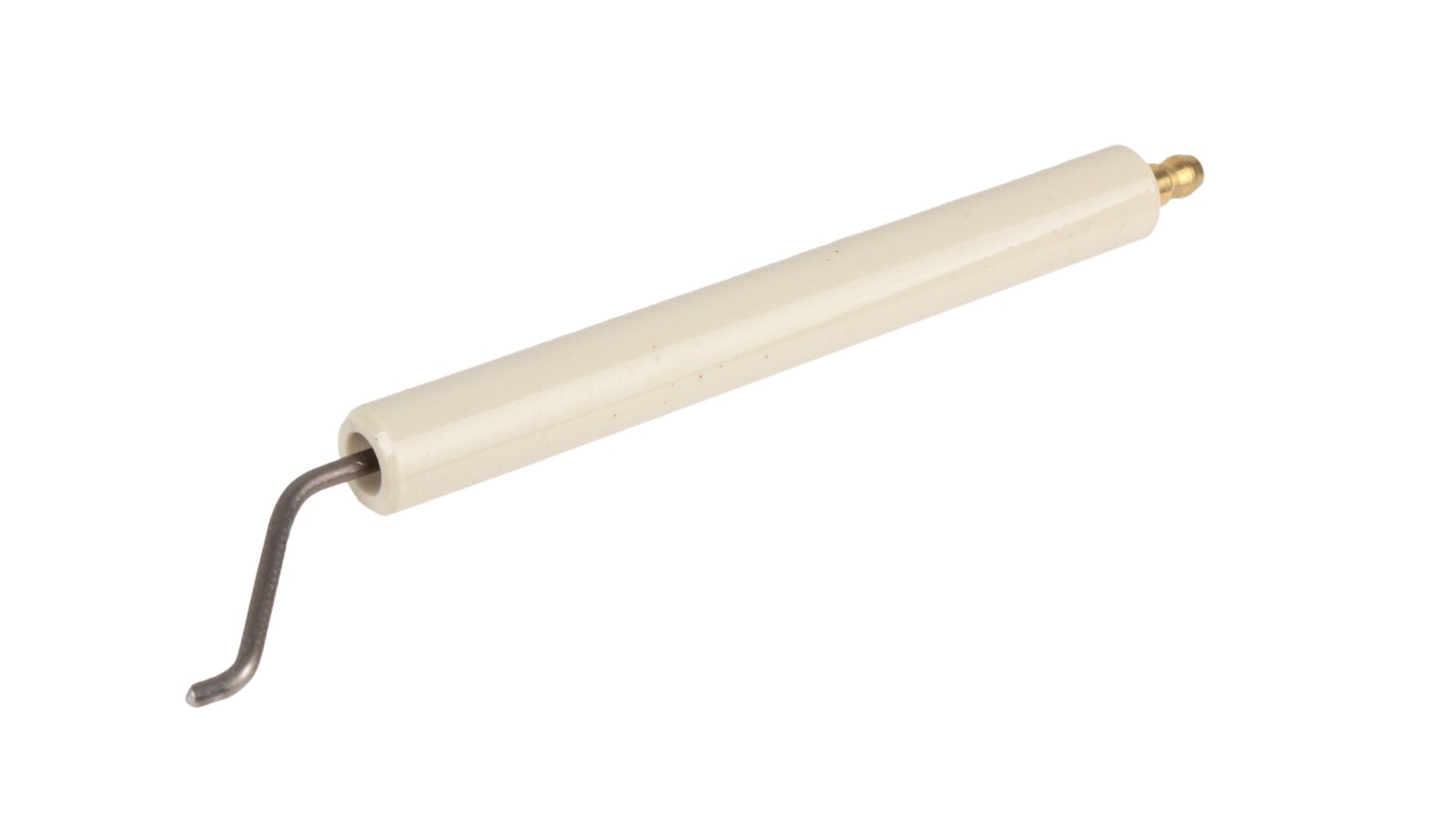 Ignition electrode 170 mm right article 11199410057 is used to equip a heating burner. By supplying high voltage between the electrodes, a high-voltage electric arc is formed, igniting the fuel when the burner is started. The conductive rod is insulated with a fixed ceramic shell Ø14x125 mm. A Ø6 mm plug is provided for reliable contact with the ignition cable. Requires a complete set with a left electrode (article 11199410047).