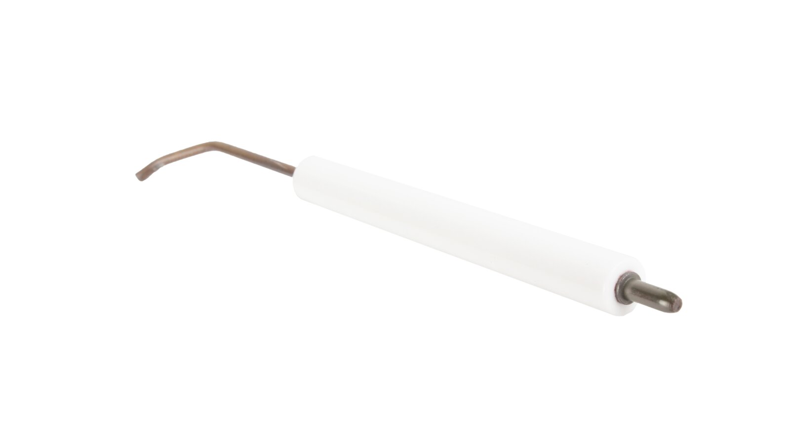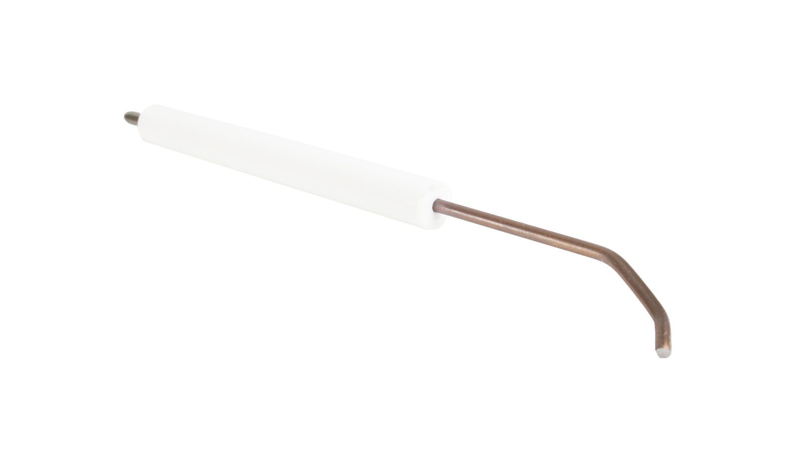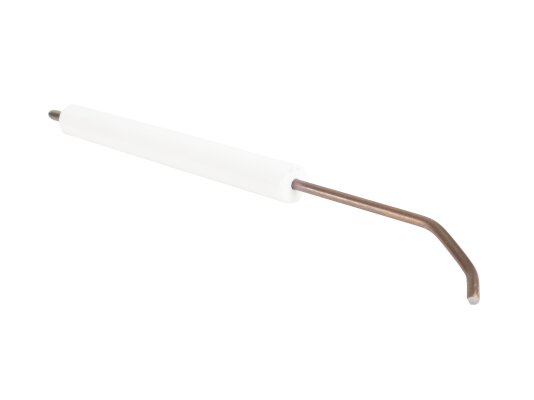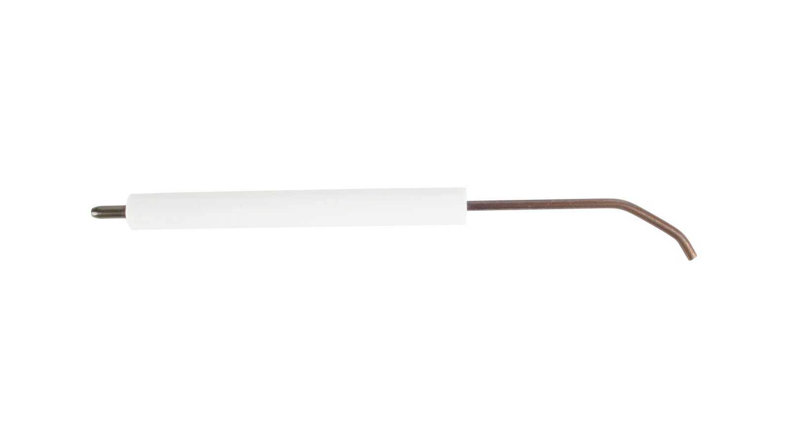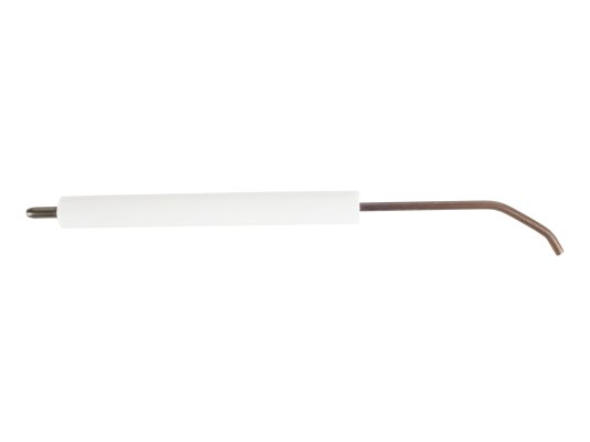 The ignition electrode 179 mm article: 21110410047 is an element of the burner ignition unit. When receiving high voltage from the ignition transformer, it forms a spark discharge that ignites the fuel-air mixture when starting the burner. The electrode is connected to the conductive cable via a Ø4 mm plug, which ensures reliable contact. The metal rod is covered with ceramic fixed insulation Ø11x110 mm.