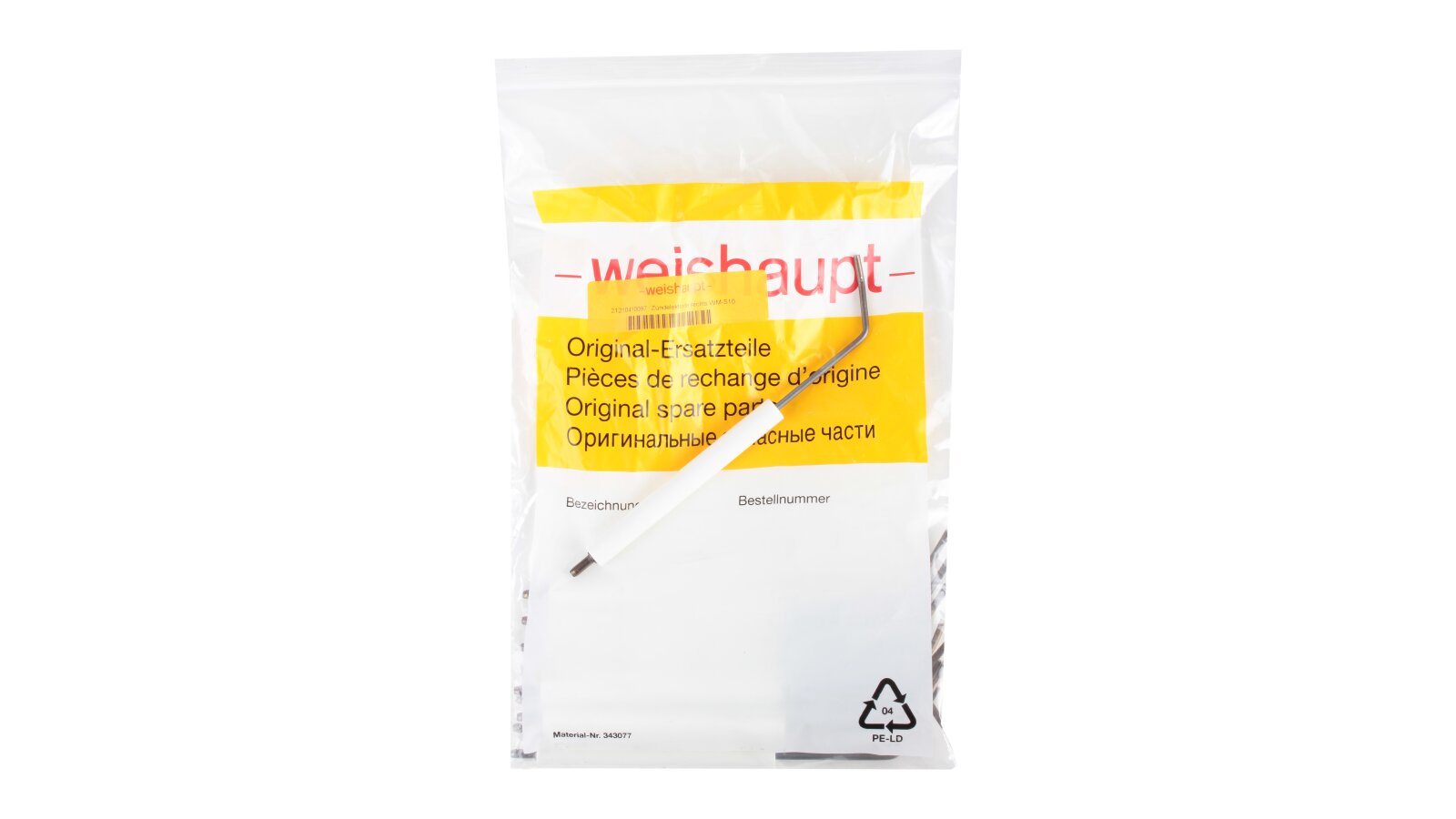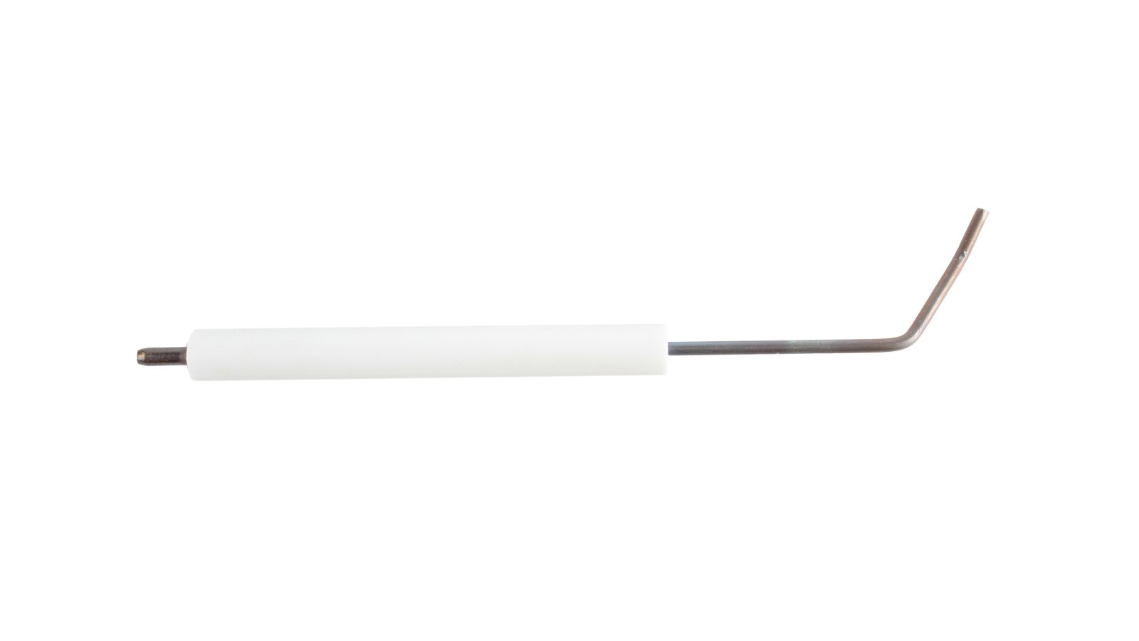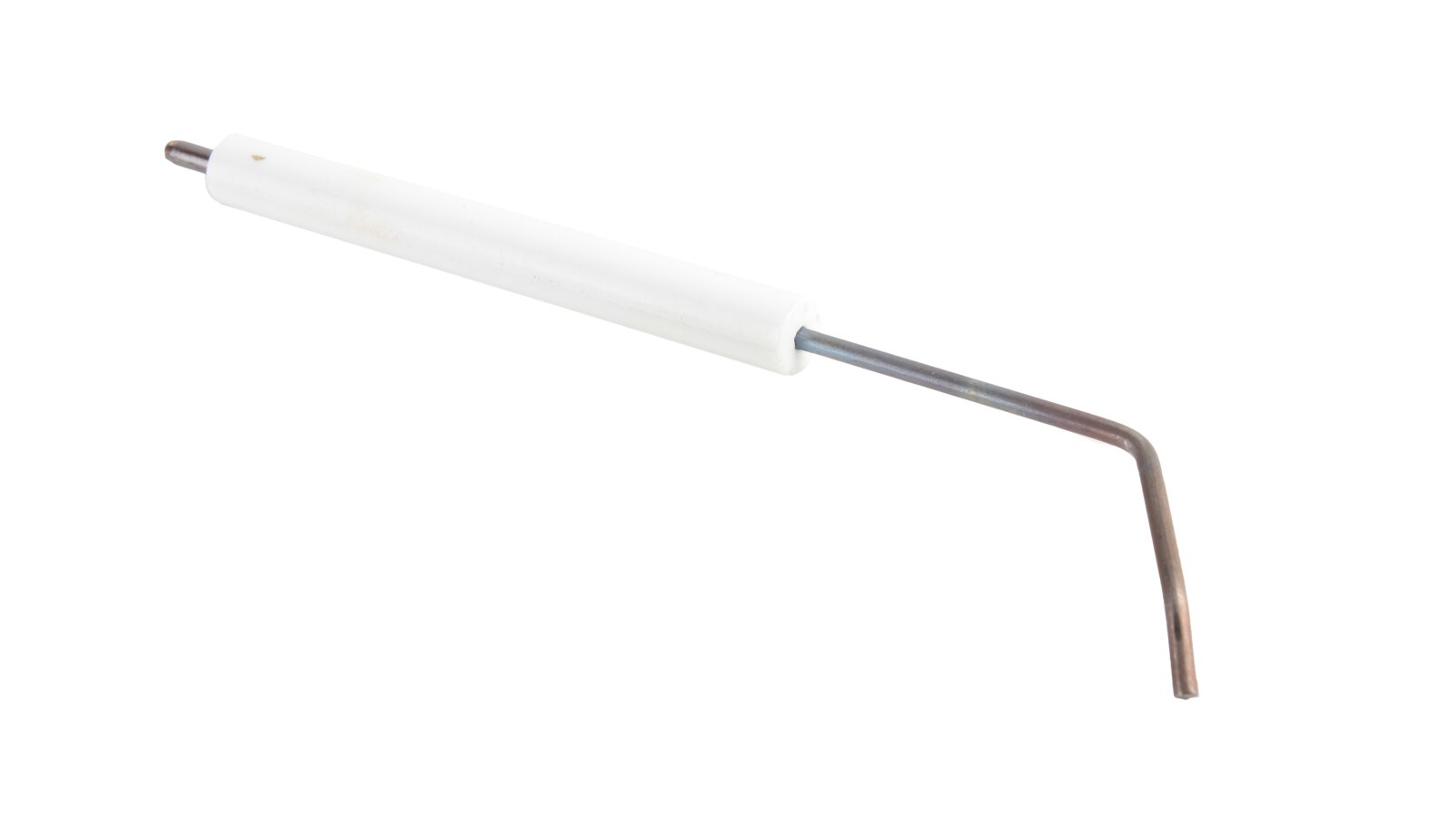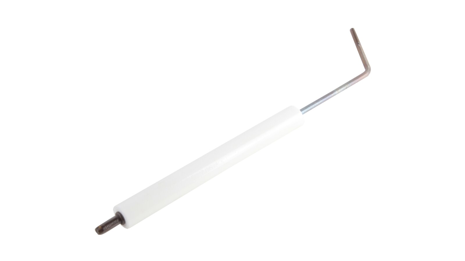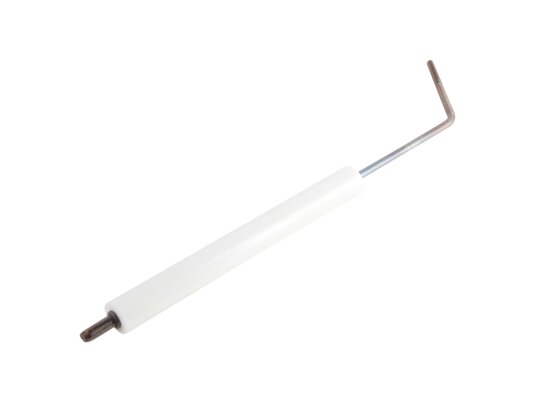The right ignition electrode Weishaupt 182 mm, 21210410097 is used for quick and safe ignition of the fuel-air mixture when using liquid fuel burners. In combination with the left electrode, it creates an electric arc that ignites the combustible mixture. Both electrodes are connected to an ignition transformer that generates high voltage current.
