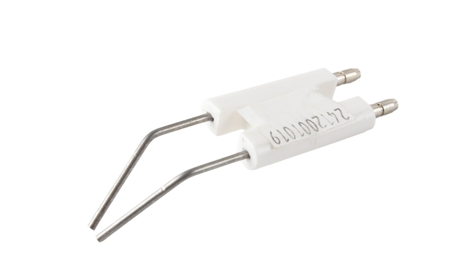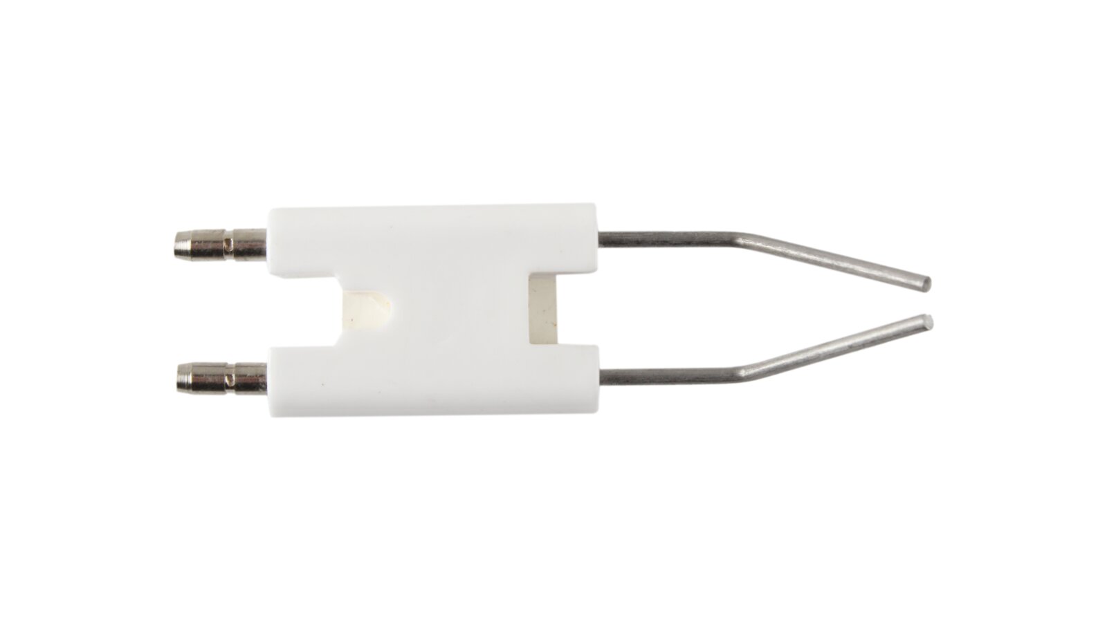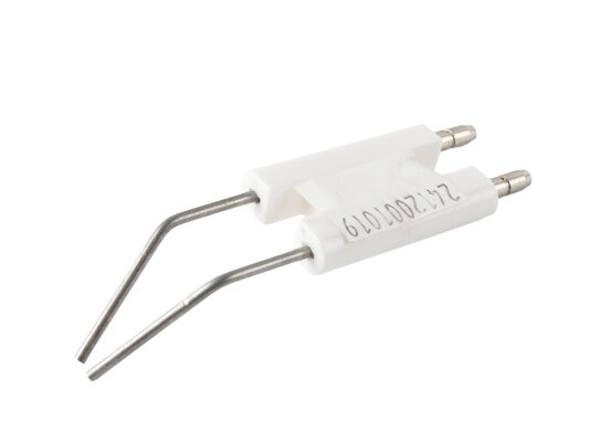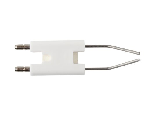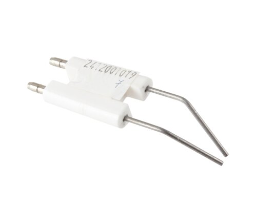 The ignition electrode block 86.5 mm article 24120010197 is used to ignite the burner. When high-voltage current is supplied, an electric spark discharge is formed between the electrodes, igniting the fuel mixture. The block has a single ceramic electrical insulation of the conductive rods (size 38x25x8 mm). Plug connections Ø4 mm are provided for connecting ignition cables and reliable contact.