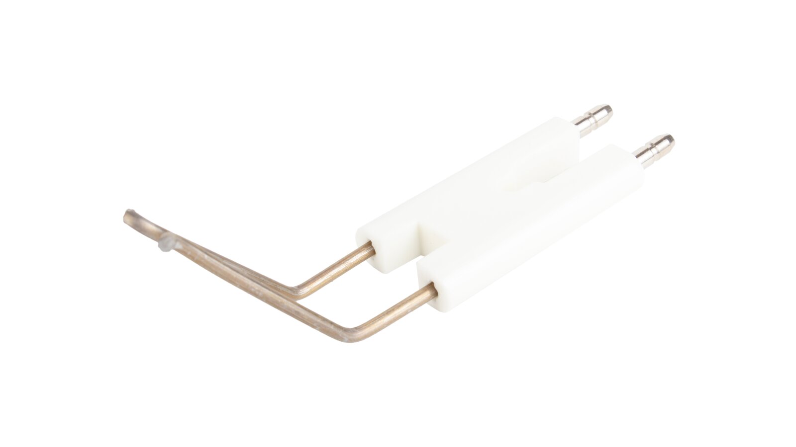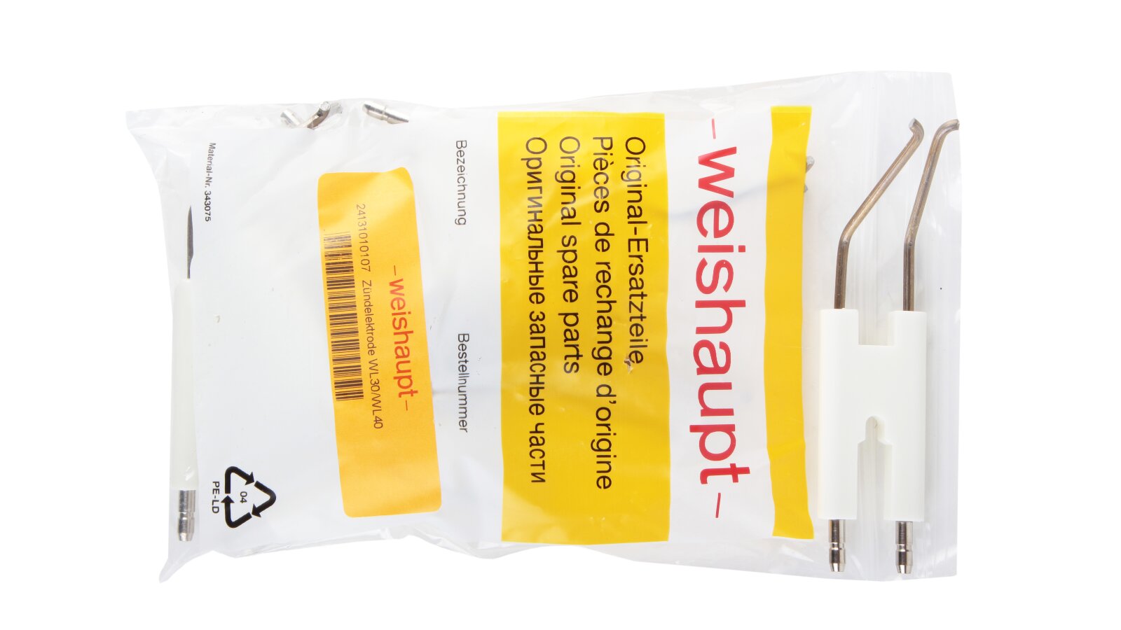 The Weishaupt, art. 24131010107 ignition electrode quickly and safely ignites the fuel with a powerful electric spark. It consists of two metal conductive rods, insulated with a single ceramic insulation with a hole for fixing. Plug connections are used to connect to high-voltage conductive cables.