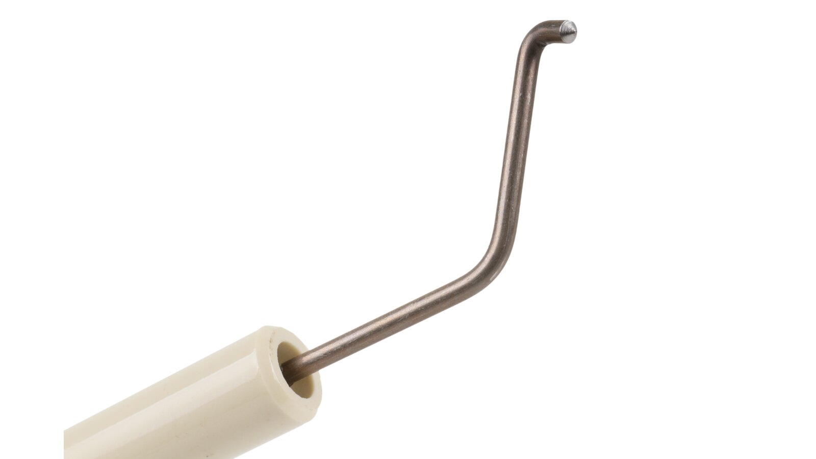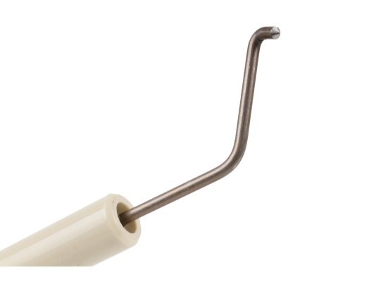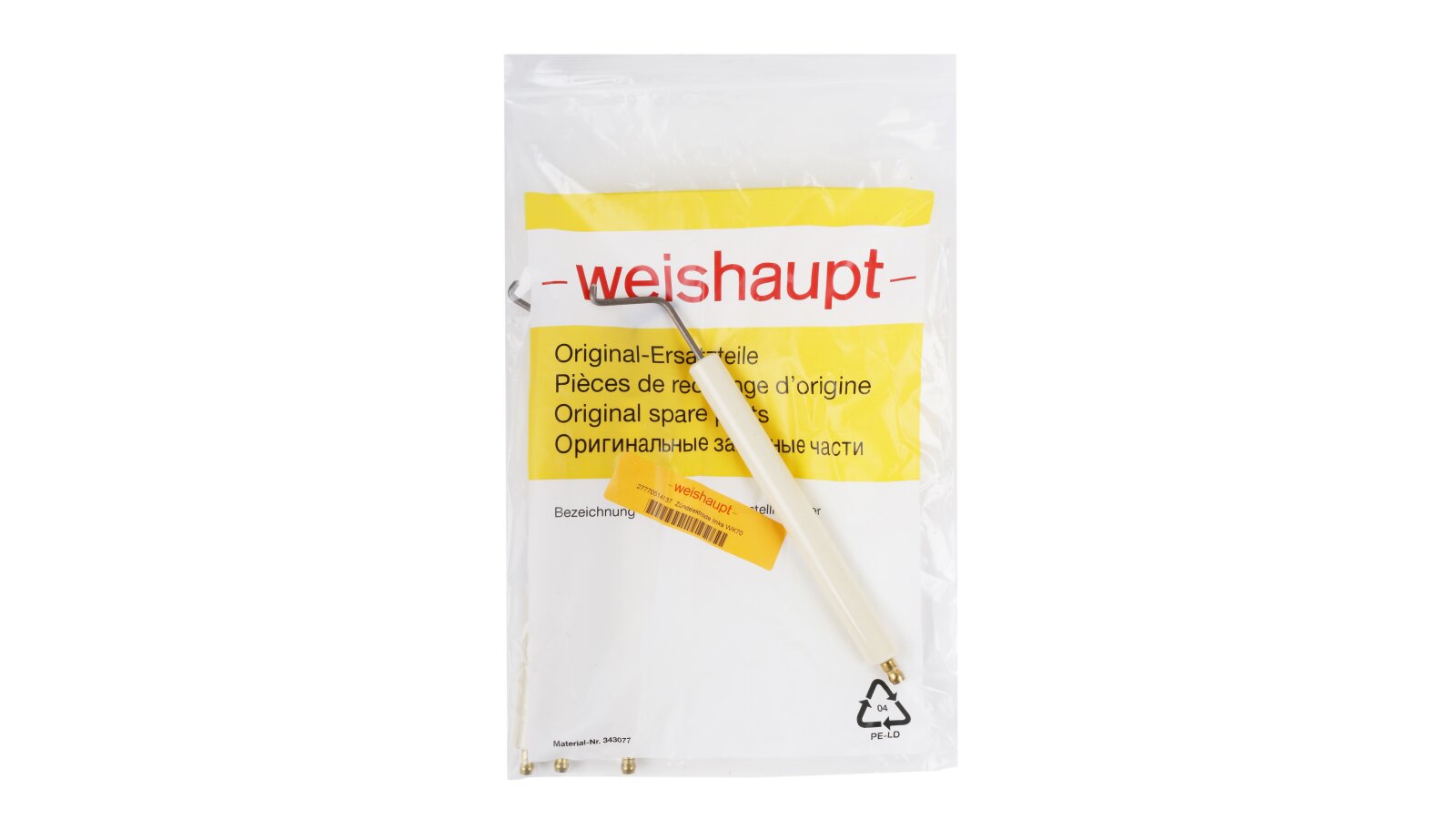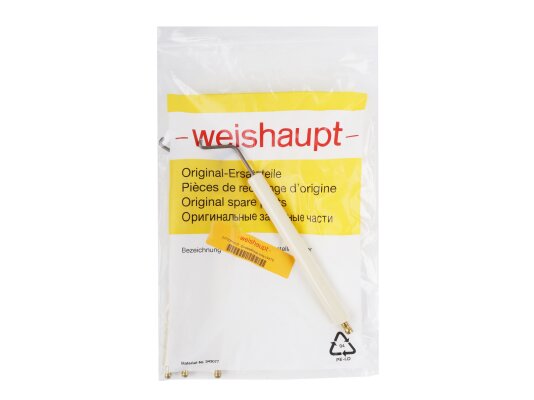 The Weishaupt ignition electrode, art. 24105010137, complies with European electrical safety standards. It is used to generate a high-voltage electric spark that ignites the fuel-air mixture. The unit consists of two electrodes placed in a common insulation housing, which securely fixes them in the optimal position to produce a spark discharge.