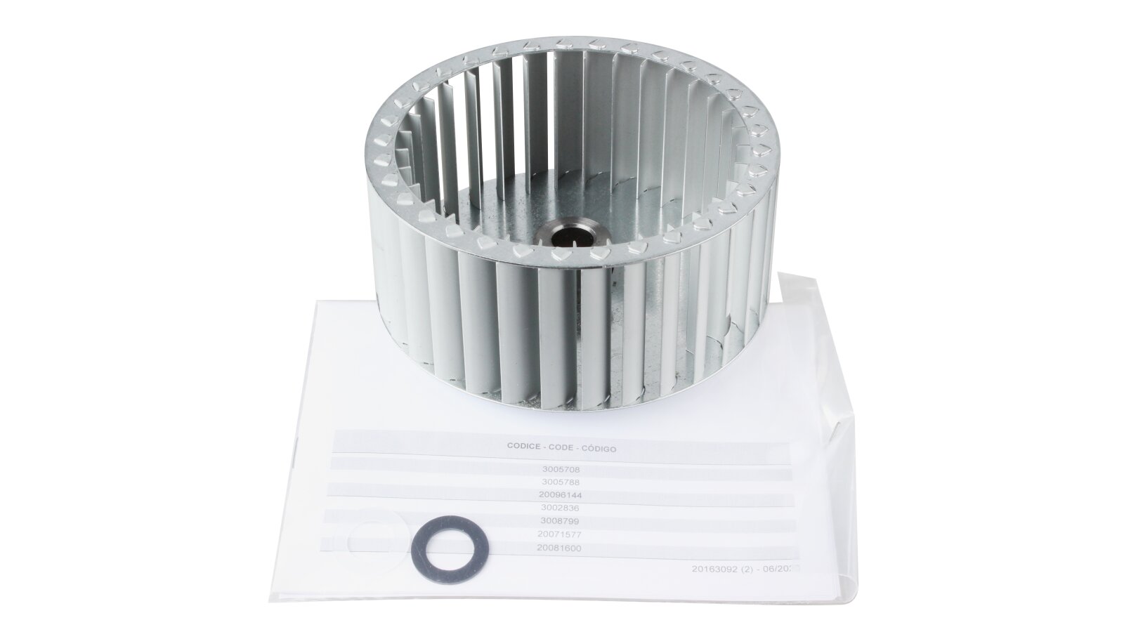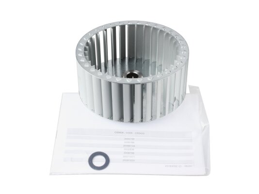 The Riello fan impeller Ø120 x 52 mm, Part Number: 3005788, is equipped with 33 blades. The impeller rotates clockwise. The product is made of wear-resistant material for long service life.