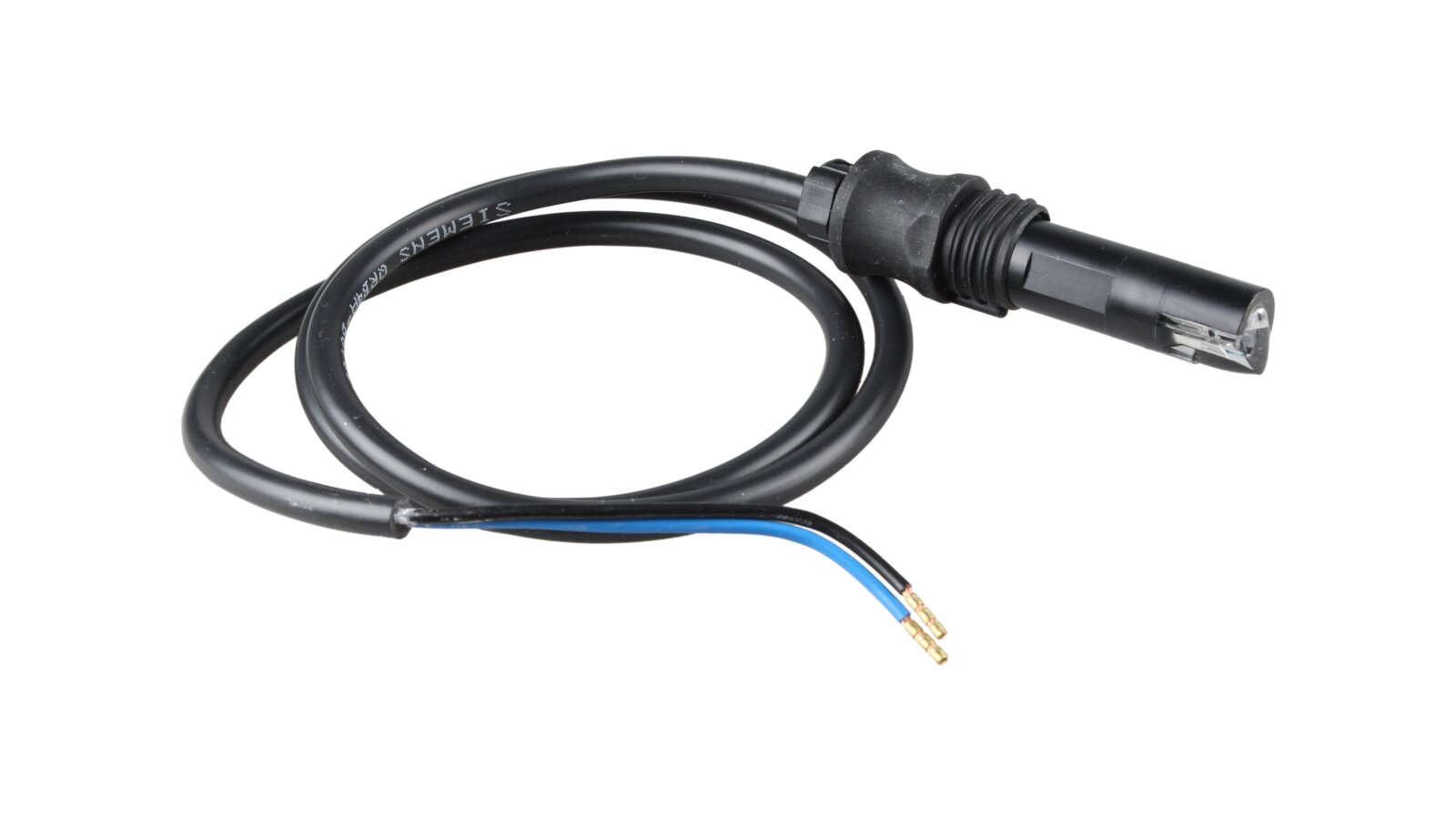 Siemens QRB4 is equipped with a compact housing, inside which a light-sensitive photodiode is located. A 2-core power cable with a heat-protective thermoplastic sheath is connected to the housing. The end of the cable is stripped, a tip is provided. The flame sensor is equipped with a soft plastic plug for mounting on the burner.