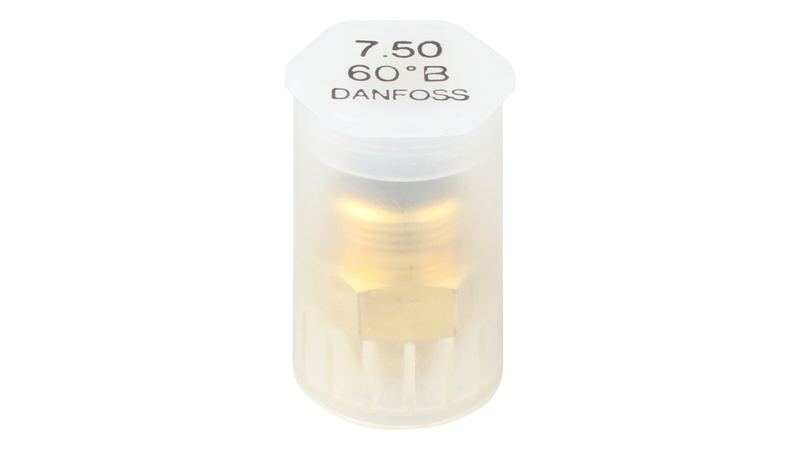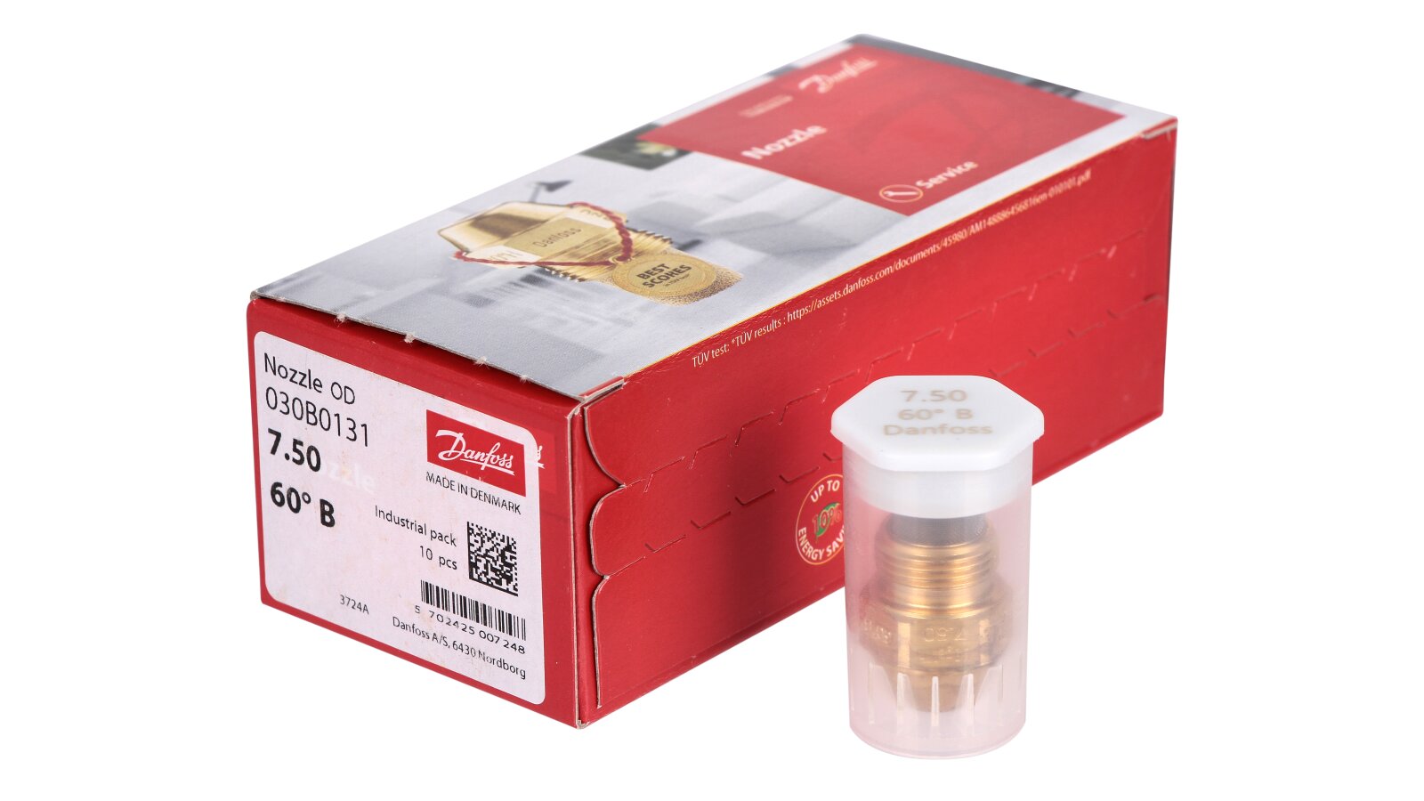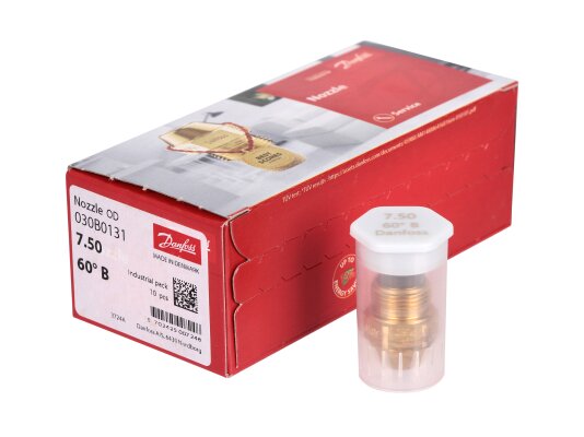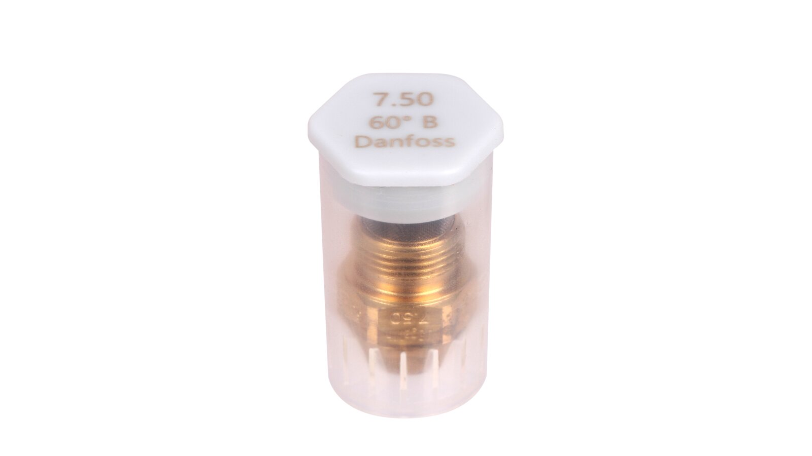 The Danfoss 7.50 / 60ºB OD nozzle art. 030B0131 with a capacity of 7.5 gph is designed to equip domestic and industrial burners. It is made in a standard version with a conical head. The nozzle body contains a swirl, spray, mesh filter, and seal. The filter is made of monel metal, holds impurities of 140 µm, protecting the nozzle from clogging. Spray type B (semi-solid). A 16 mm key is used for installation. Connection parameters 9/16"-24UNEF-2A. We offer to buy a Danfoss OD nozzle and other spare parts for equipping burners.