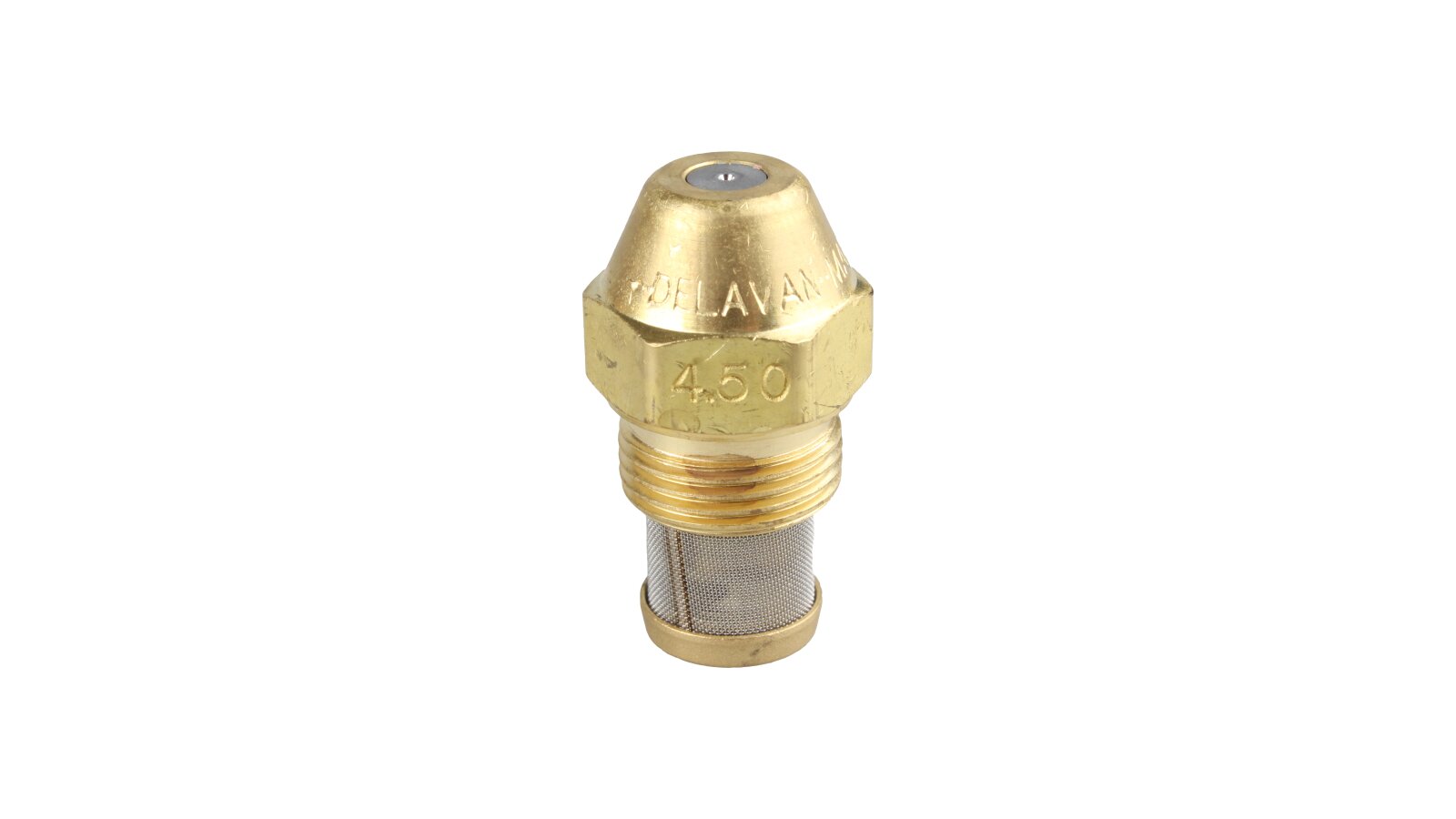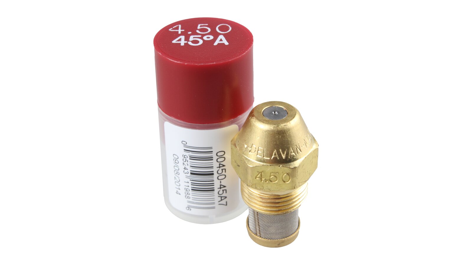 The Riello 4.50/45° A nozzle atomizes fuel with a cone angle of 45°, which is optimal for burning fuel in long and narrow combustion chambers. When working with high-viscosity fuel, the jet narrows, which is corrected by increasing the pressure. The nozzle is designed for use in household and industrial burners with forced air supply and low flow rates.