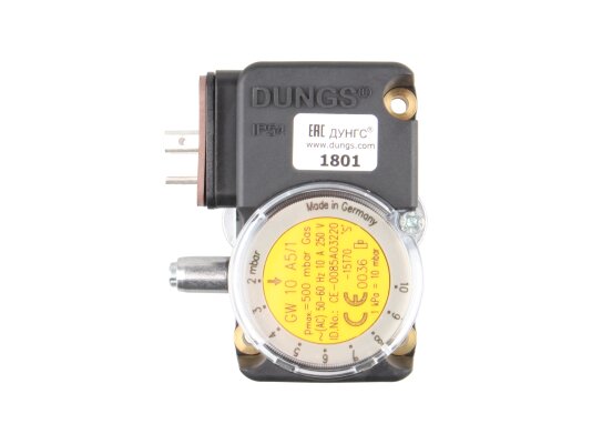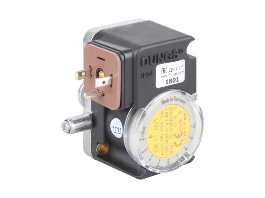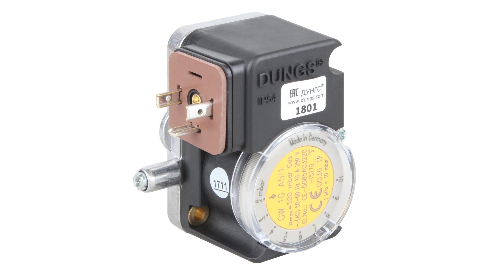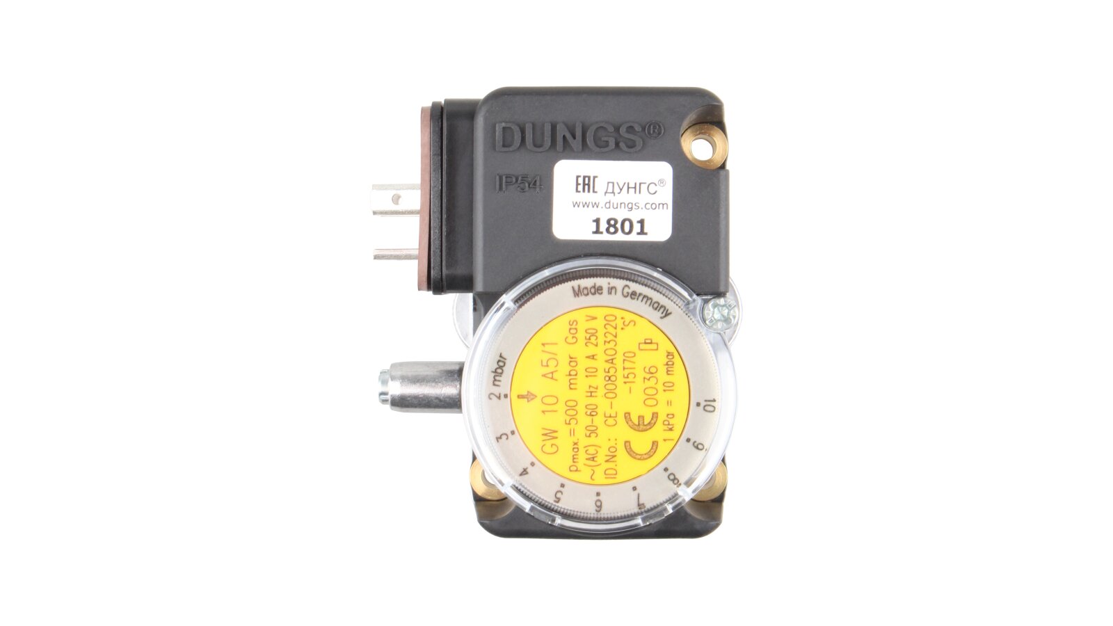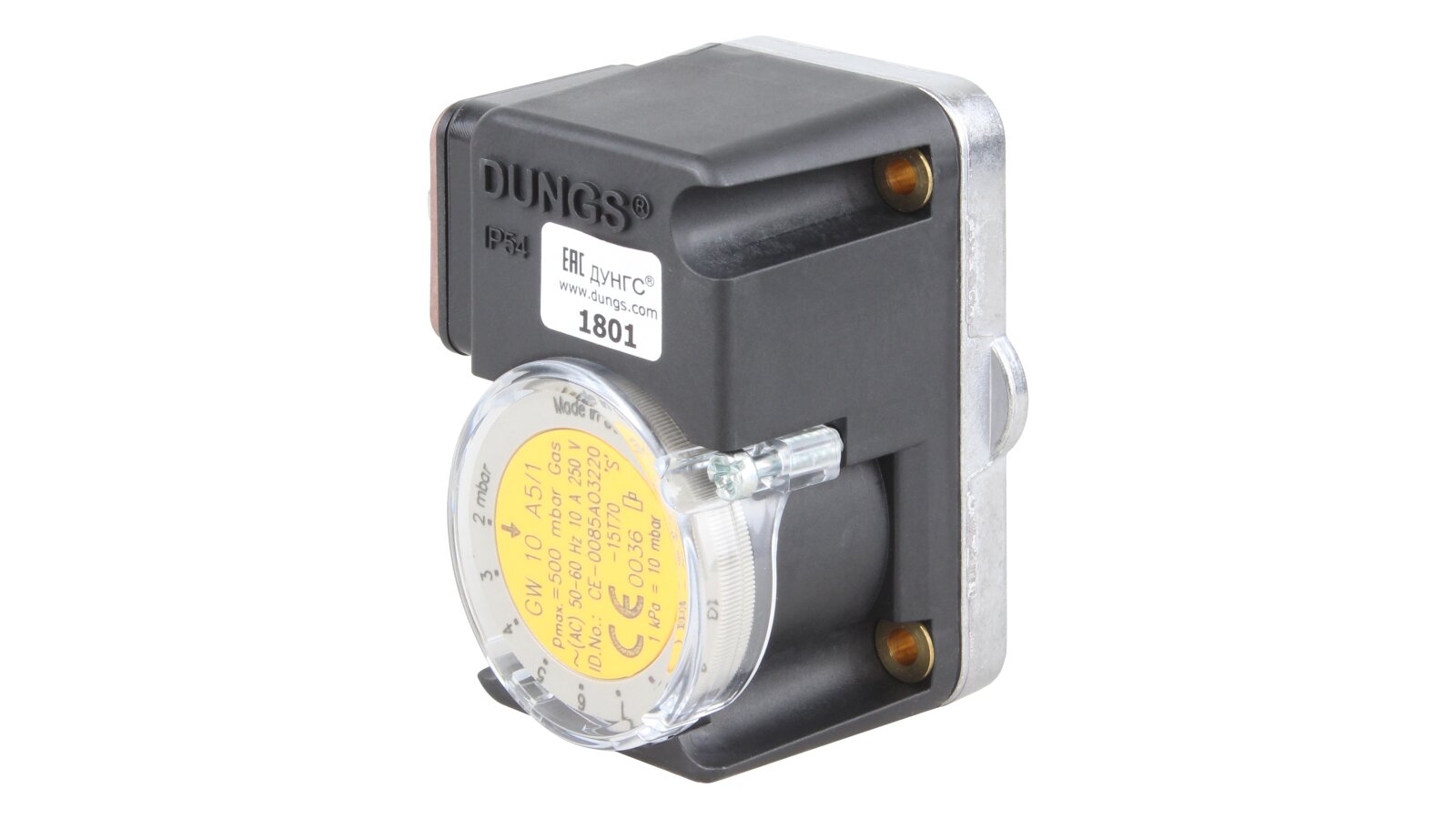 The Dungs GW 10 A5/1 pressure switch, art: 241245, is designed for systems operating on air, non-flammable and non-aggressive gases. The device is designed for a pressure of 0.5 bar. It is built into boiler equipment, heat-generating, ventilation devices. It is responsible for monitoring the pressure of the working environment. It is characterized by compact dimensions, precise response, a wide range of operating temperatures, and ease of installation.