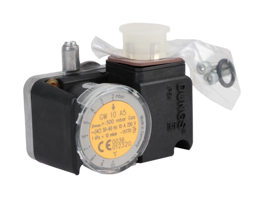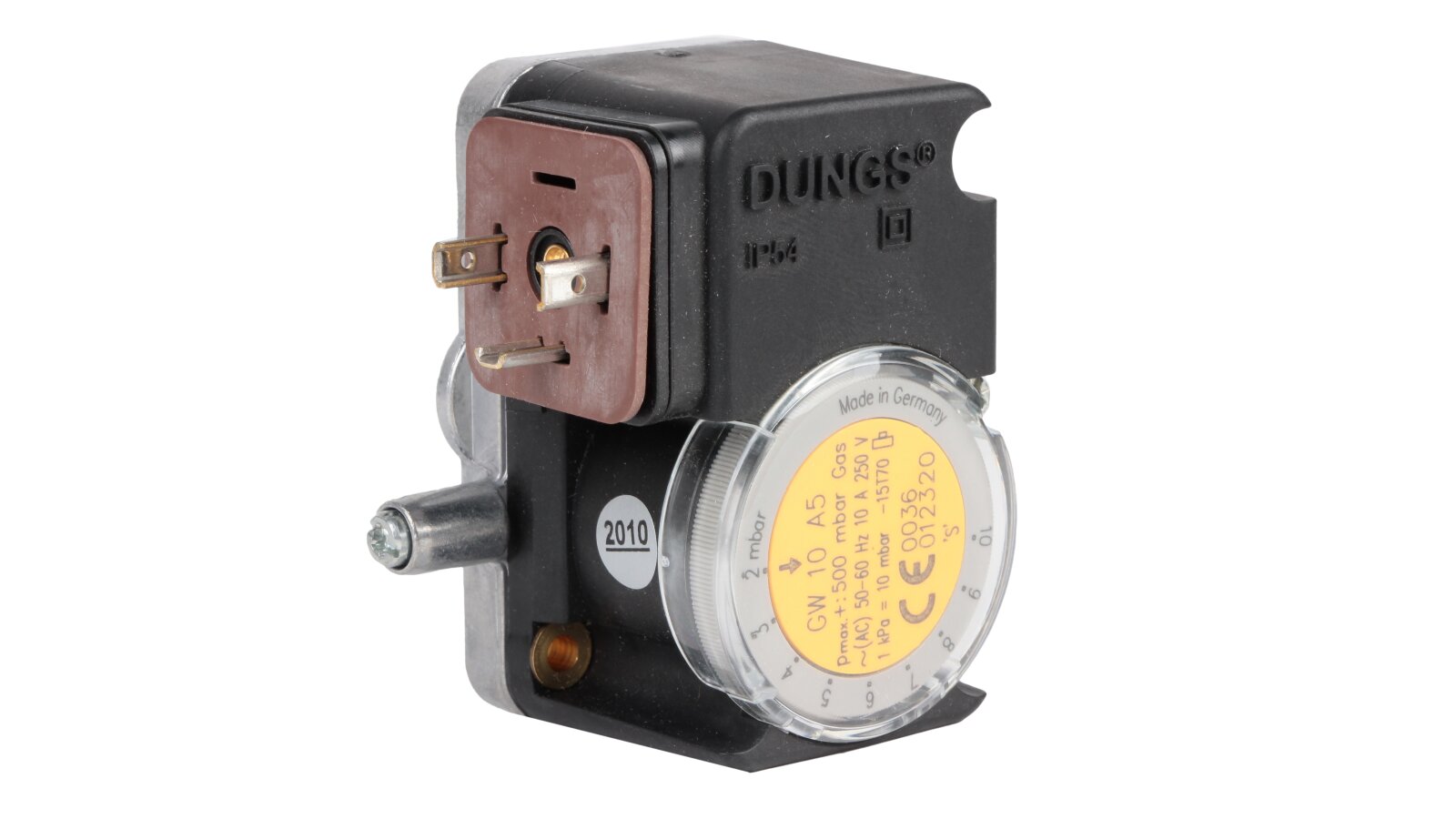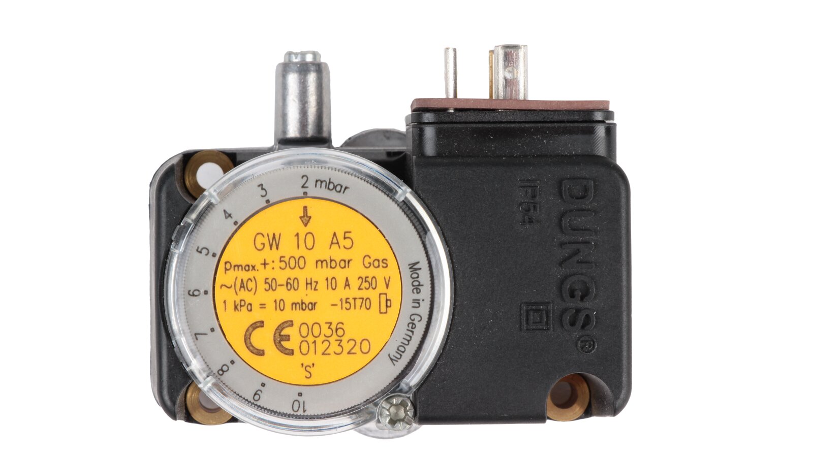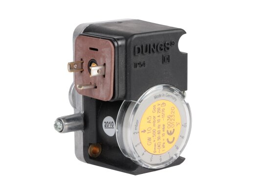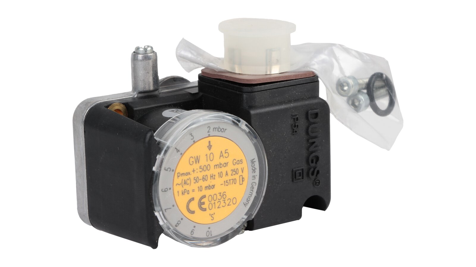 The Dungs GW 10 A5 gas pressure switch is used to equip combustion units with a maximum pressure of 500 mbar. The device is manufactured in accordance with EU standards and has a certificate of conformity according to EN 1854. The sensor switches the circuit on, off or toggles it to a certain pressure value when the actual pressure changes. The relay is used to monitor excess pressure/vacuum pressure.