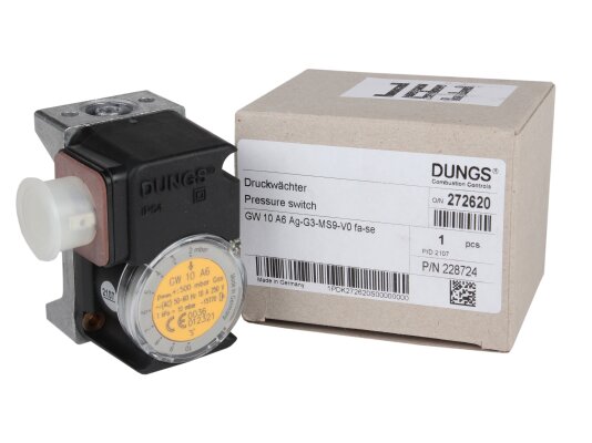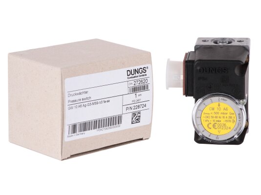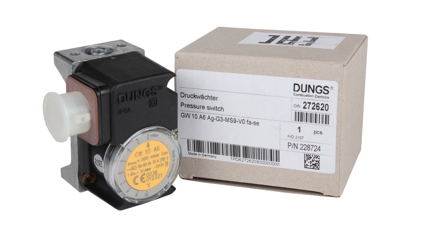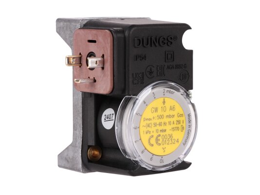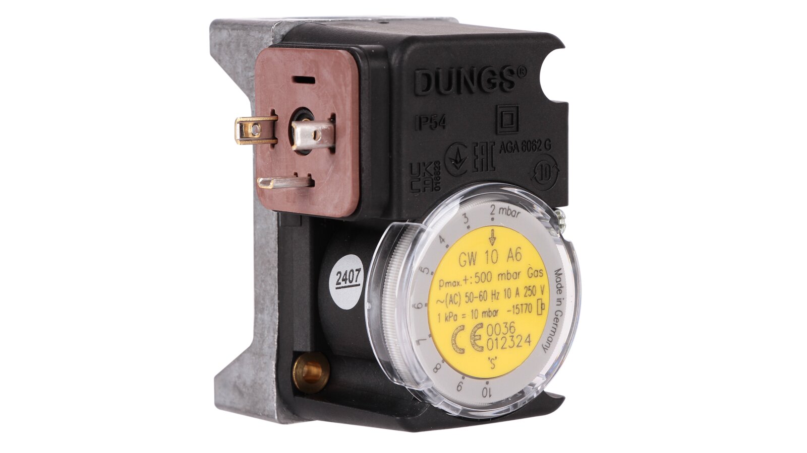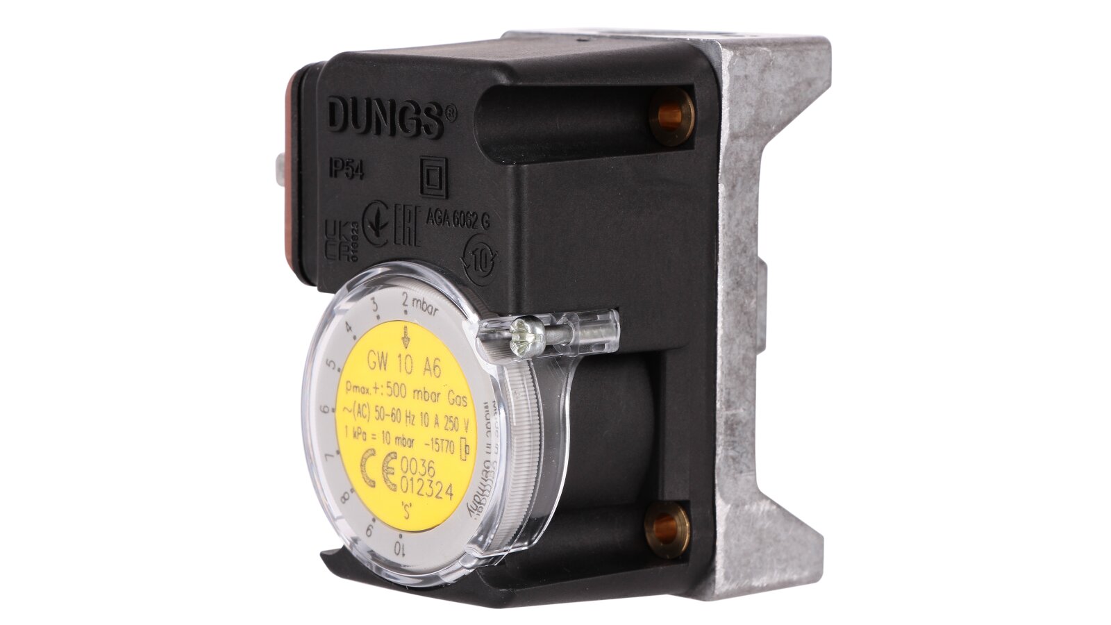 The Dungs GW 10 A6 gas pressure switch, article 272620, is designed to equip gas installations with a pressure of no more than 500 mbar to monitor excess pressure/vacuum pressure. The sensor is equipped with a reliable switching system, has a compact design and is easy to install. Made according to the EN 1854 standard.