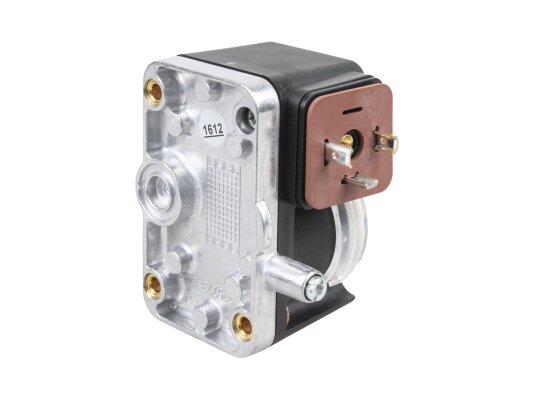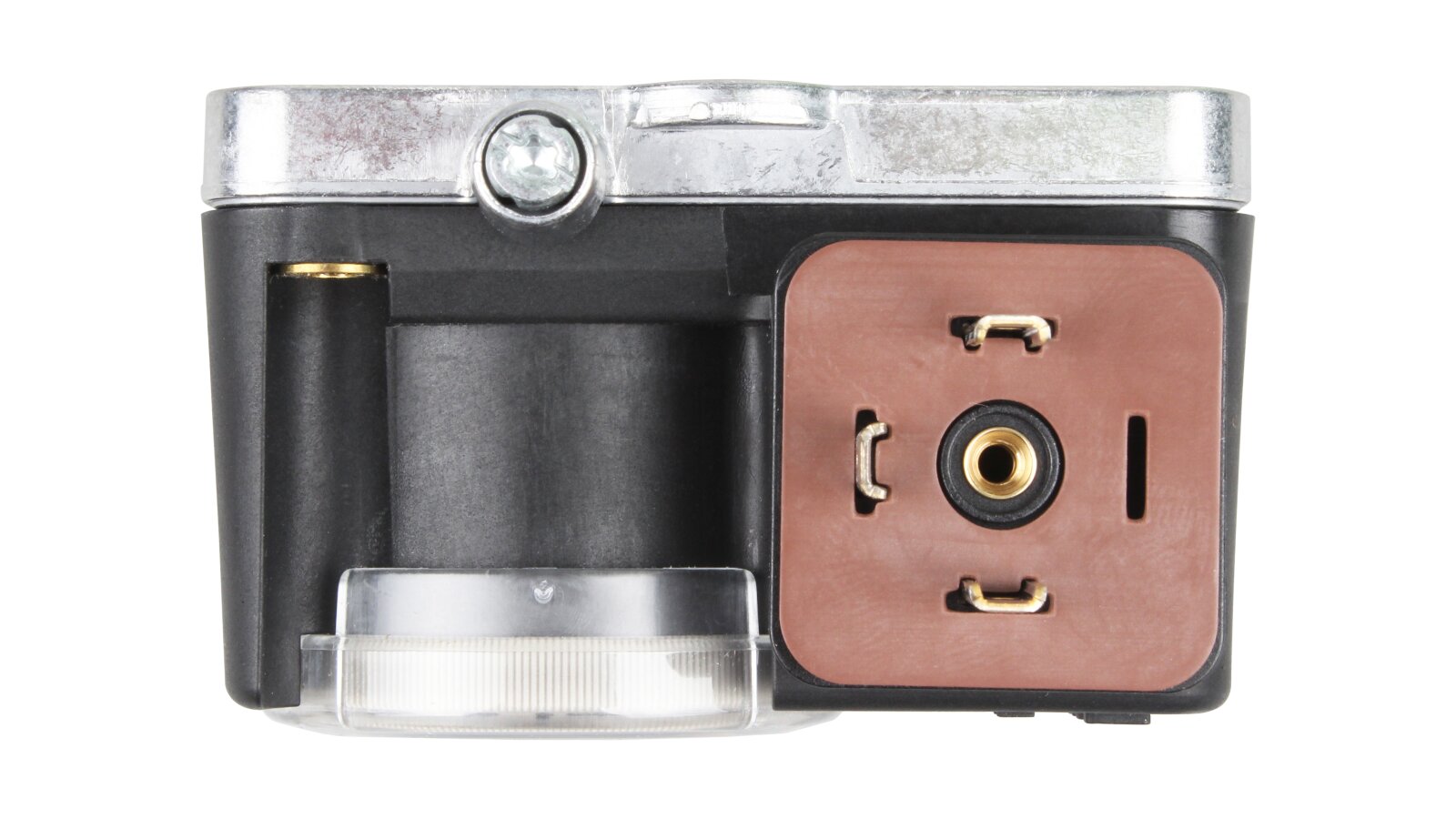 The microswitch of the sensor-relay responds to pressure changes. It operates accurately at external temperatures of -15...+70 °C. The relay can be mounted in any position. If the orientation deviates from the recommended (vertical) orientation, the sensor will operate at a pressure higher or lower than the set value. Fixing screws (M4 x 20 mm) and a ring gasket Ø10.5x2.25 mm are used for mounting on the gas valve.