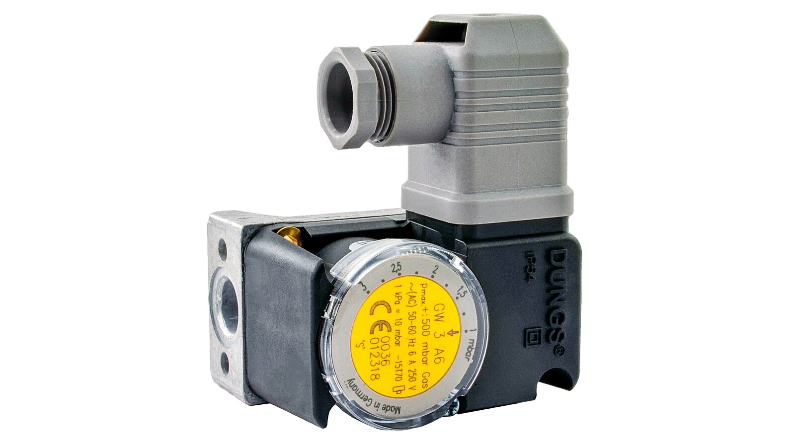 The Dungs GW 3 A6 1P gas pressure switch is a compact adjustable switch used in the automatic vacuum and excess pressure control system of the combustion unit. The device complies with EN 1854. It is characterized by a short response time when the pressure value deviates. The maximum pressure in the system is 500 mbar. The kit includes a cable socket.