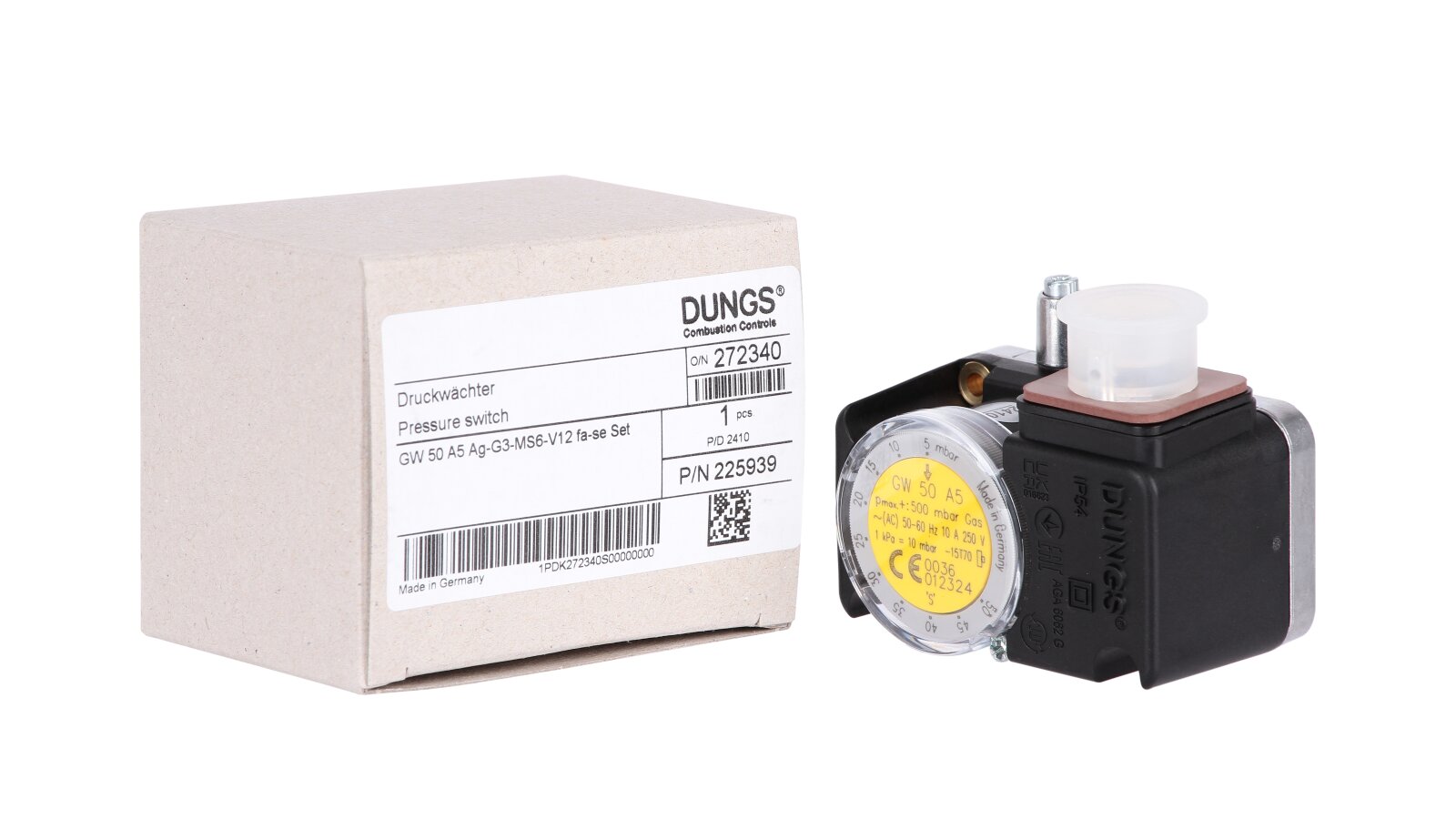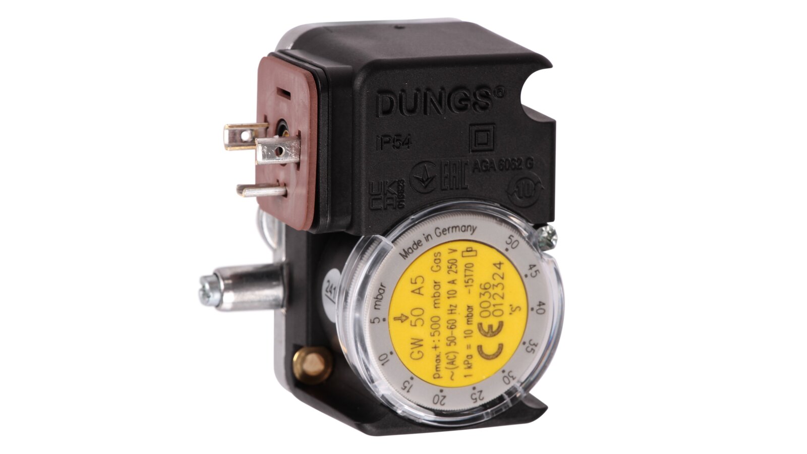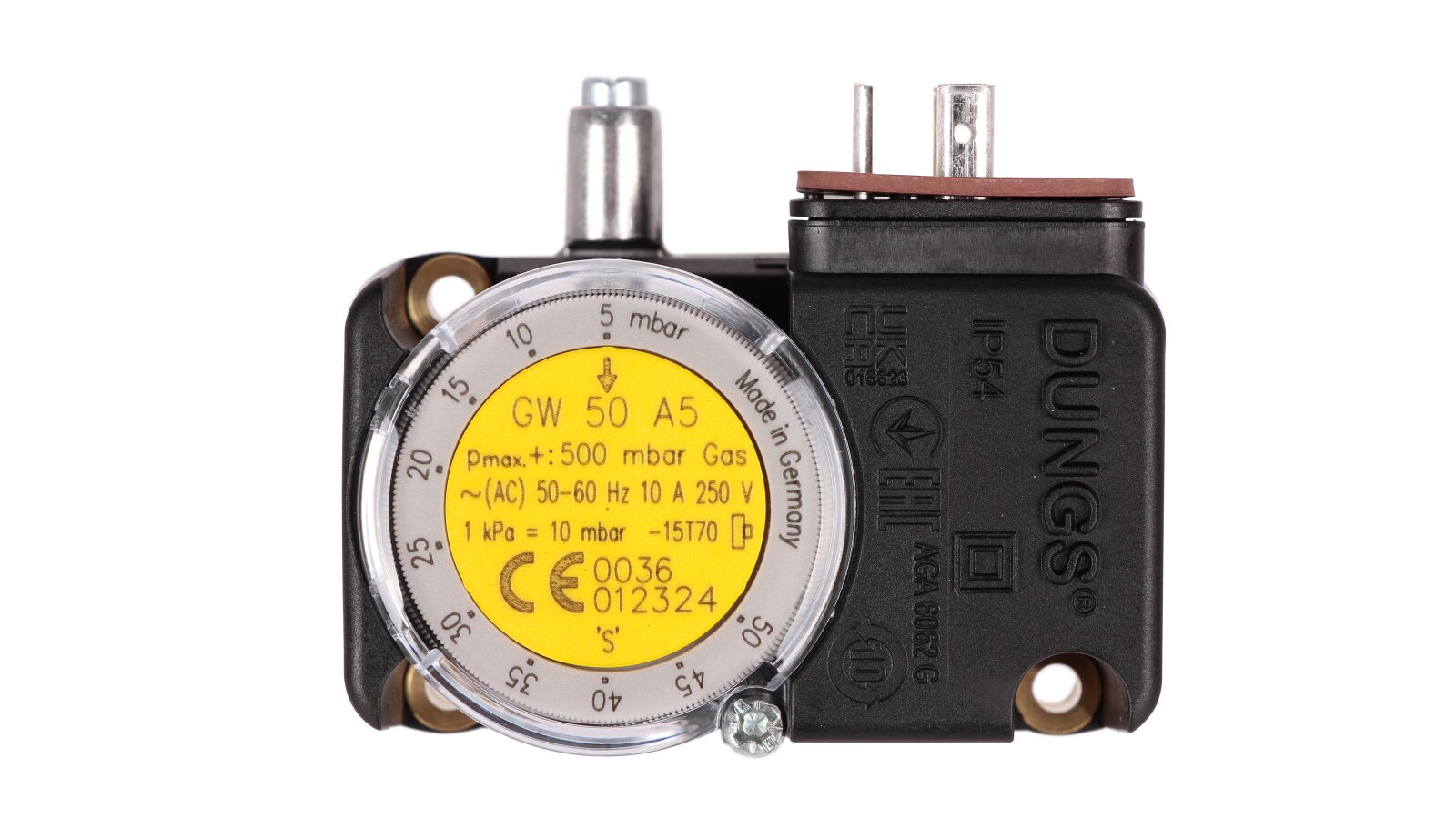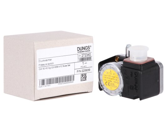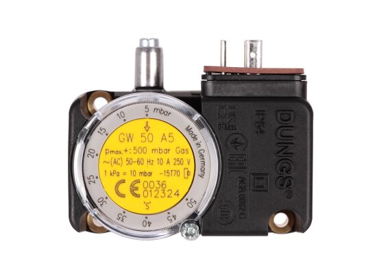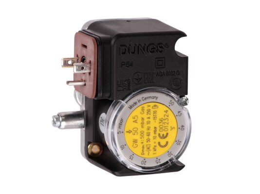 The Dungs GW 50 A5 gas pressure switch is a device for automatic gas burner systems. It is used to control excess gas pressure. It operates on the principle of an electrical network switch. The sensor is made in accordance with EU standards and has a certificate of conformity according to EN 1854.