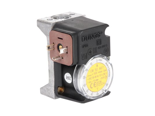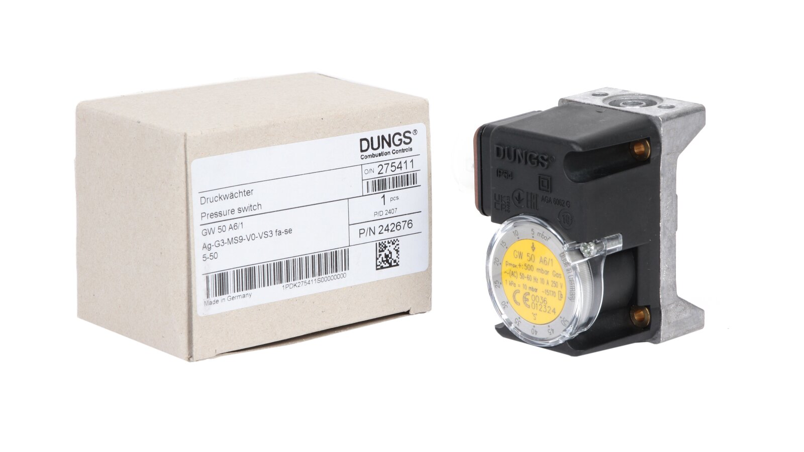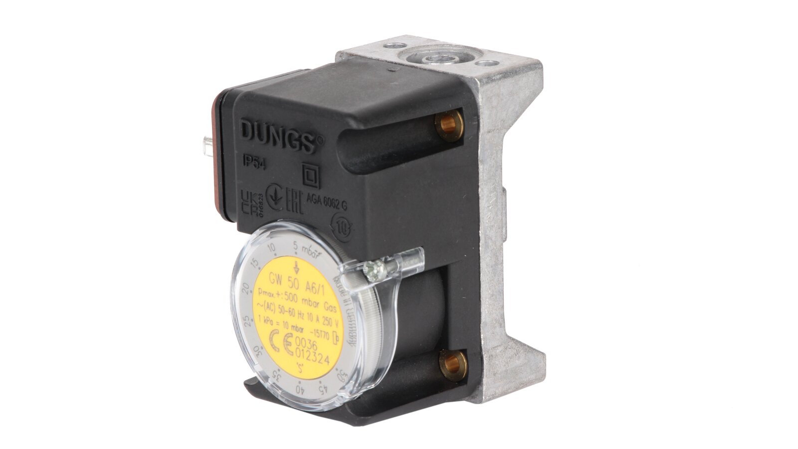 The Dungs GW 50 A6/1 pressure switch is built into gas/air supply control systems when operating various industrial installations. It is responsible for monitoring excess pressure and vacuum pressure. The advantages are an adjustable response point, compact dimensions, a wide range of applications, and reliable design. The sensor is tested and certified according to EU standards. It corresponds to class "S" according to EN 1854.